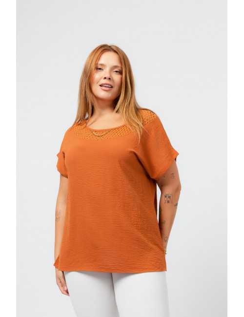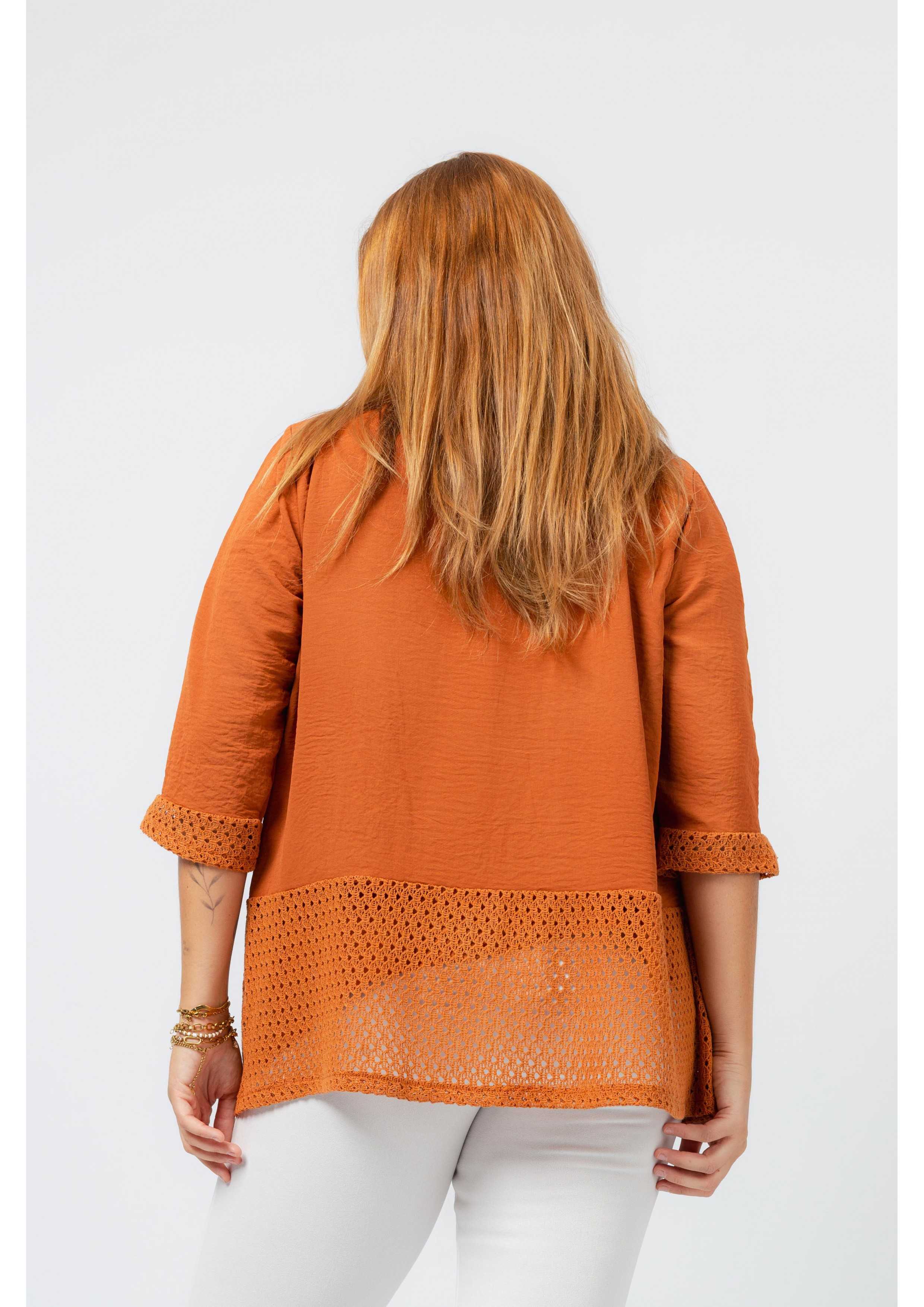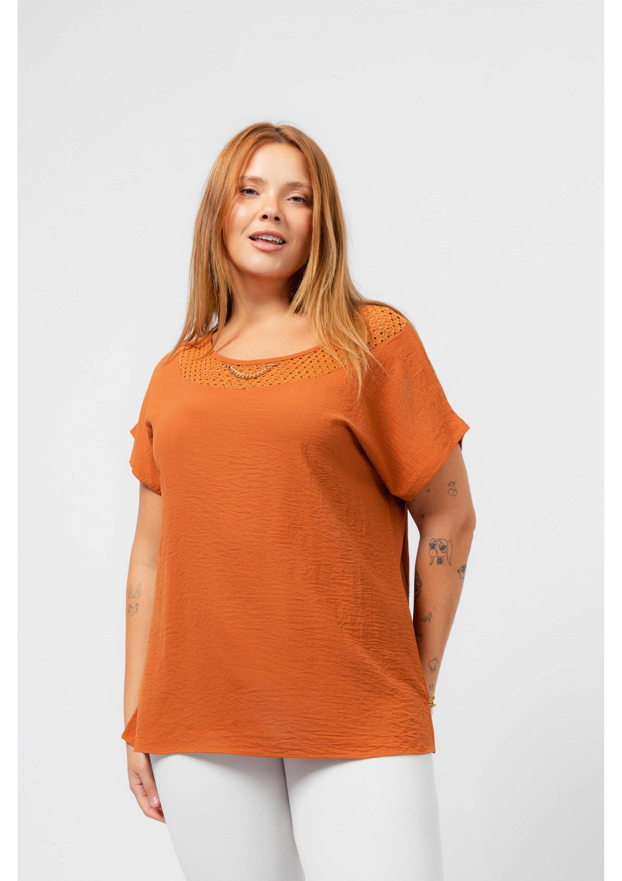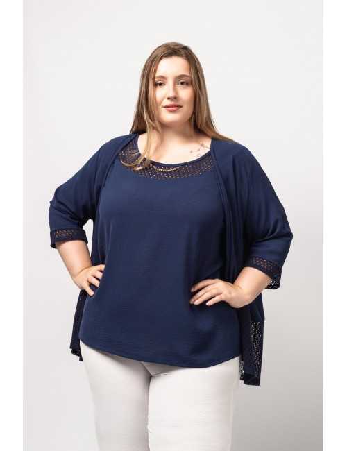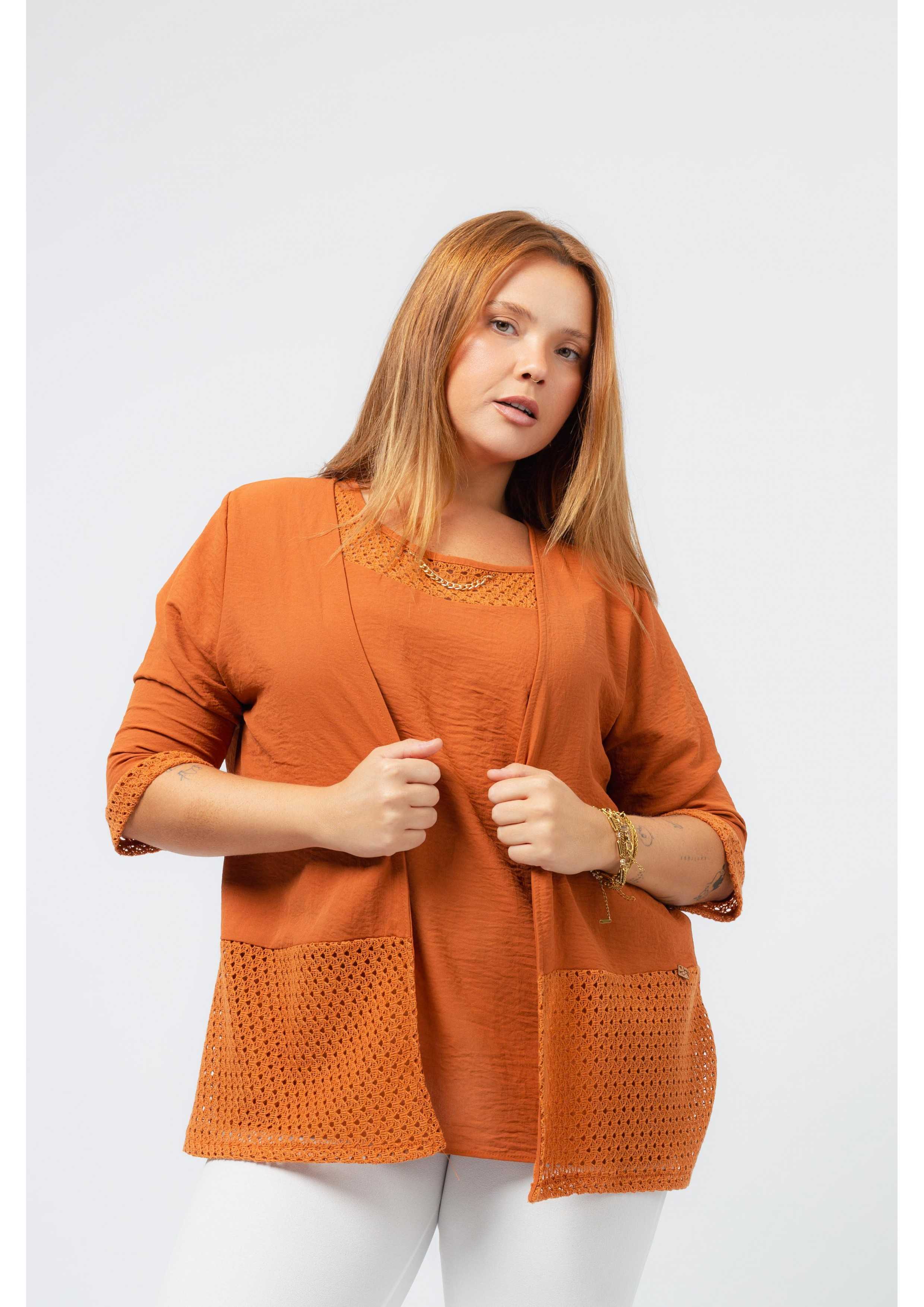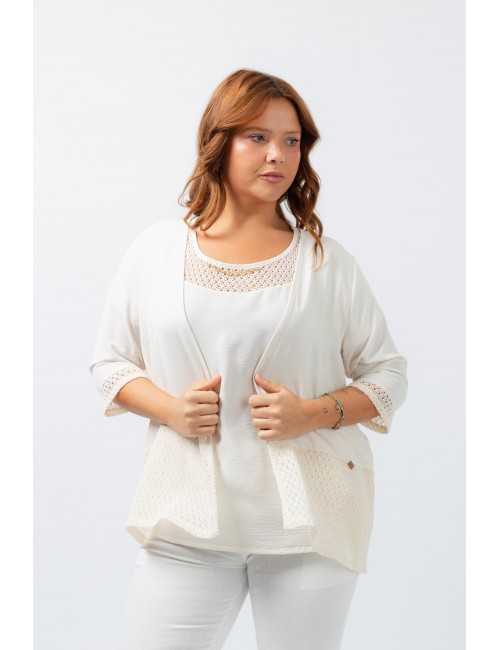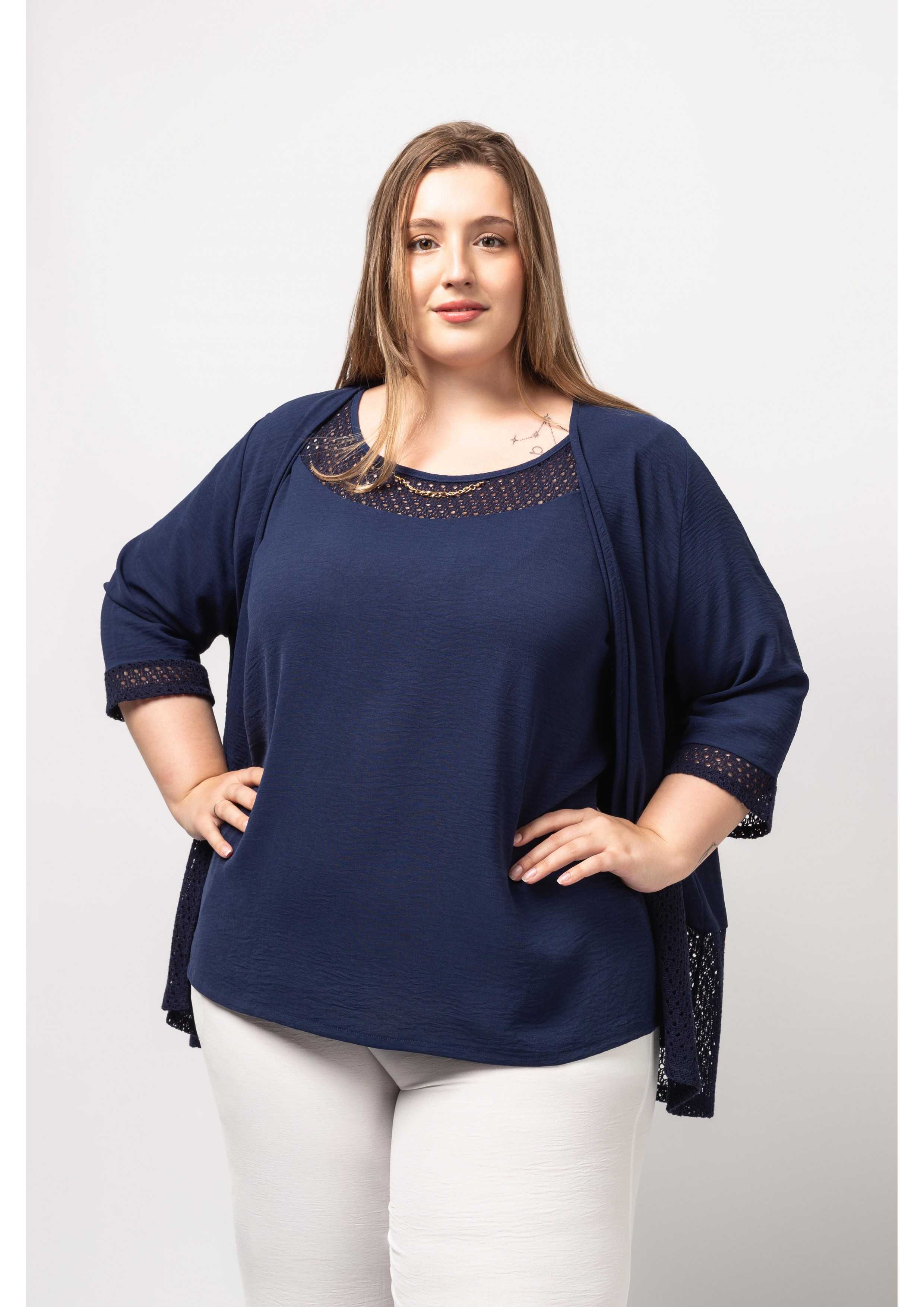 Ensemble en tissu uni. Débardeur à épaule dénudée, avec insertion en dentelle au décolleté et applique doré, fentes latérales. Veste à manches 3/4 avec poignet en dentelle, insertion en bas également en dentelle, coupe droite. Collection : Printemps Été Modèle 1 : Taille 1,80m et porte la taille 4XL Modèle 2 : Taille 1,70m et porte la taille XL