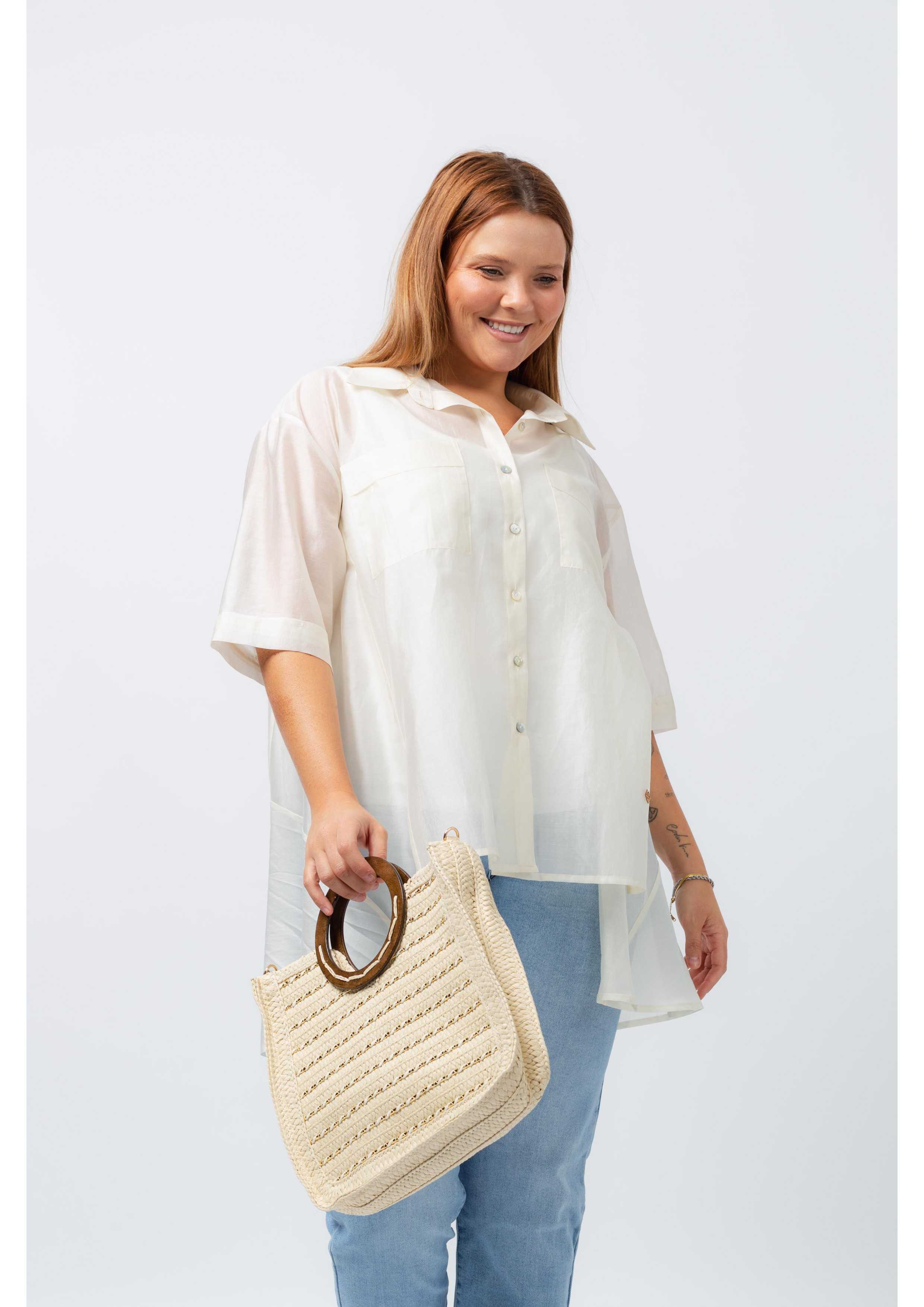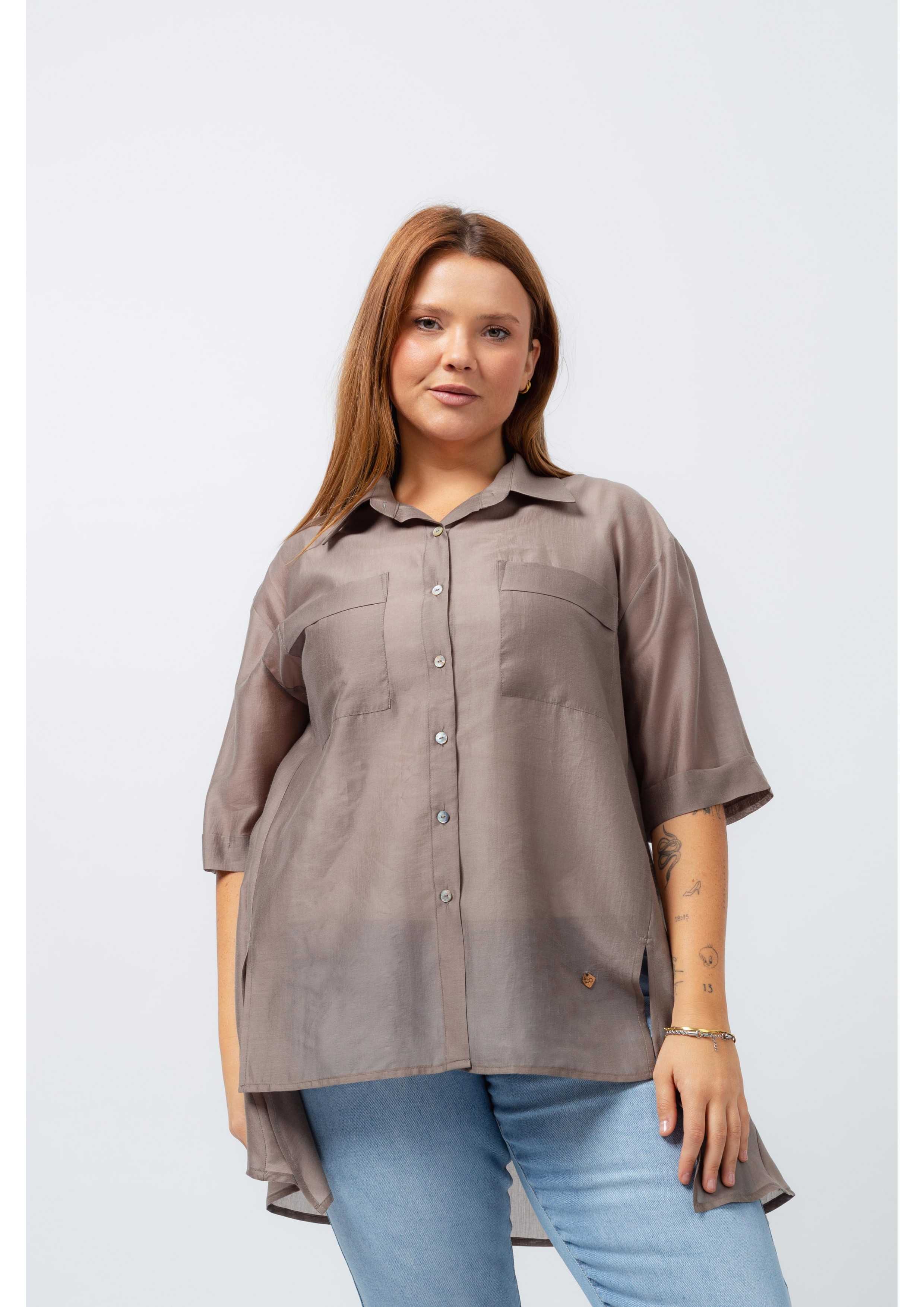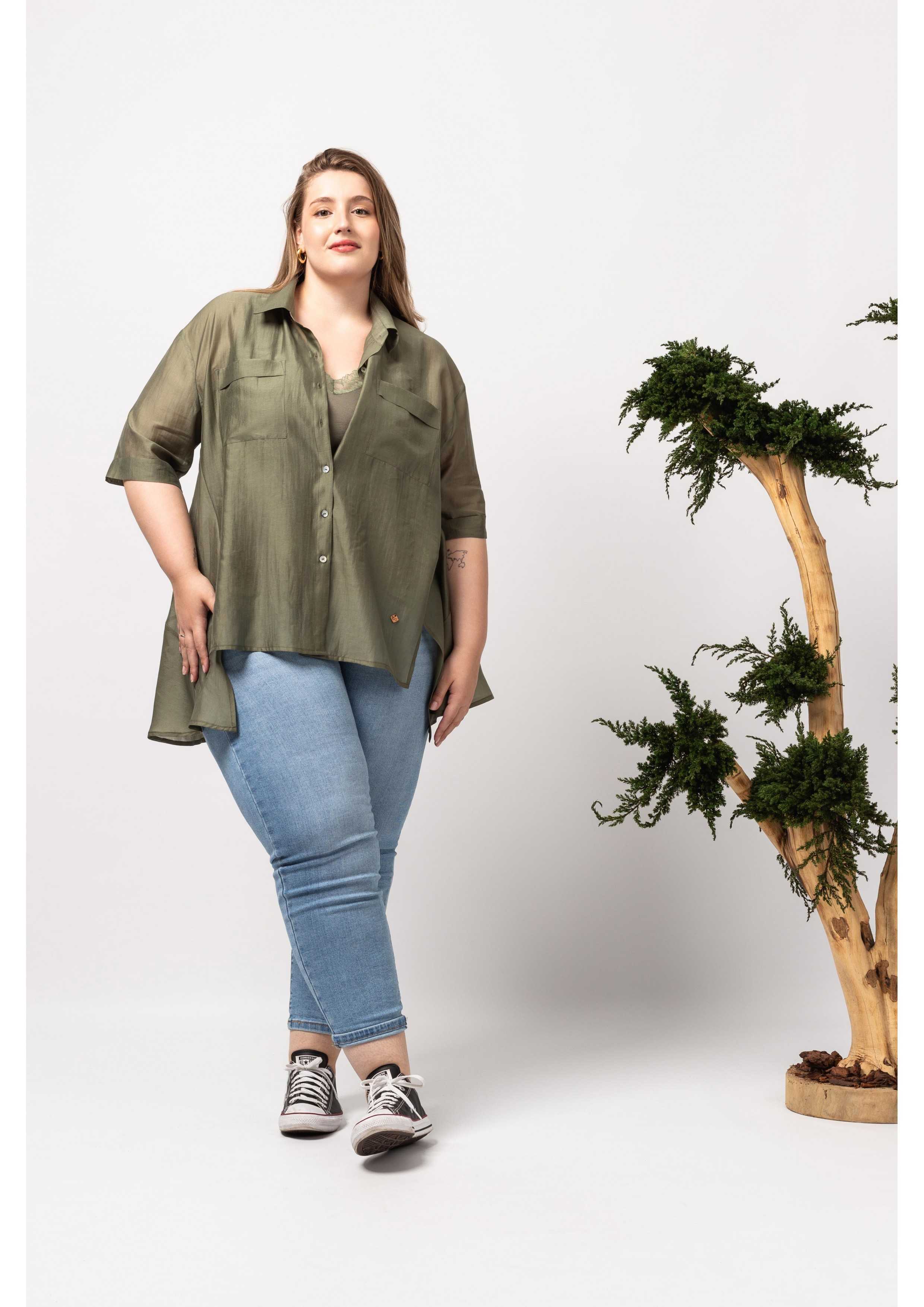 Blouse en tissu uni, manches courtes avec poignets appliqués, Poches à rabat sur la poitrine. Finitions latérales, modèle évasé. Échappe avec une sangler à l'arrière. Collection : Printemps Été Modèle 1 : Taille 1,80 m et porte la taille 4XL Modèle 2 : Taille 1,70 m et porte la taille XL