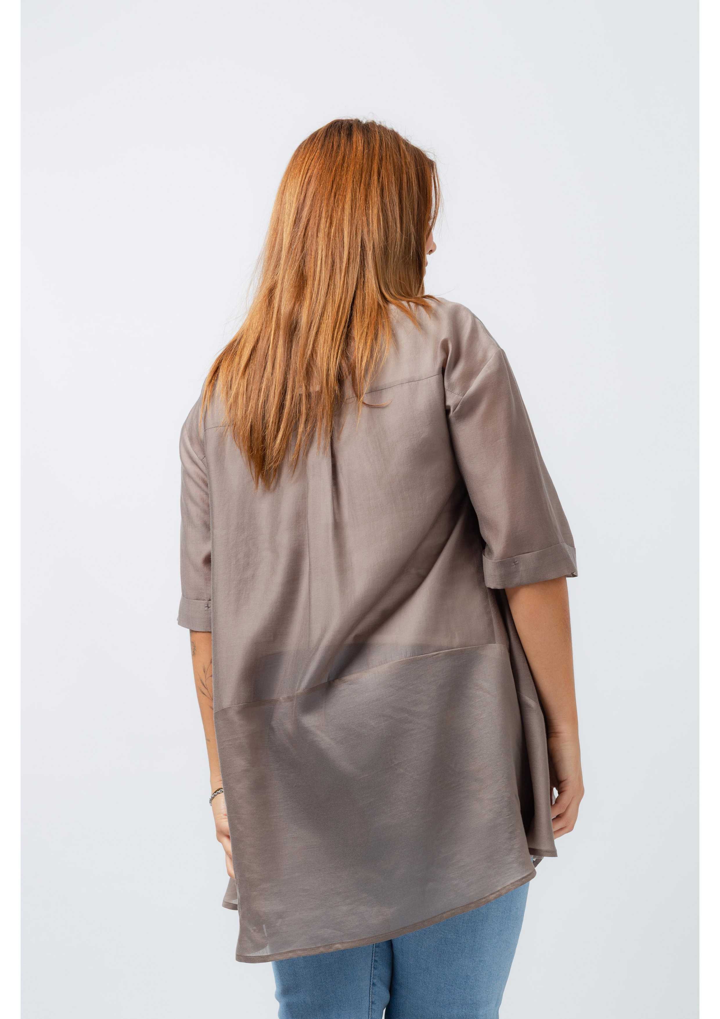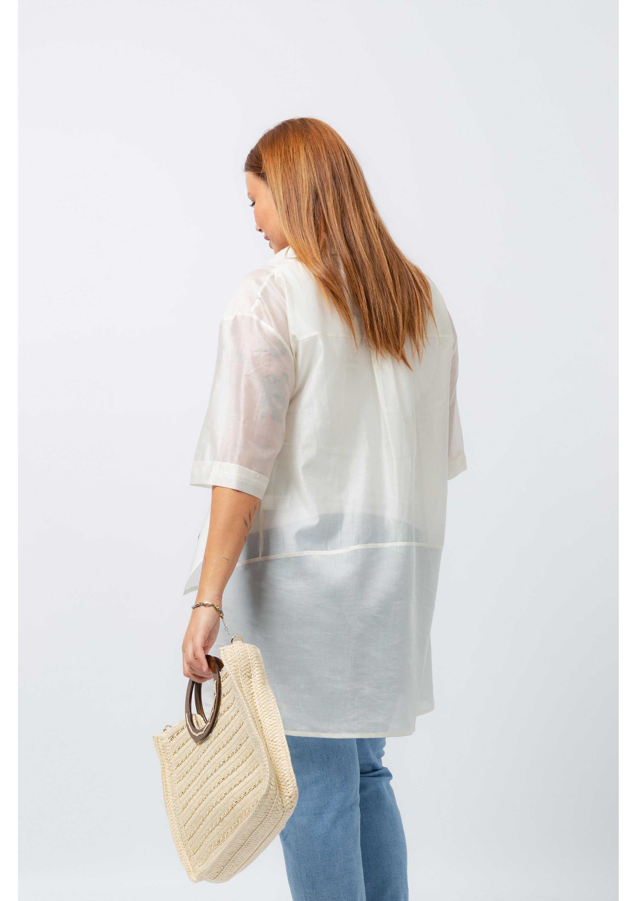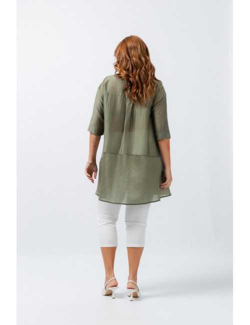 Blouse en tissu uni, manches courtes avec poignets appliqués, Poches à rabat sur la poitrine. Finitions latérales, modèle évasé. Échappe avec une sangler à l'arrière. Collection : Printemps Été Modèle 1 : Taille 1,80 m et porte la taille 4XL Modèle 2 : Taille 1,70 m et porte la taille XL