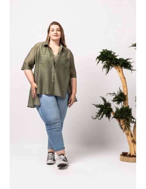 Blouse en tissu uni, manches courtes avec poignets appliqués, Poches à rabat sur la poitrine. Finitions latérales, modèle évasé. Échappe avec une sangler à l'arrière. Collection : Printemps Été Disponible en Grandes Tailles Produit de conception et de fabrication propres. Nous sommes une marque de confection de vêtements avec plus de 50 ans d'expérience Modèle : Taille 1,70 m et porte la taille XL. Composition : 84% Lyocell 16% Polyester