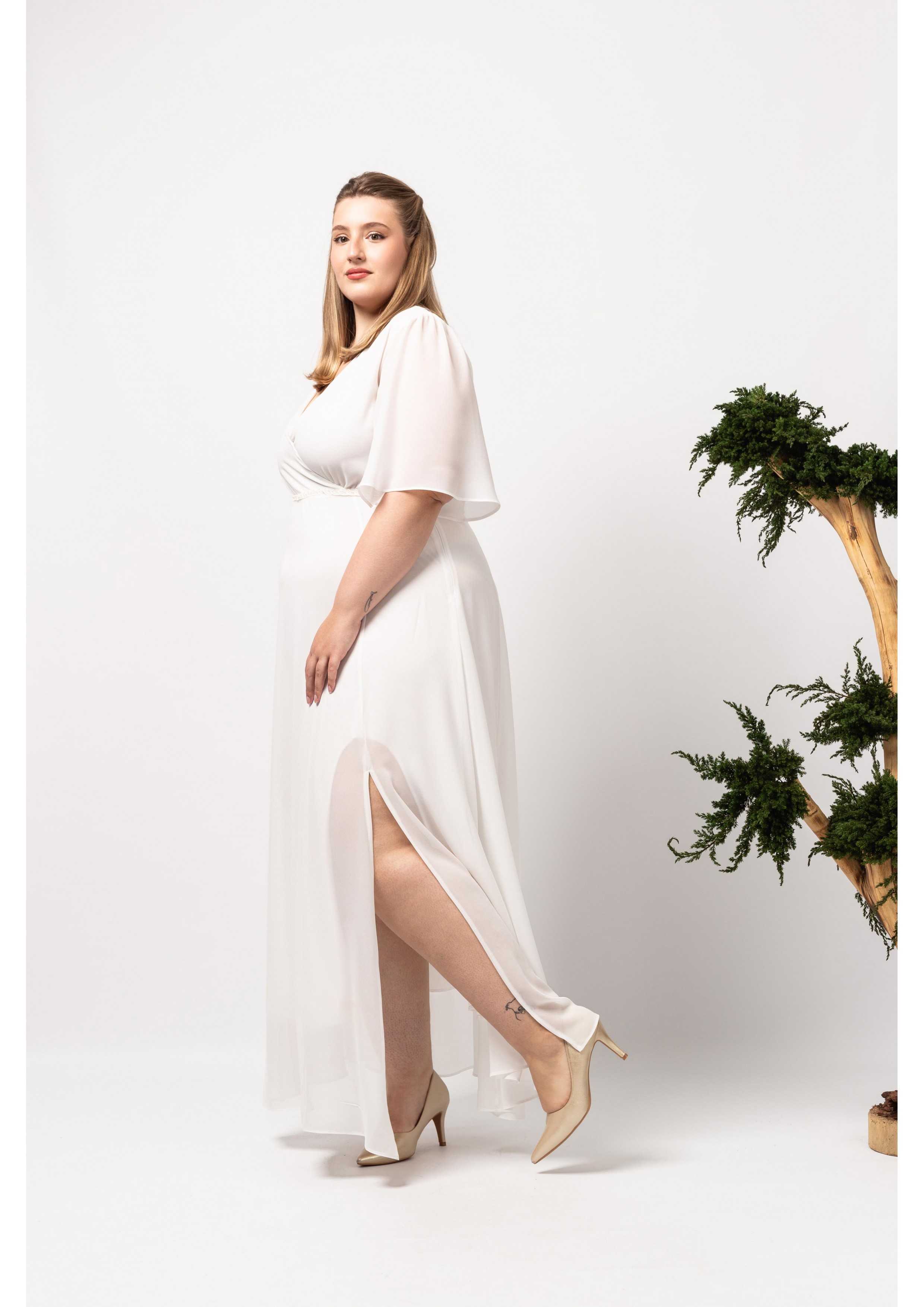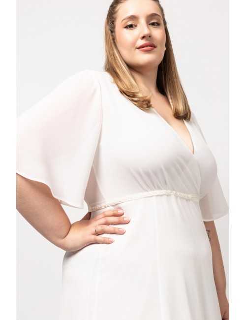 Robe en tissu uni. Décolleté en cache-coeur, jupe longue et évasée. Fente sur le côté avant. Manches courtes effet cloche. Application au décolleté avec un ruban de perles. Collection : Printemps Été Disponible en Grandes Tailles Produit conçu et fabriqué en propre. Nous sommes une marque de confection de vêtements avec plus de 50 ans d'expérience Modèle : Hauteur 1.80m et porte la taille 3XL. Composition : 100% Polyester|DOUBLURE 94% Polyester 6% Élastane