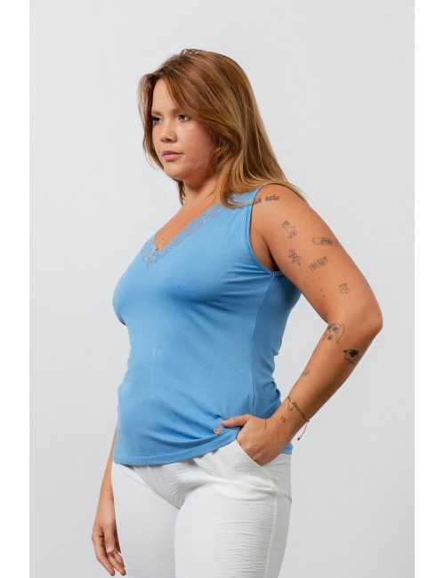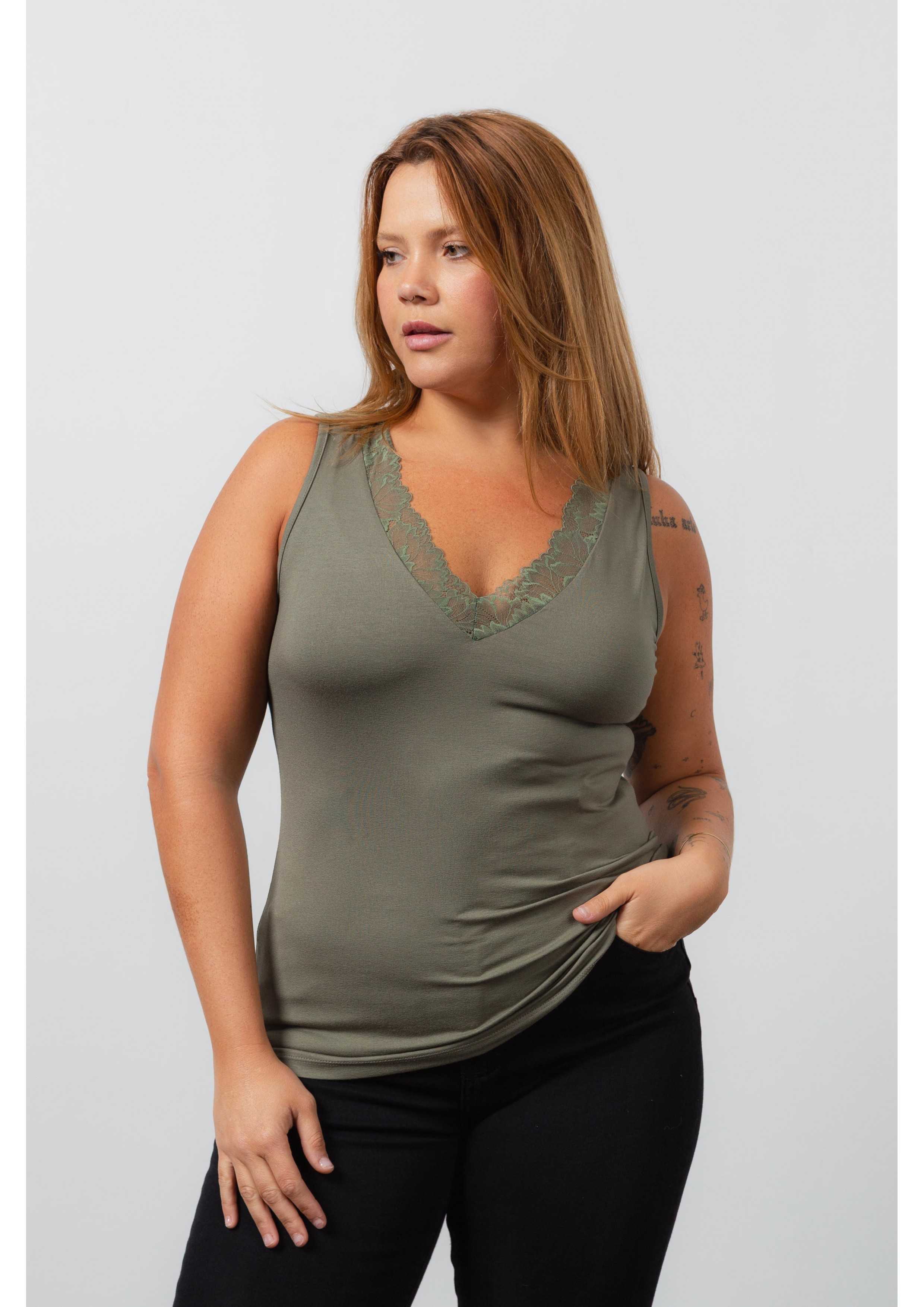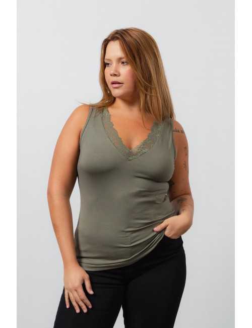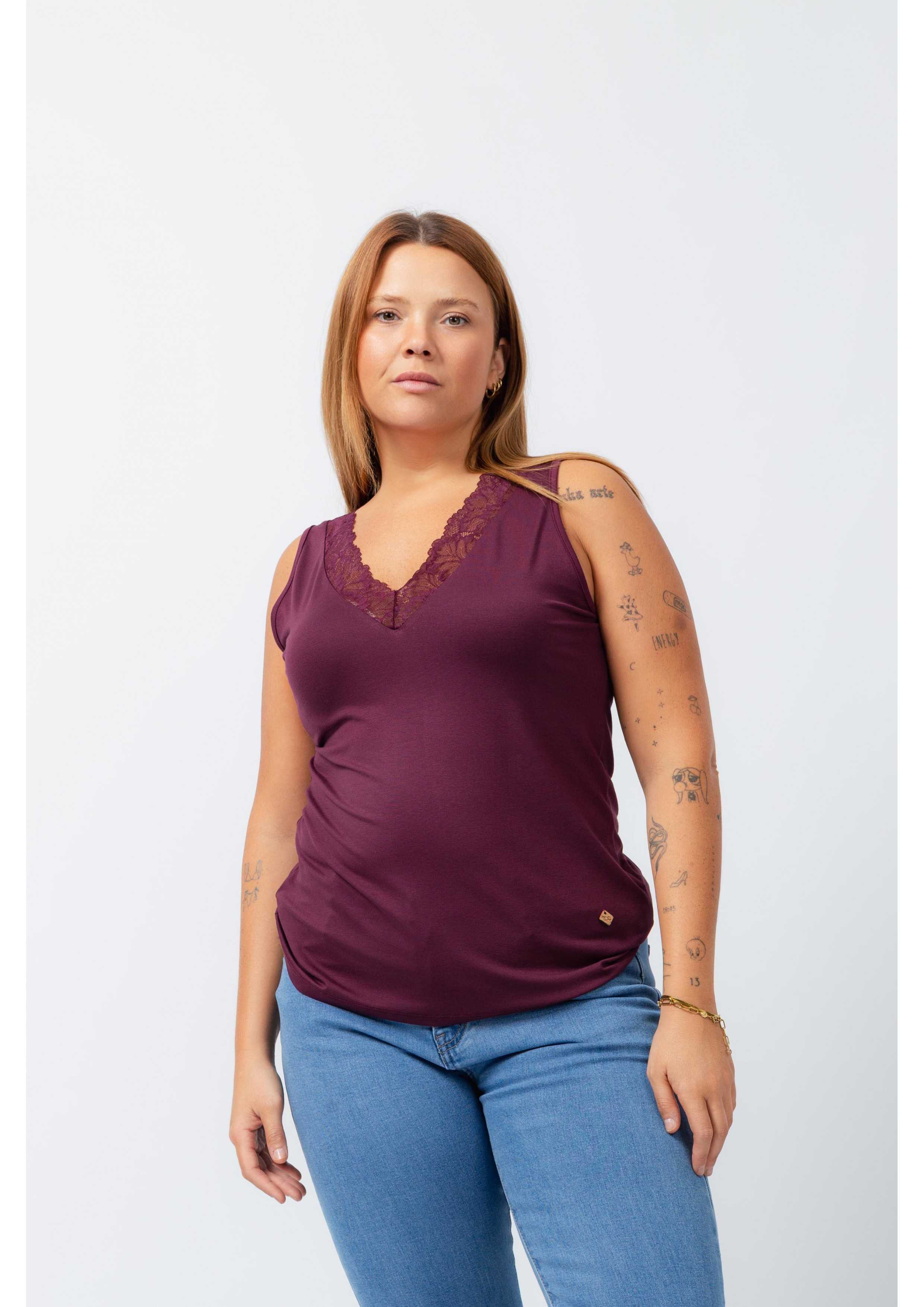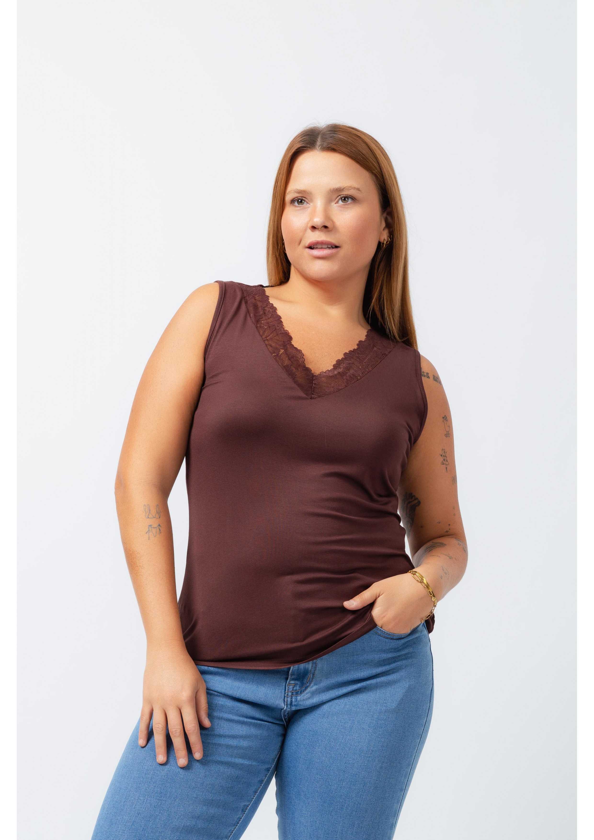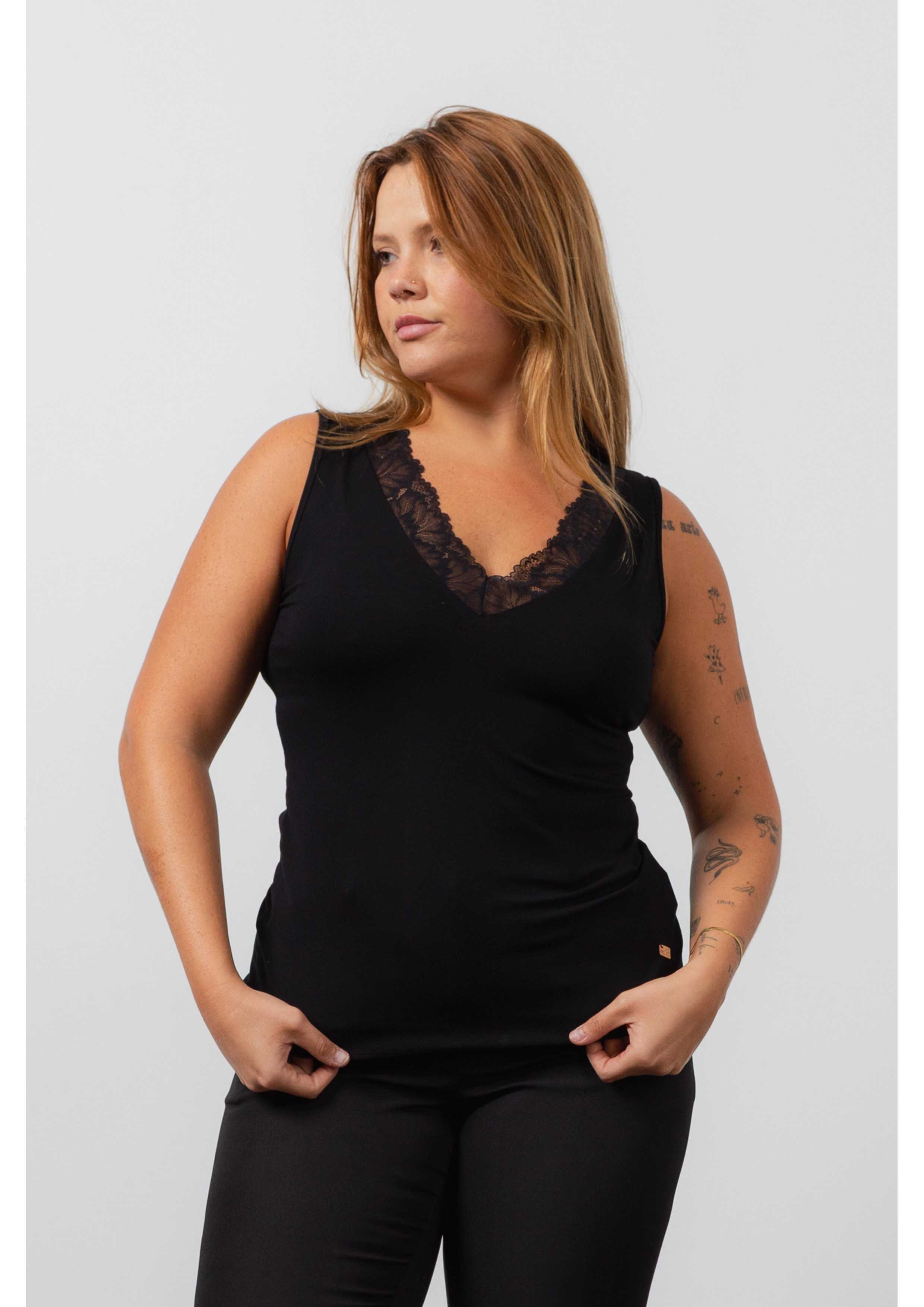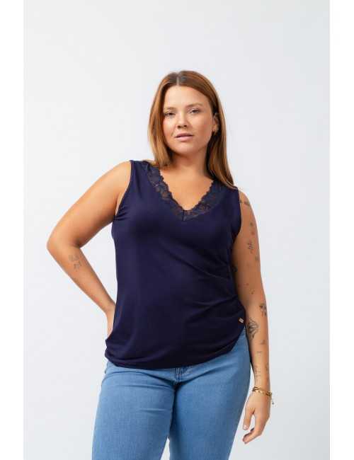 Top en maille unie, coupe droite, décolleté en V avec application de dentelle. Collection : Printemps Été Disponible en Grandes Tailles Produit de design et de fabrication propre. Nous sommes une marque de confection de vêtements avec plus de 50 ans d'expérience Modèle : Taille 1.70m et porte la taille XL. Composition : 94% Viscose 6% Élasthanne