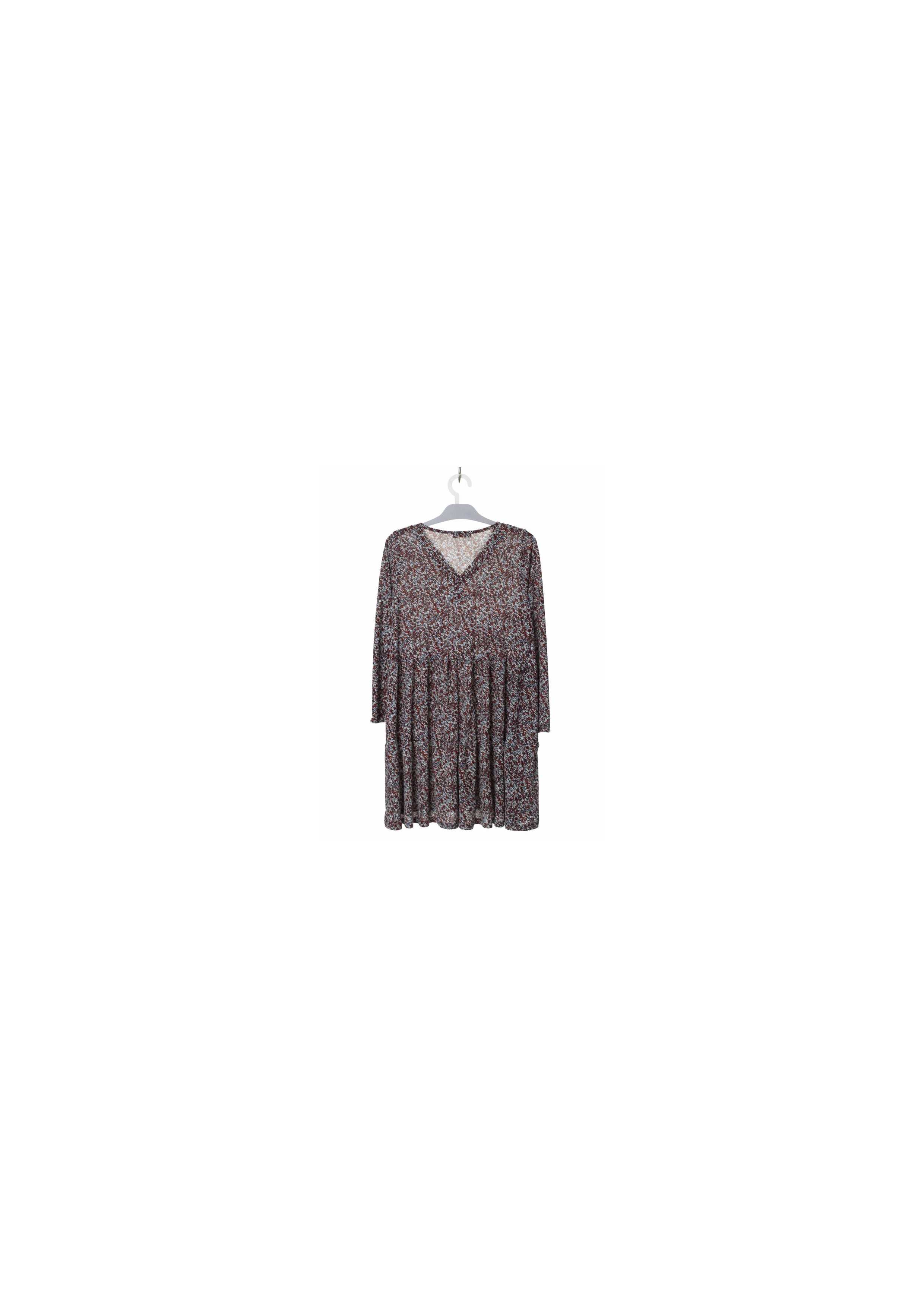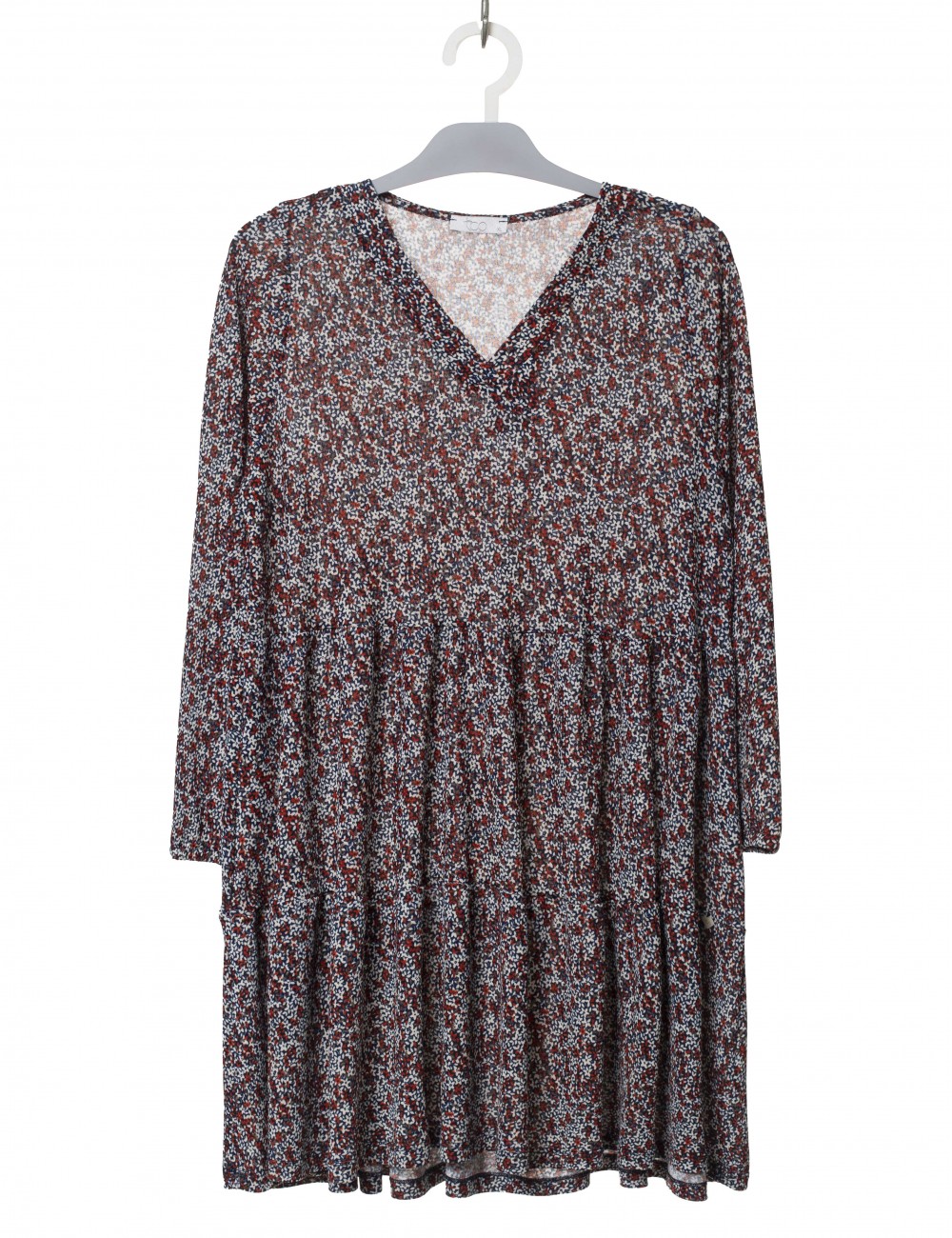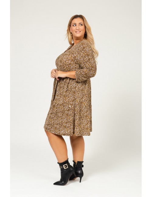 Robe en maille florale, avec volants, manches longues, décolleté en V. Collection : Automne Hiver Modèle : Hauteur 1,70m et porte la taille 2XL en bleu. Modèle : Hauteur 1,65m et porte la taille 3XL en marron.