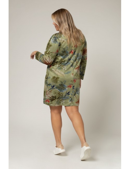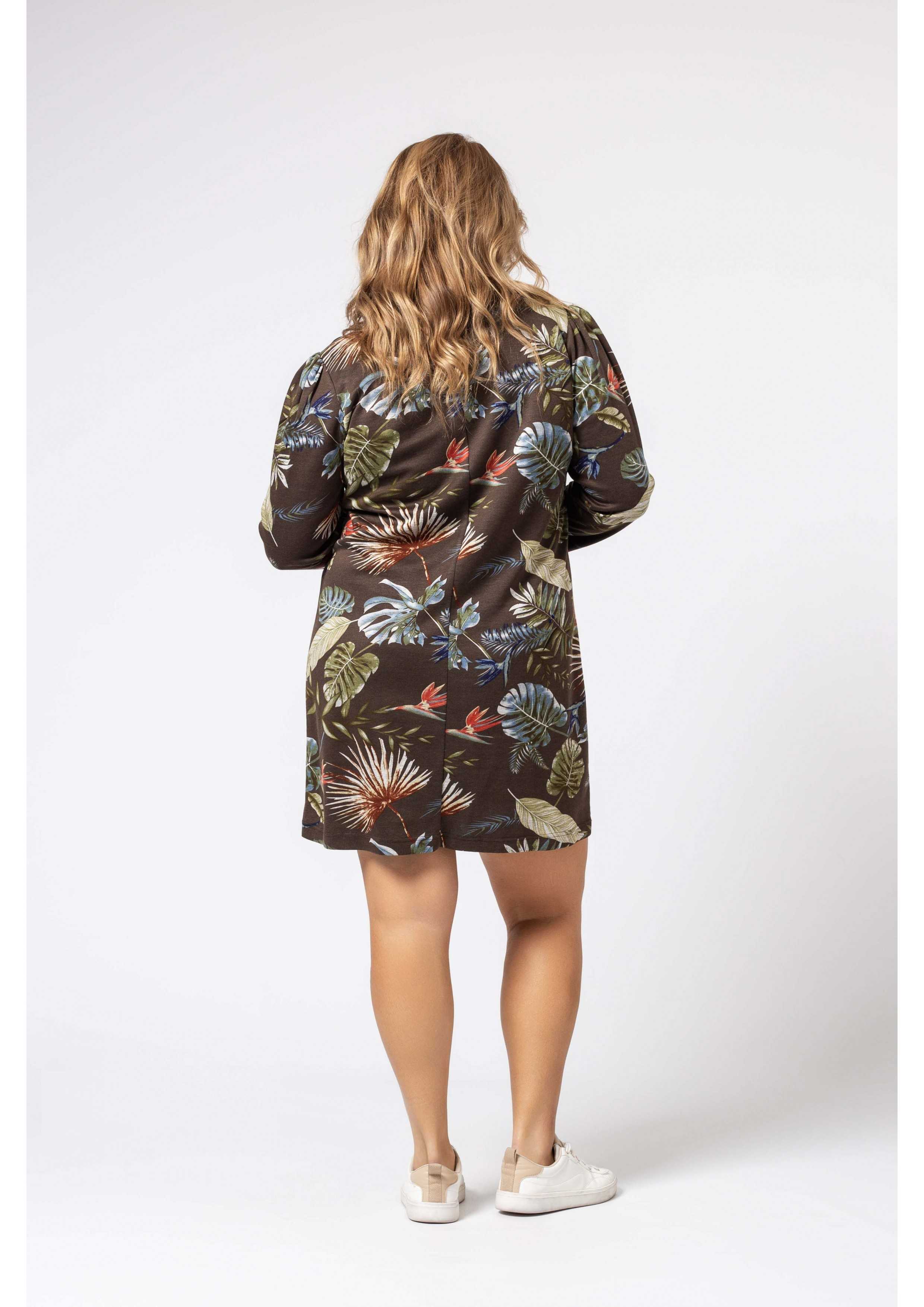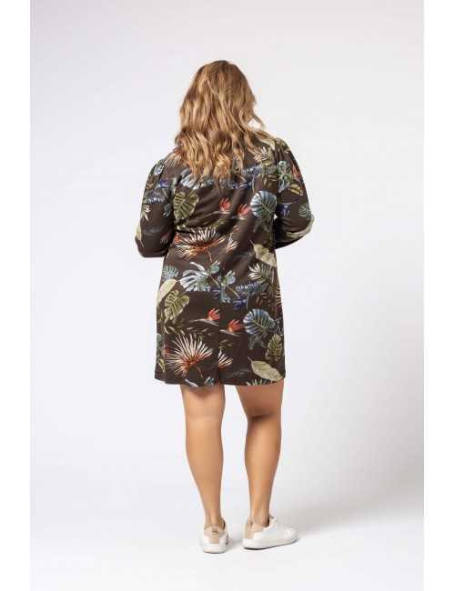 Robe en maille imprimée, manches longues, avec volant à l'épaule. Décolleté rond Collection : Automne Hiver Modèle : Hauteur 1.70m et porte la taille 2XL.