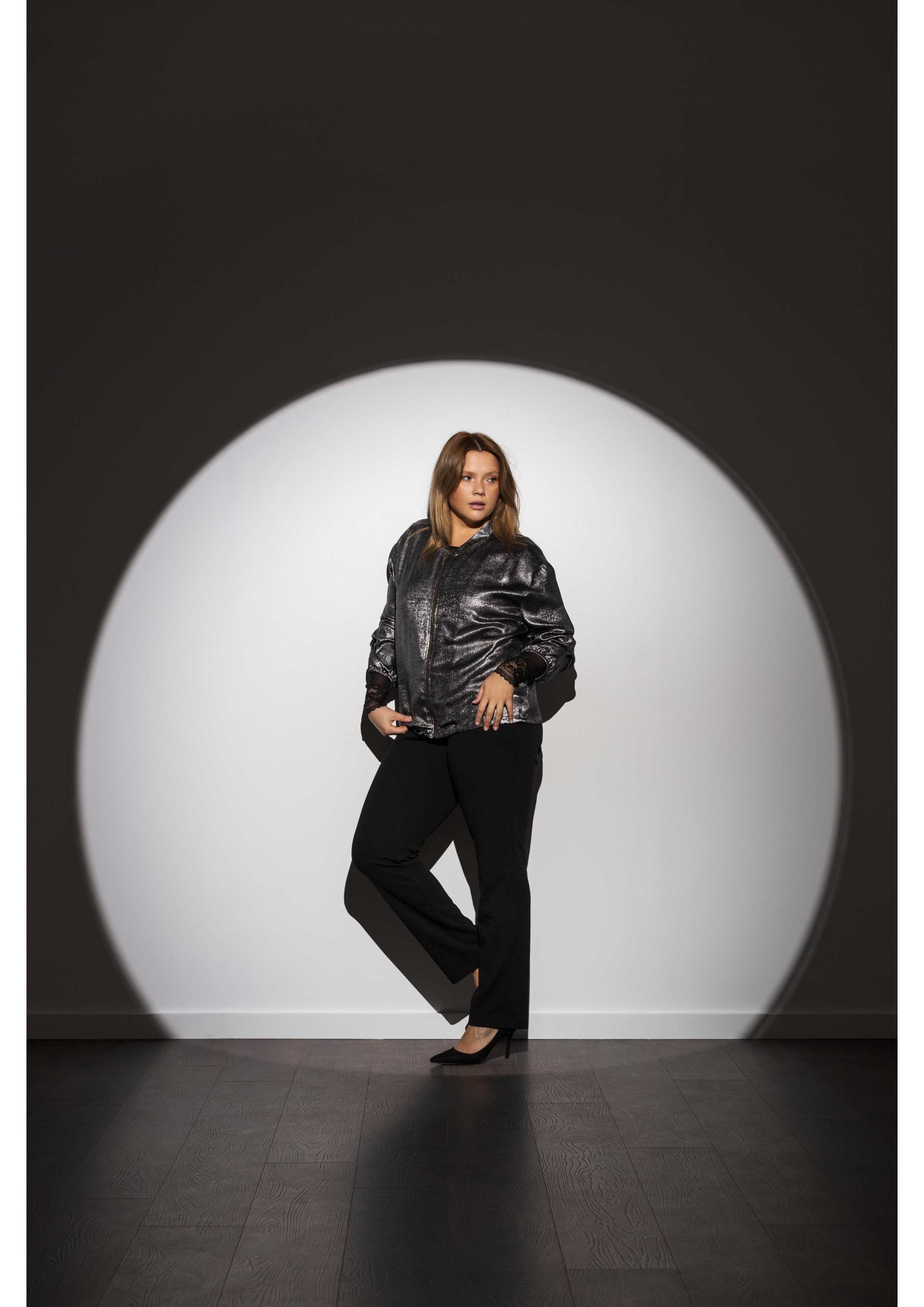 Veste en tissu modèle "bomber", fermeture à l'avant poches latérales, manches 3/4 avec clous et élastique à la base. fermeture à l'avant. Modèle : Hauteur 1,70m et porte la taille 2XL. |