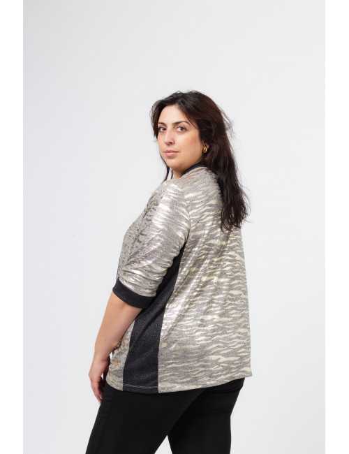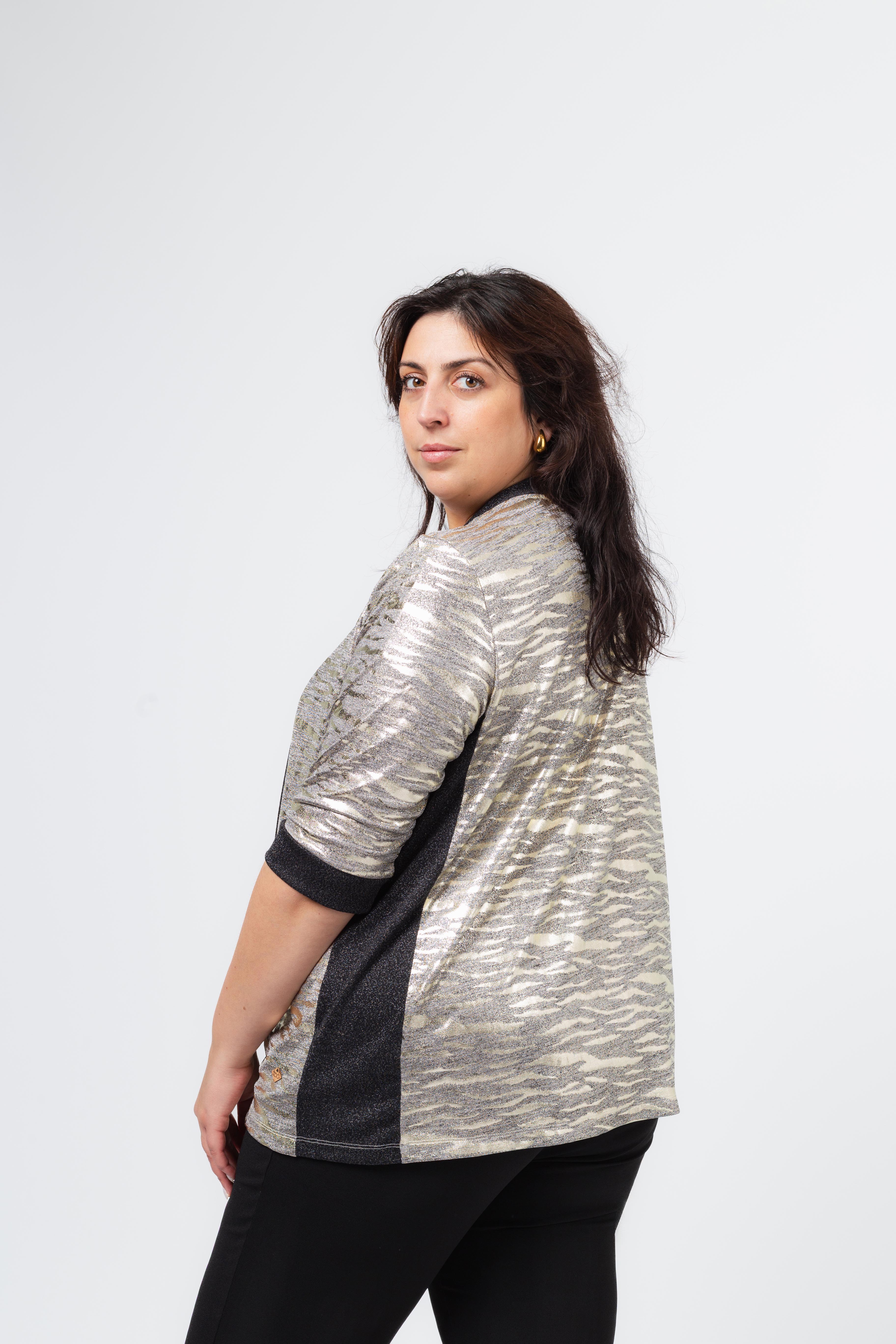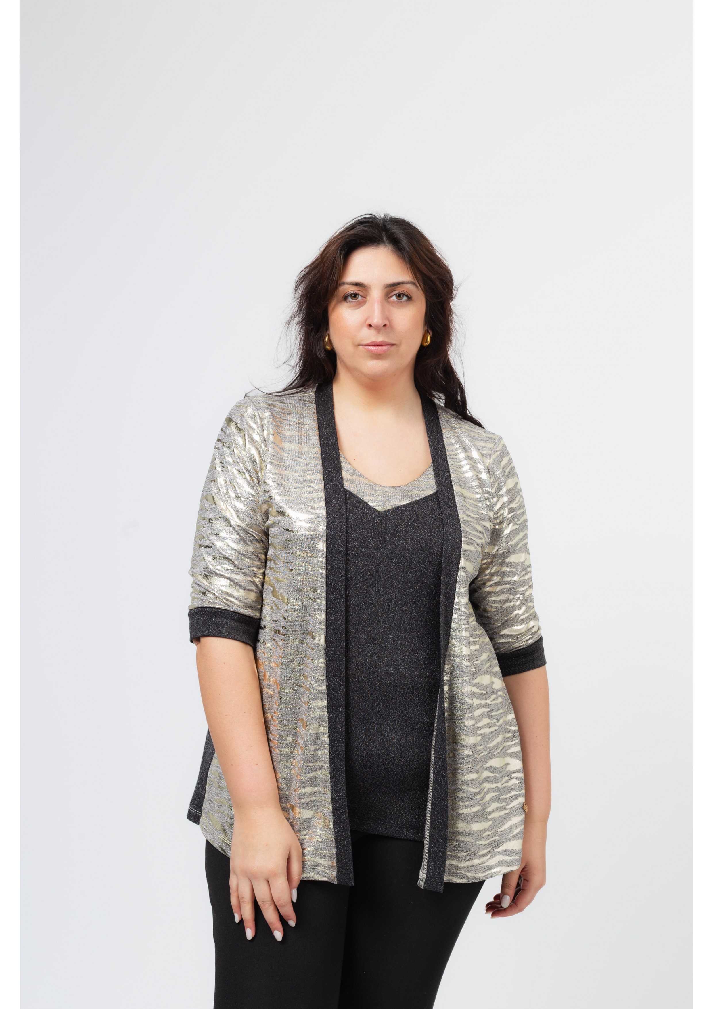 Ensemble en maille lisse avec brillants. Tunique à manches courtes avec encolure en V et fentes latérales. Veste manches 3/4 avec empiècements et poignets en maille lisse. Modèle : Hauteur 1,70m et porte la taille XL.
