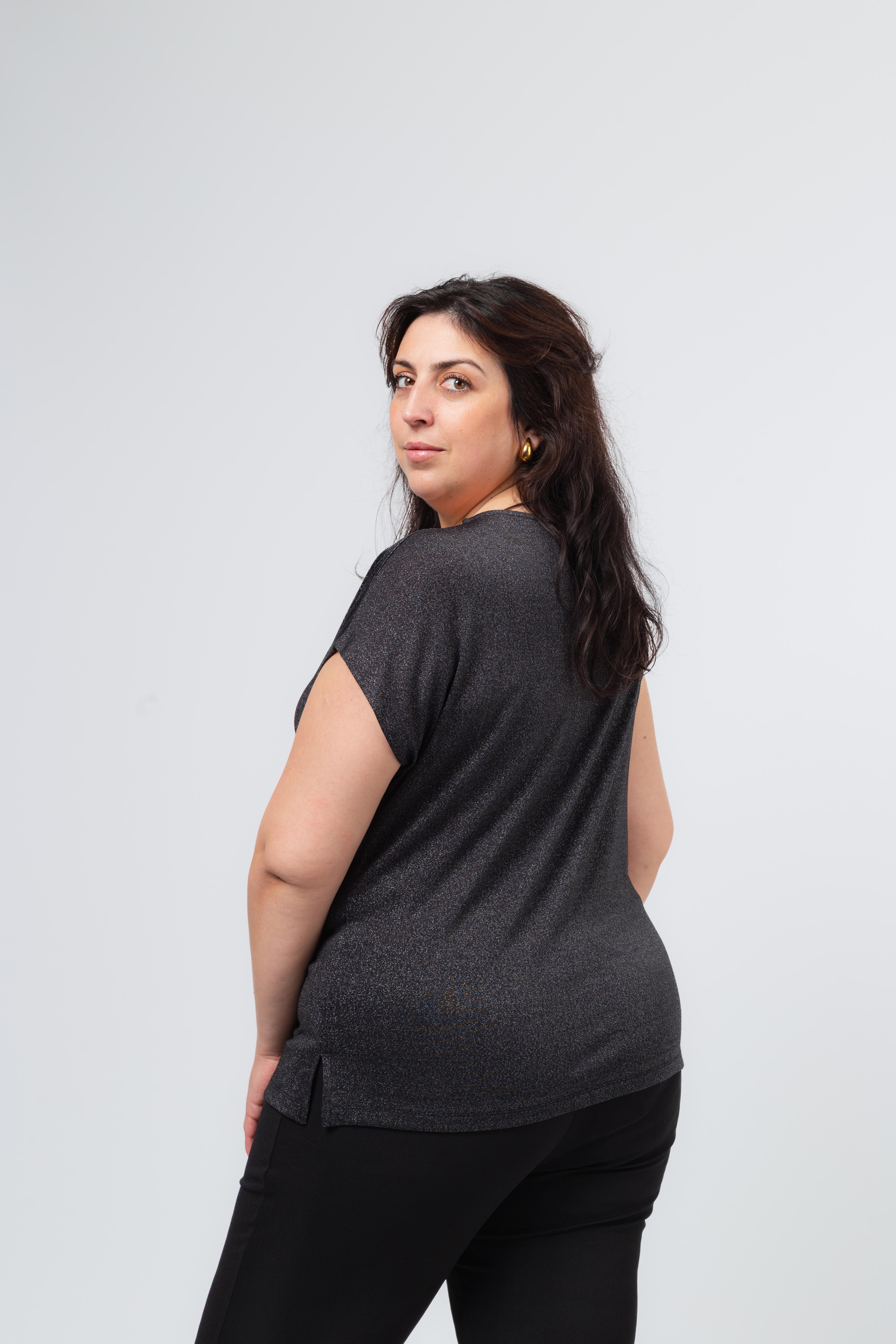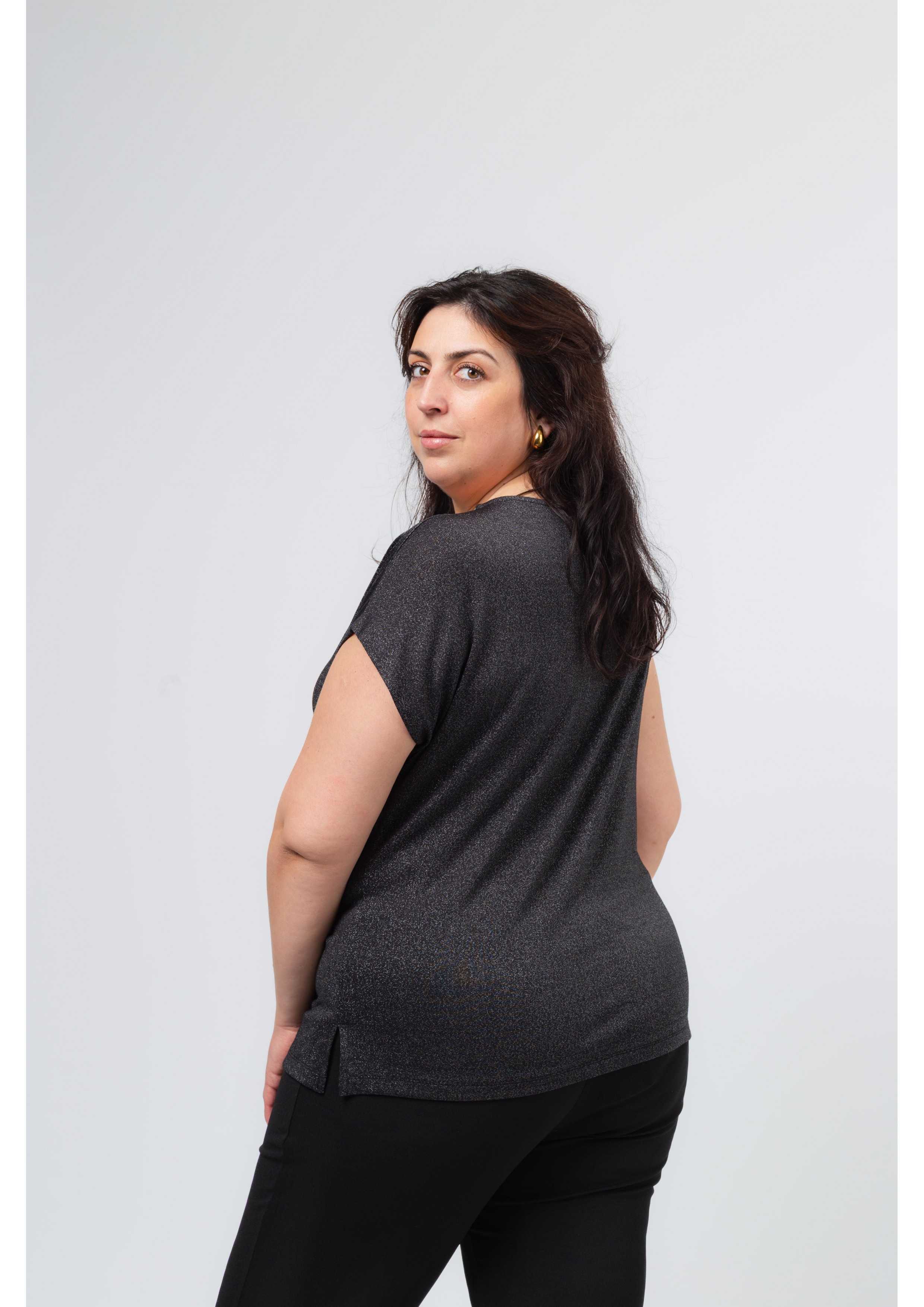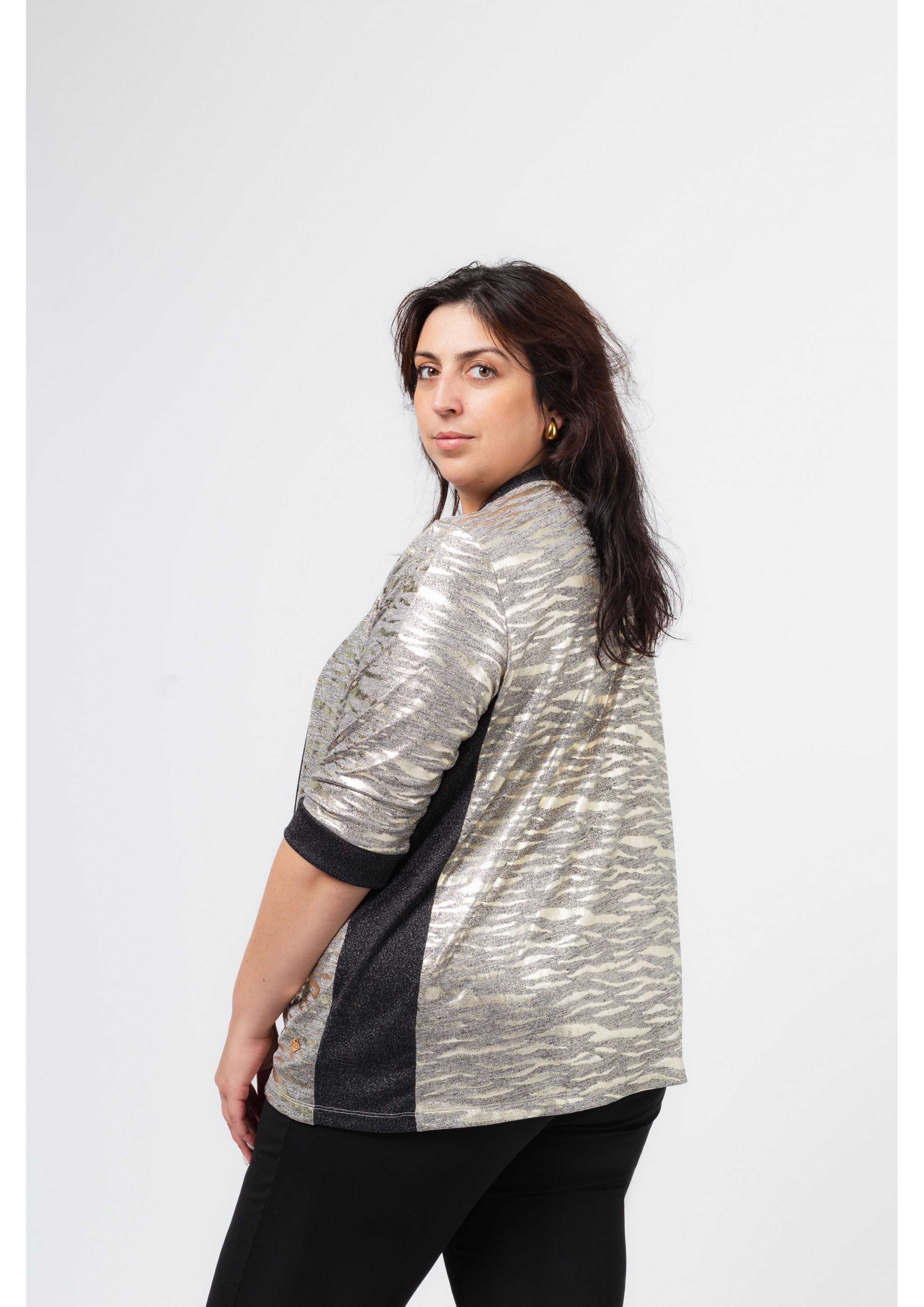 Ensemble en maille lisse avec brillants. Tunique à manches courtes avec encolure en V et fentes latérales. Veste manches 3/4 avec empiècements et poignets en maille lisse. Modèle : Hauteur 1,70m et porte la taille XL.