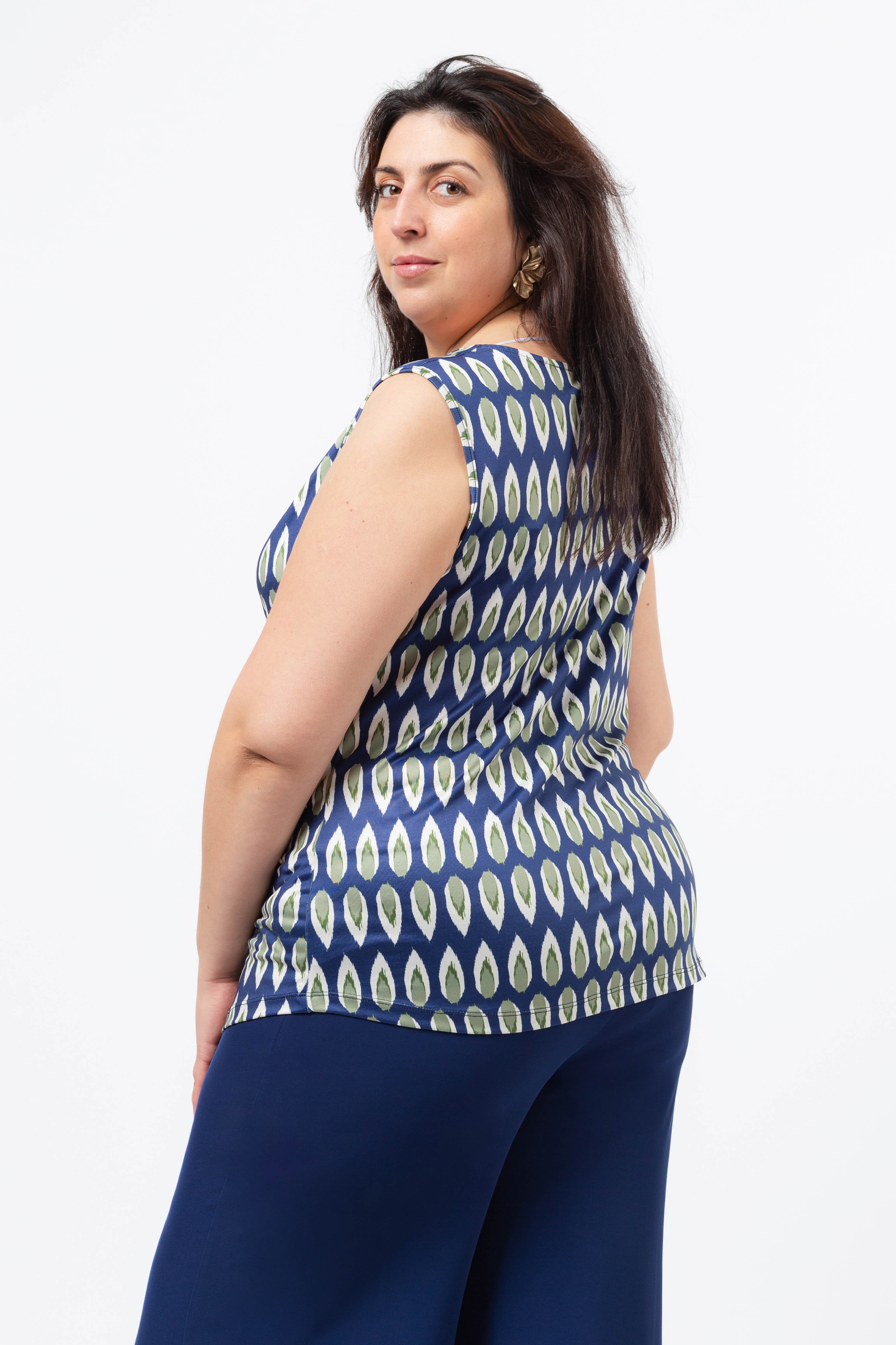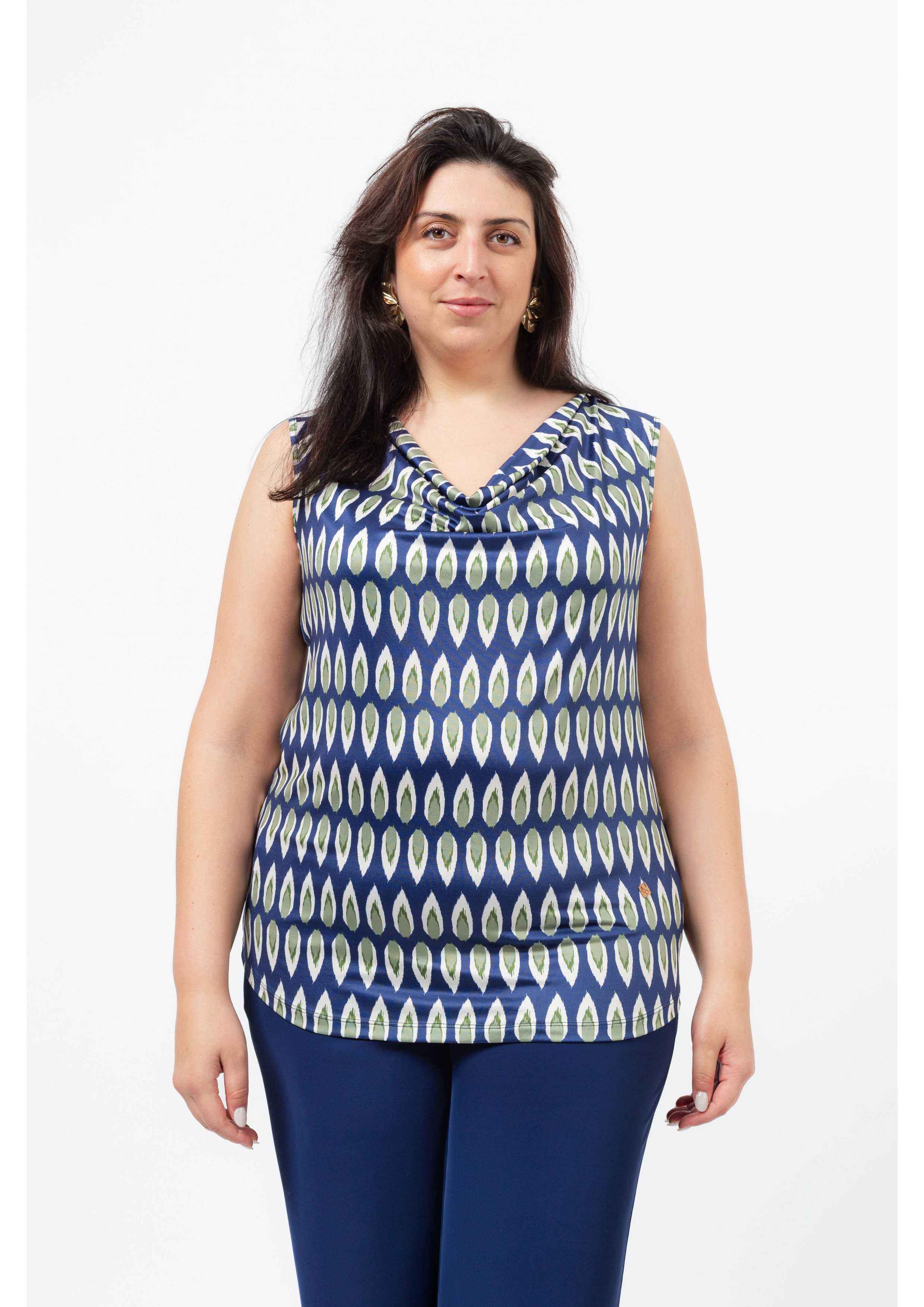 Top en maille imprimée, tons marine et vert, col drapé, base arrondie.