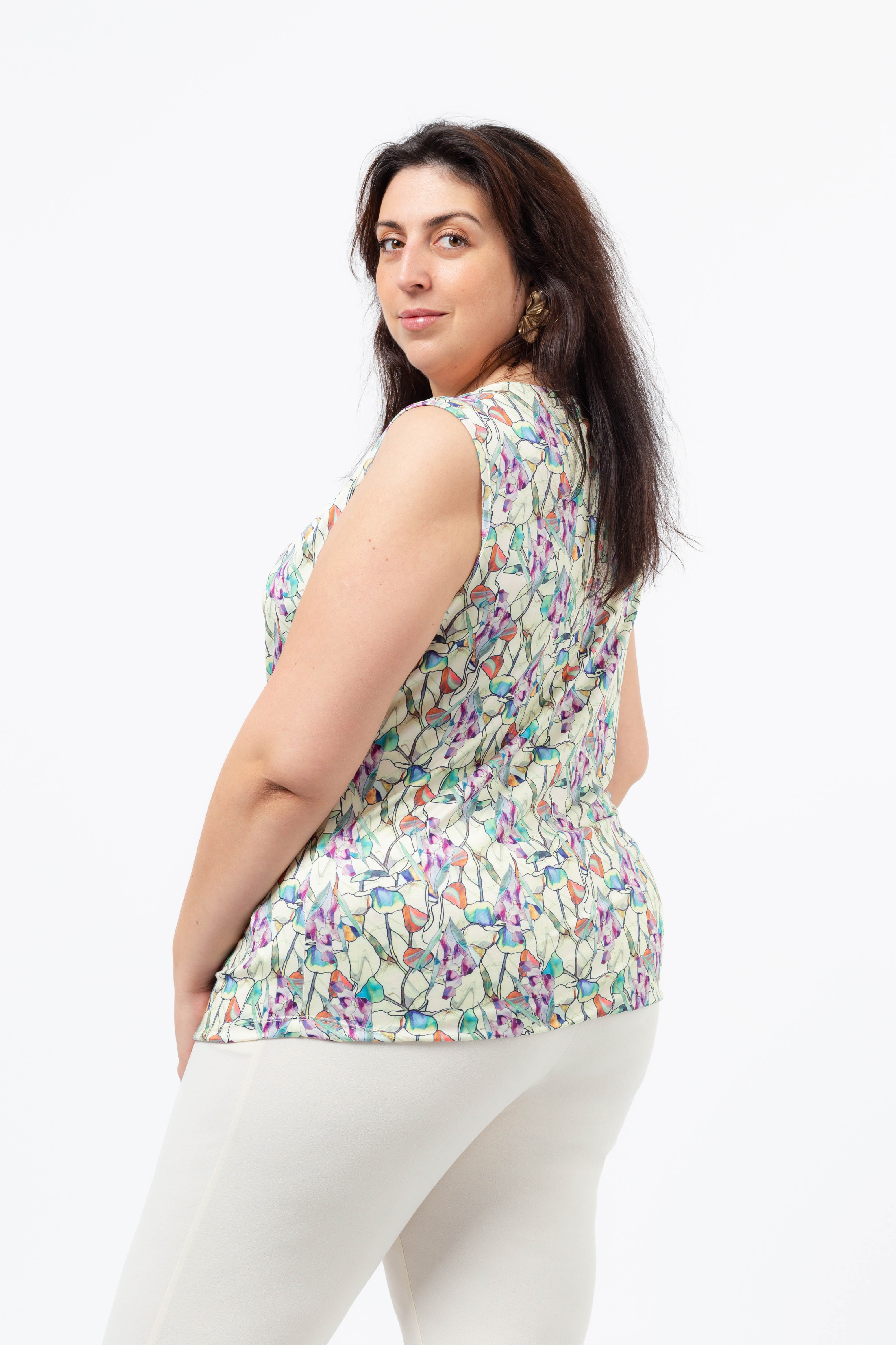Top en maille imprimée, tons verts, col drapé, base arrondie. Disponible en Grandes Tailles Produit de design et fabrication propre. Nous sommes une marque de confection de vêtements avec plus de 50 ans d'expérience Modèle : Hauteur 1,82m et porte la taille 3XL.