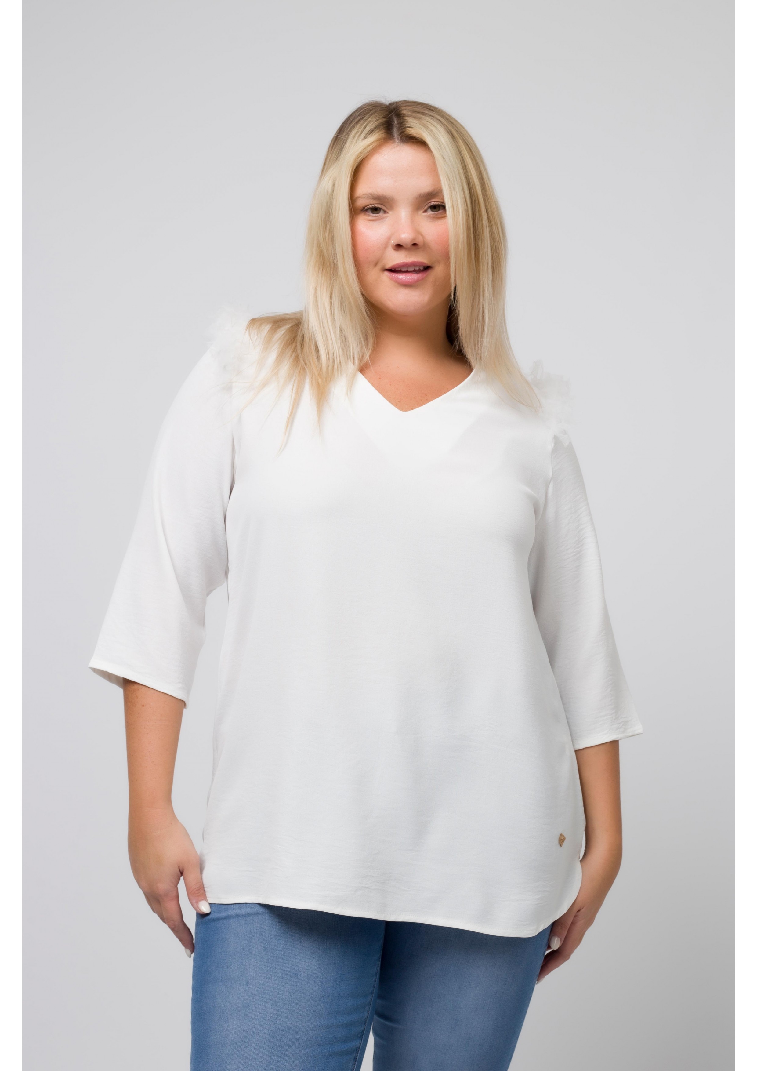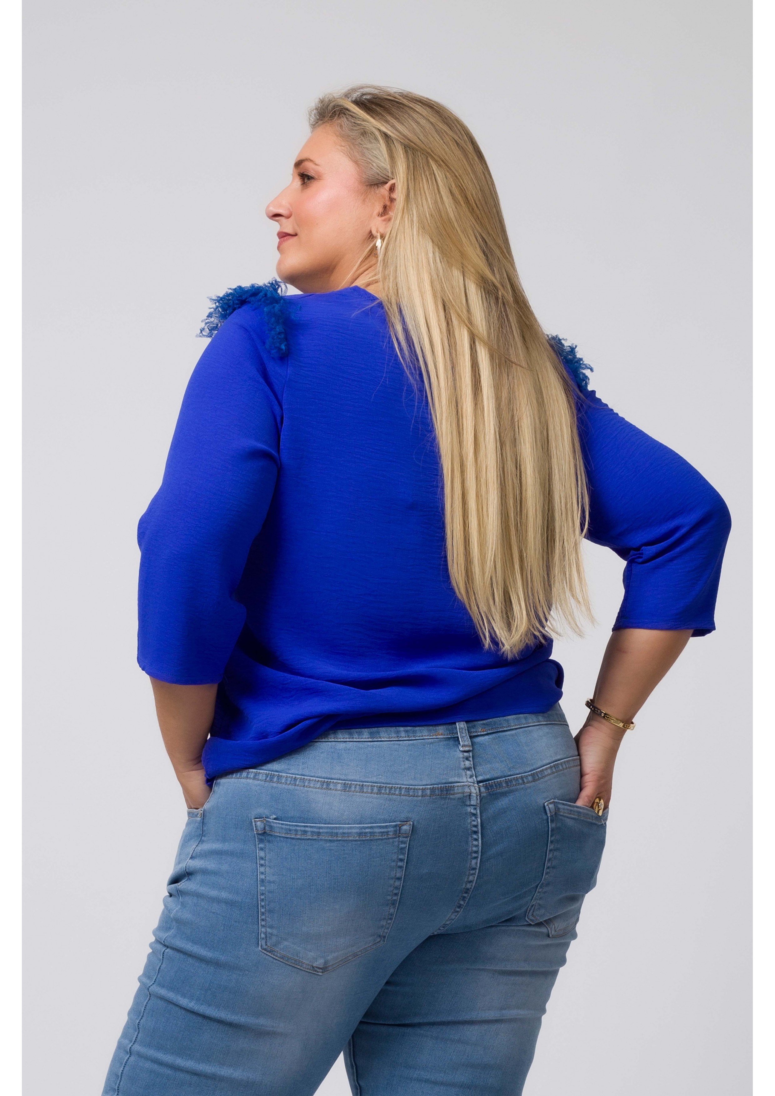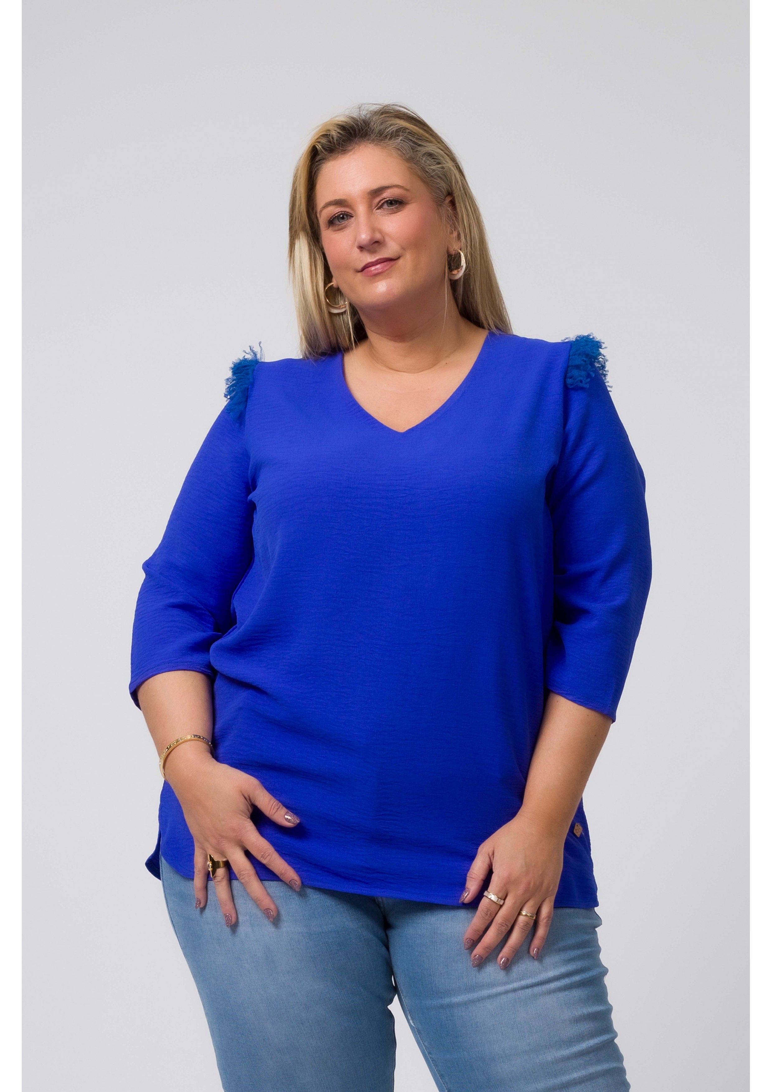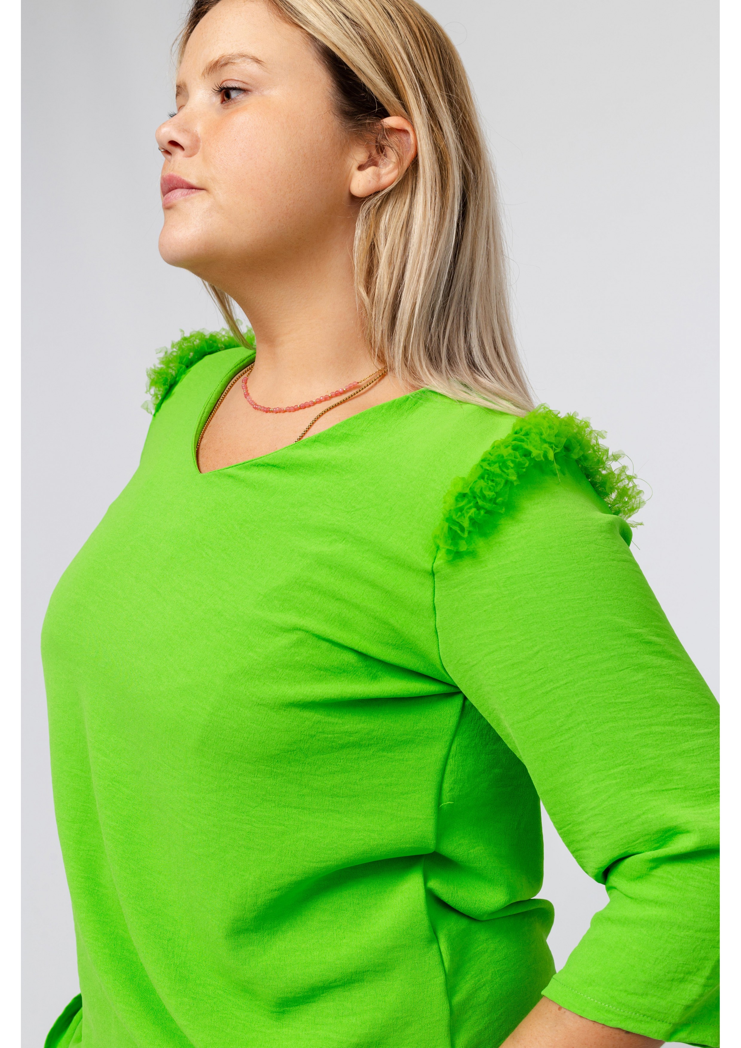 Blouse en tissu uni avec décolleté en V et manches 3/4 avec application en tulle. Collection : Printemps Été Modèle : Taille 1,70 m et porte la taille 2XL en vert citron et perle. Modèle : Taille 1,65 m et porte la taille 3XL en bleu roi et rose.