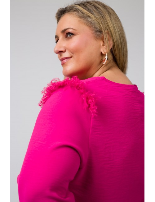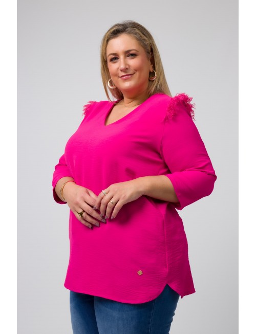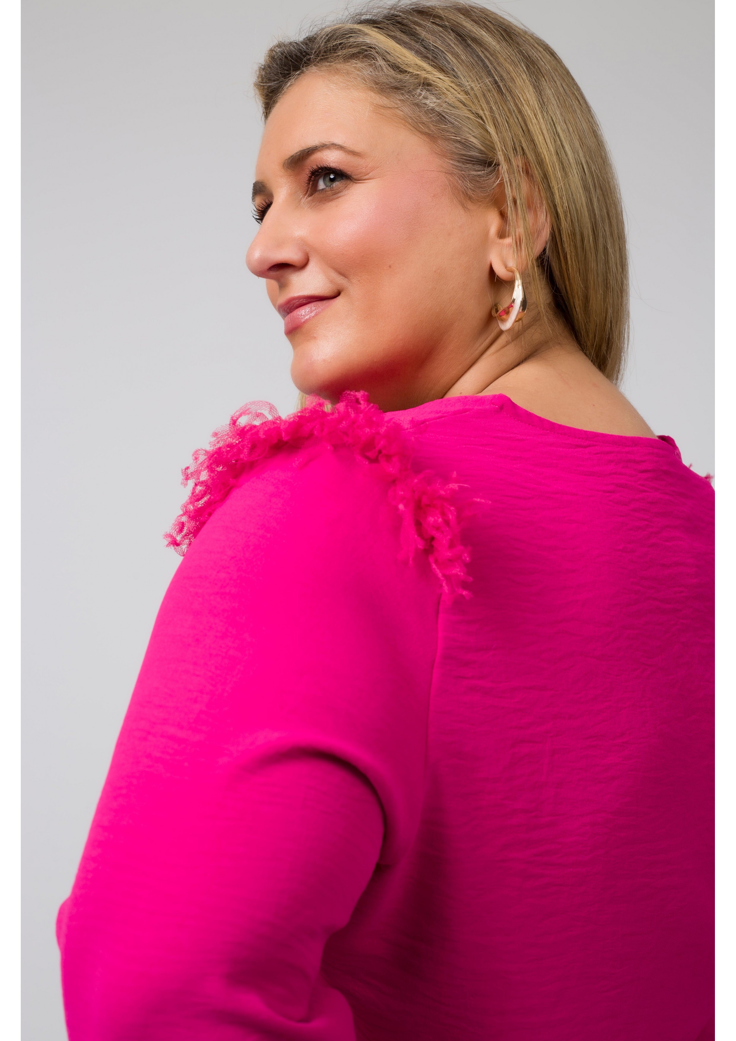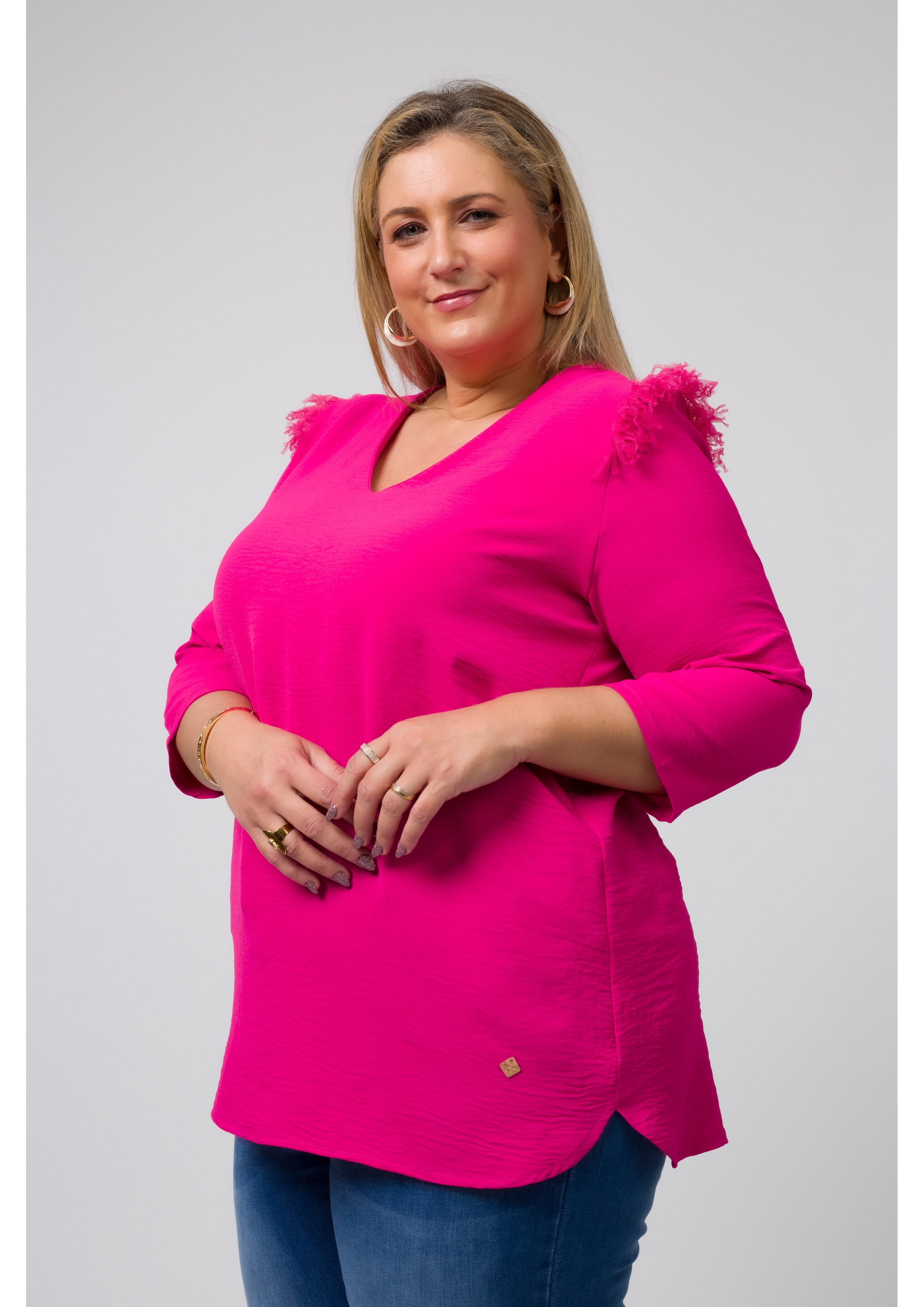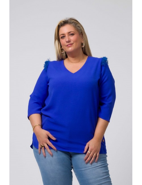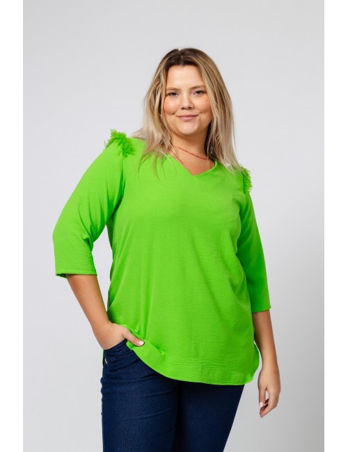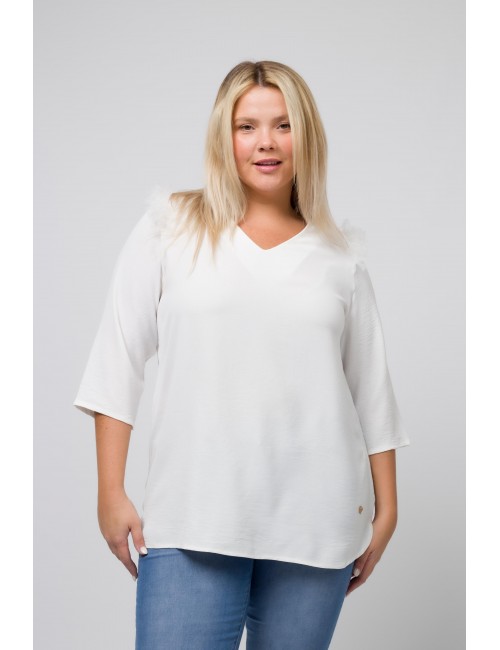 Blouse en tissu uni avec décolleté en V et manches 3/4 avec application en tulle. Collection : Printemps Été Modèle : Taille 1,70 m et porte la taille 2XL en vert citron et perle. Modèle : Taille 1,65 m et porte la taille 3XL en bleu roi et rose.