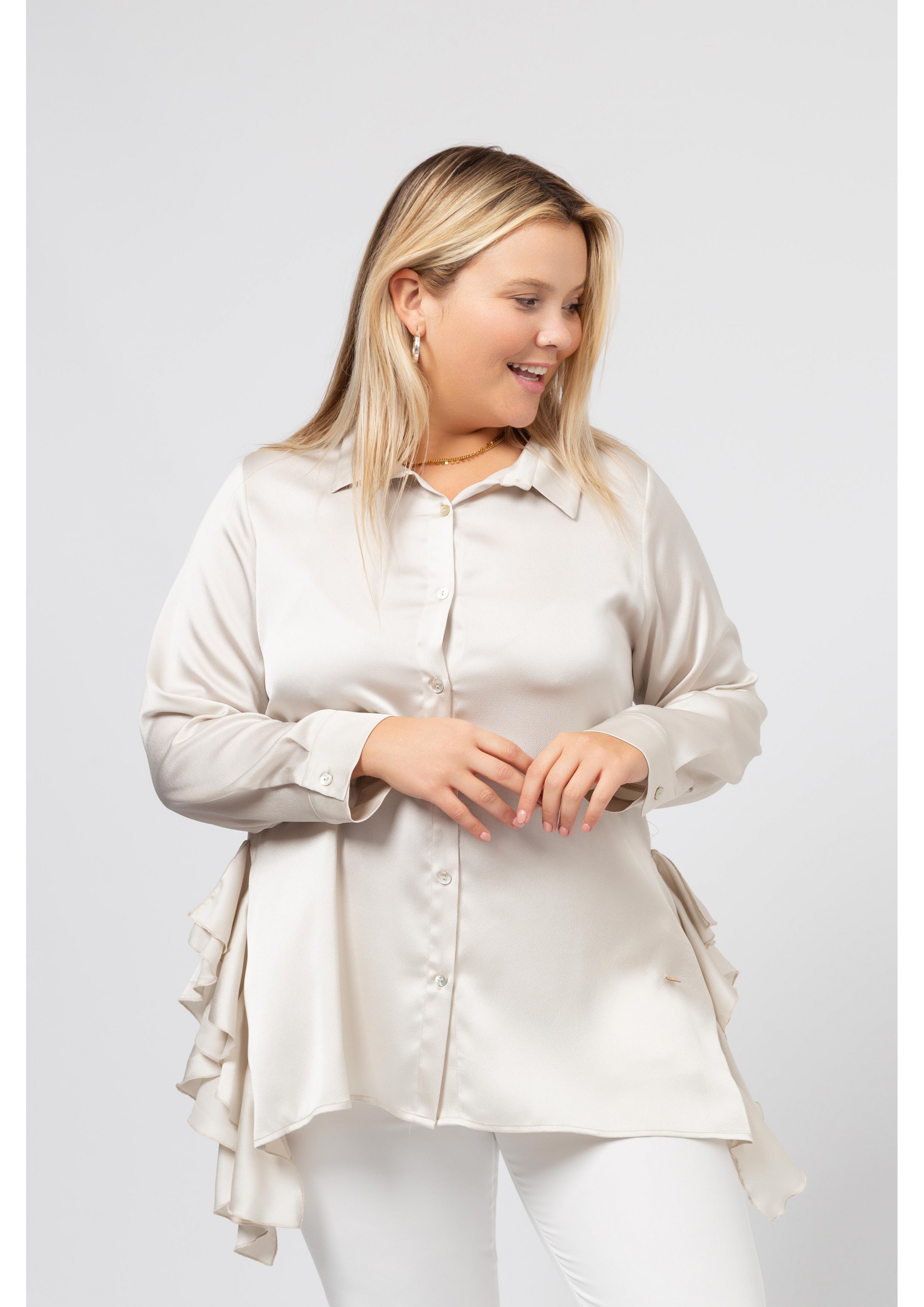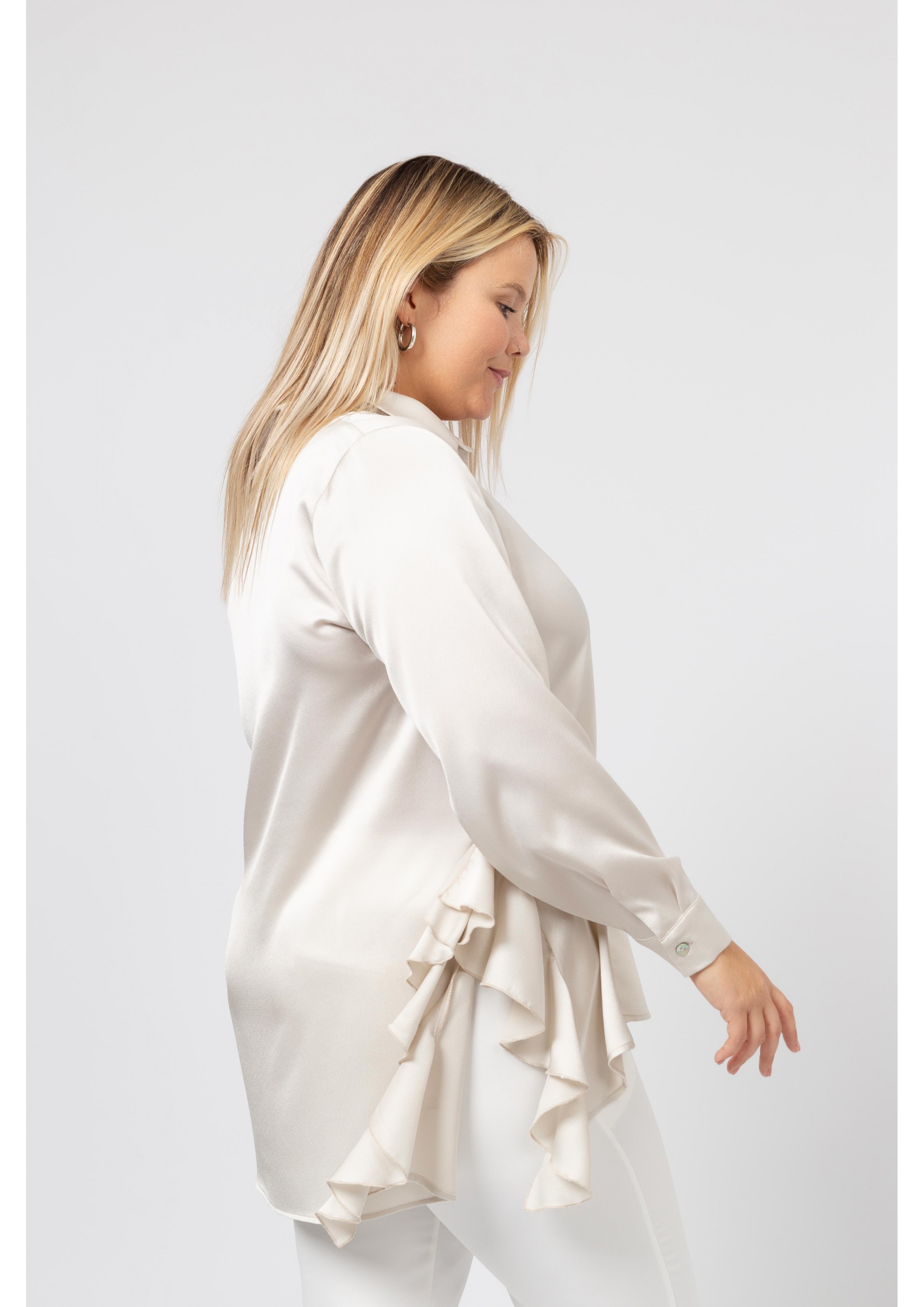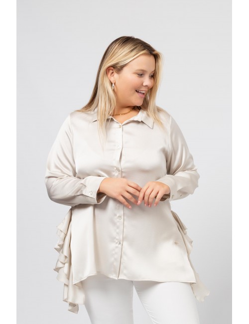 Blouse en tissu uni avec des détails et des fentes sur les côtés avec des volants Collection : Printemps Été Modèle : Taille 1,70 m et porte la taille 2XL.