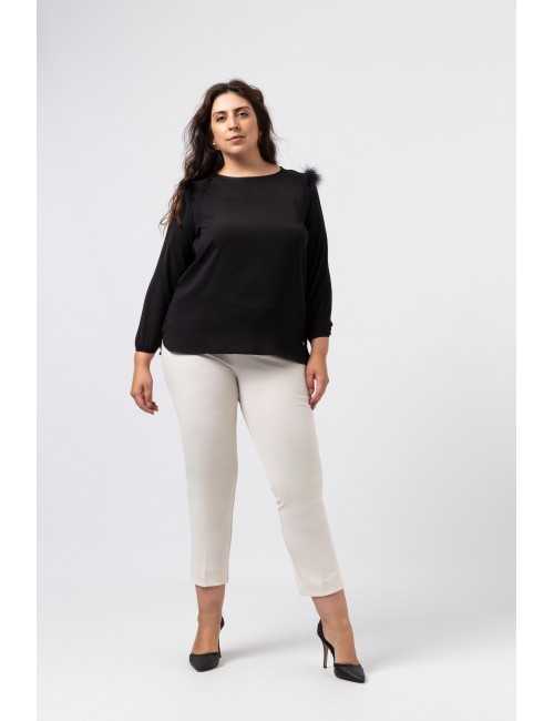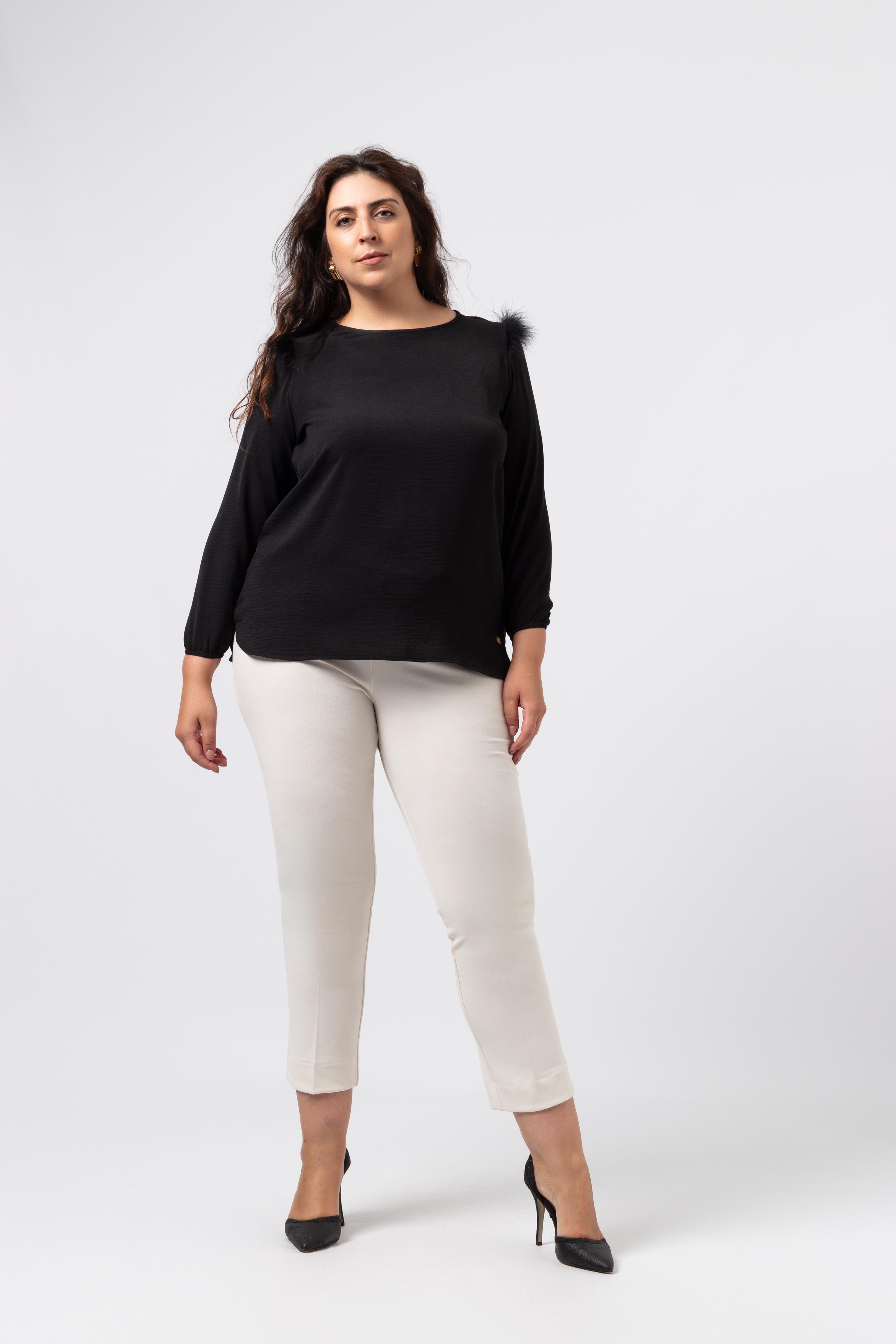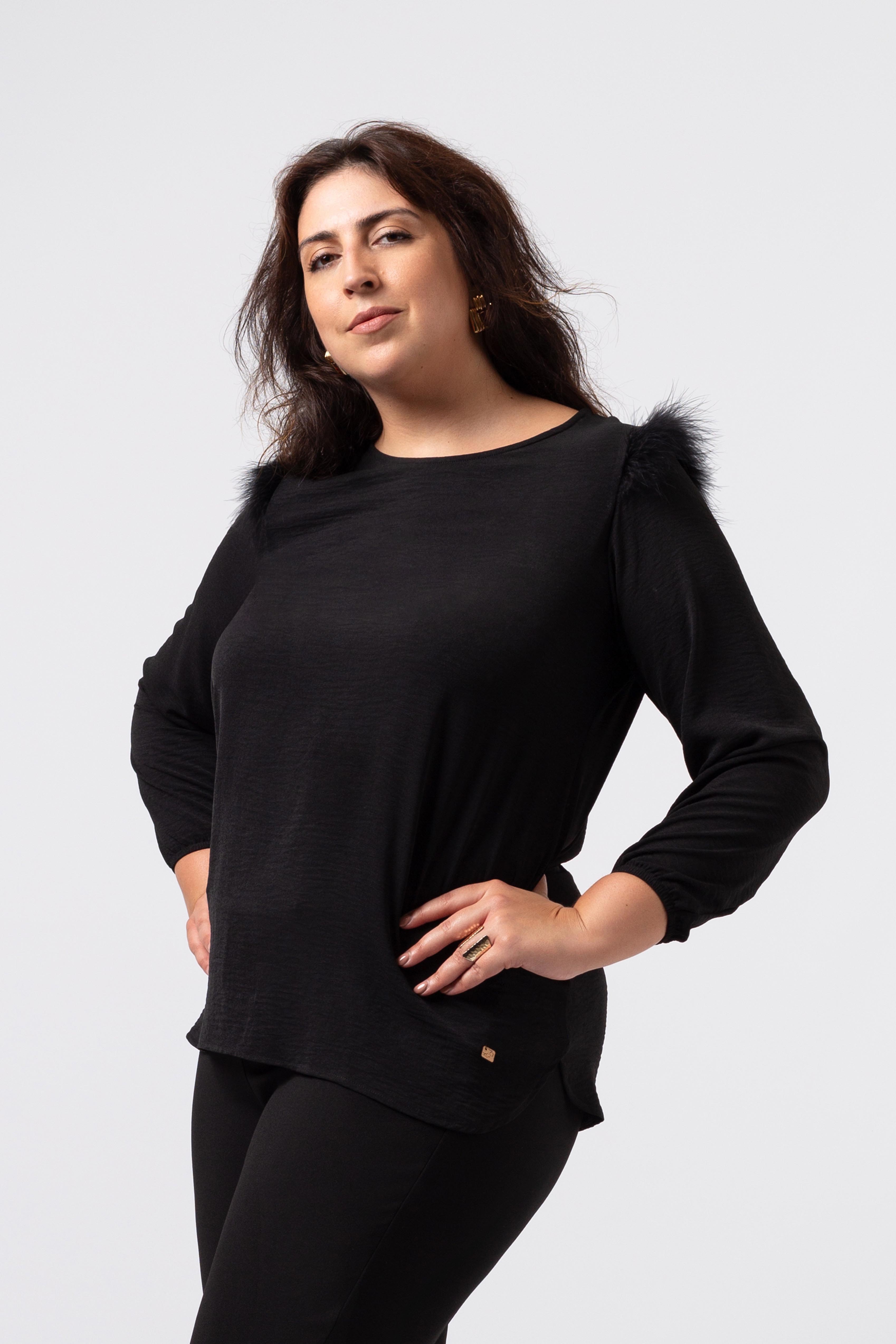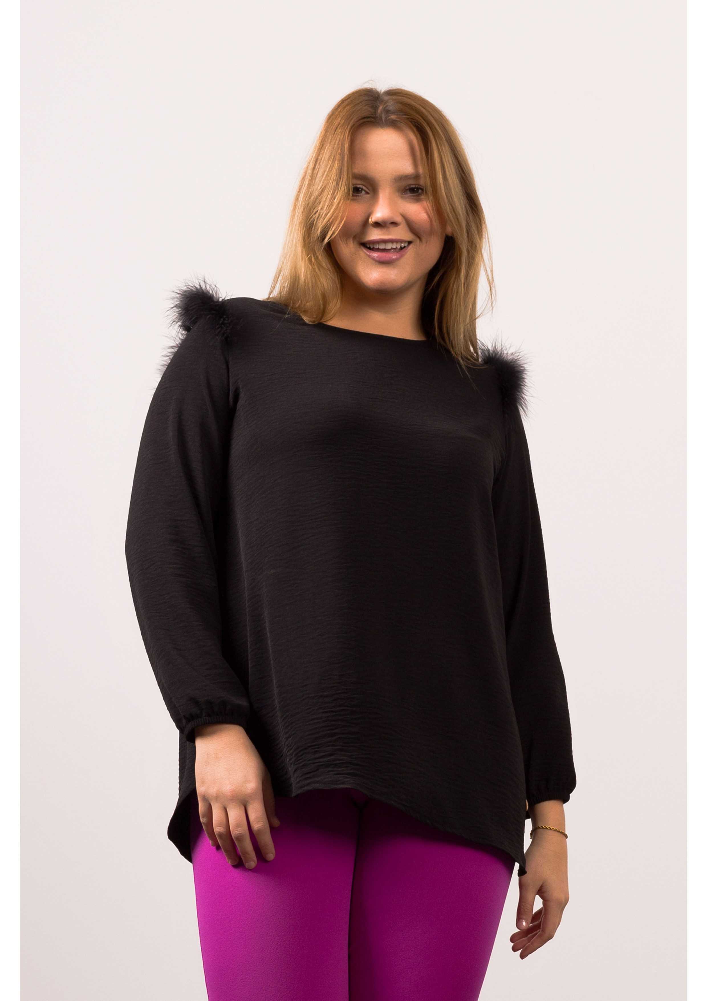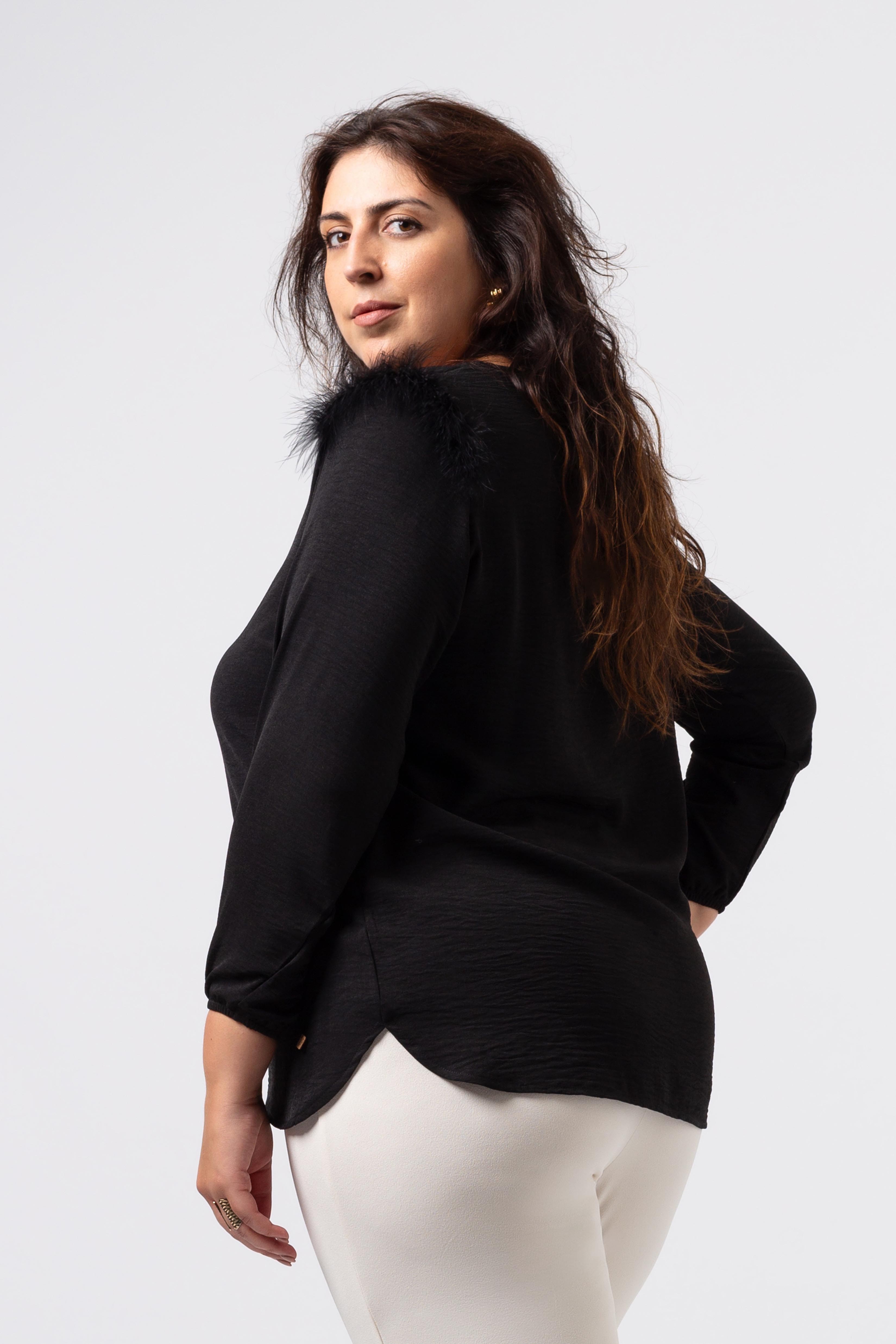 Blouse en tissu uni, col rond, plumes appliquées sur les épaules, élastique au bas des manches. Collection : Automne Hiver Modèle : Taille 1,70 m et porte du 2XL.