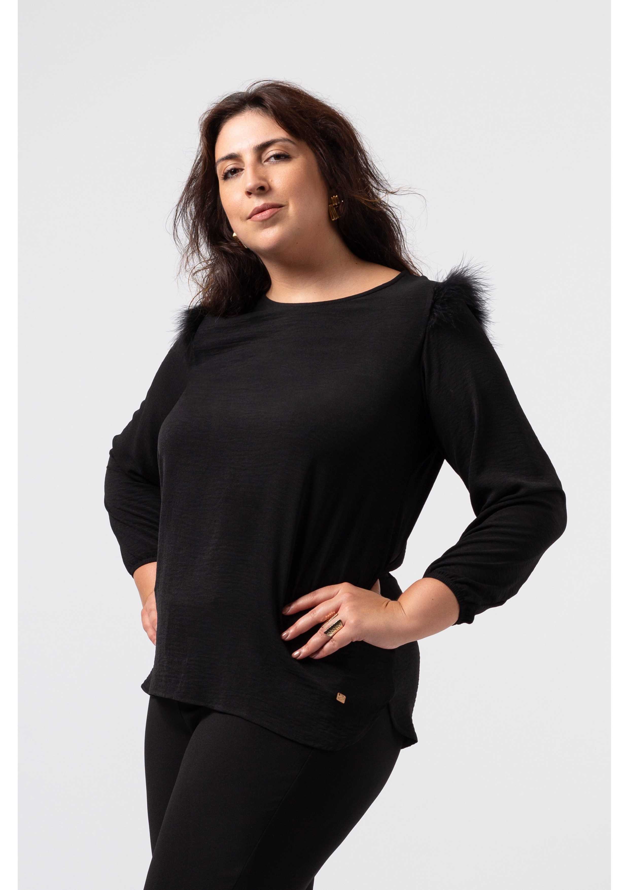 Blouse en tissu uni, col rond, plumes appliquées sur les épaules, élastique au bas des manches. Collection : Automne Hiver Disponible en Grandes Tailles Produit de design et de fabrication propre. Nous sommes une marque de confection de vêtements avec plus de 50 ans d'expérience Modèle : Taille 1,70 m et porte du 2XL. Composition : 100% Polyester