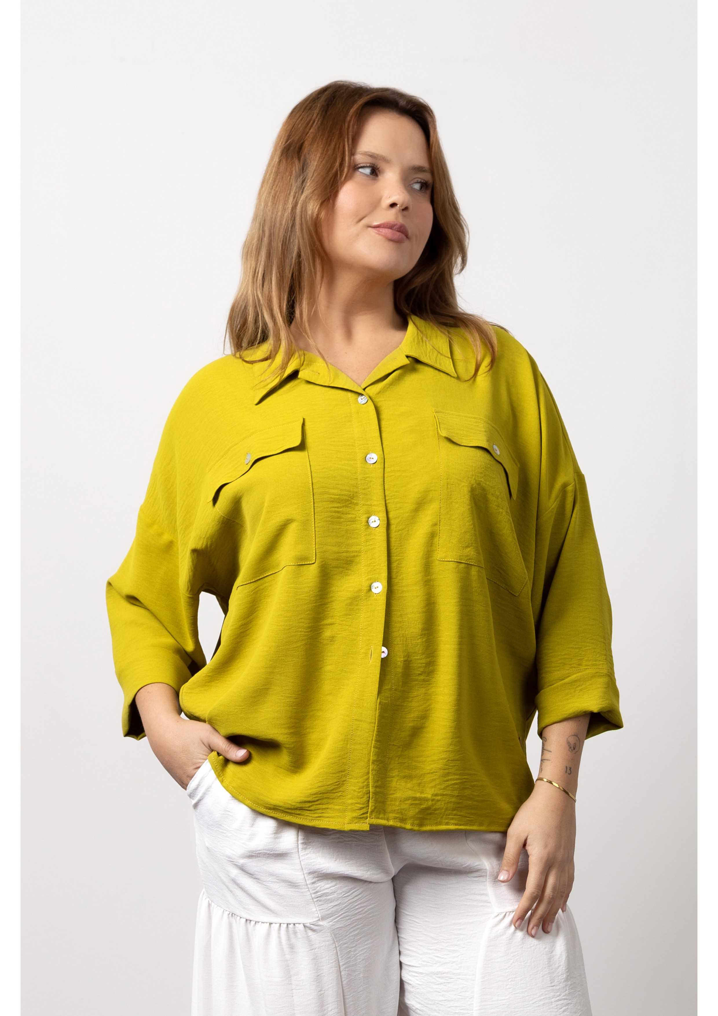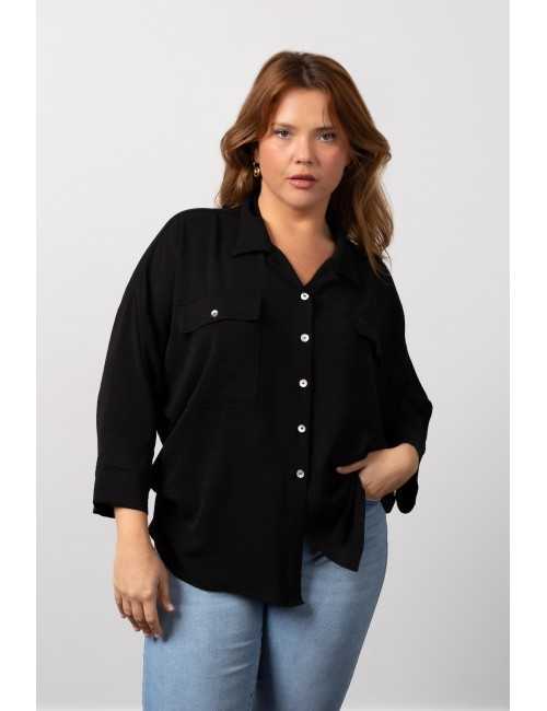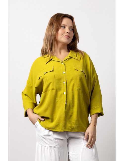 Blouse en tissu uni, manches 3/4 avec poignet replié. Poches à l'avant avec rabat. Dos avec découpe et pinces à la base. Collection : Printemps Été Disponible en Grandes Tailles Produit de design et fabrication propres. Nous sommes une marque de confection de vêtements avec plus de 50 ans d'expérience Modèle : Taille 1,70m et porte la taille XL. Composition : 100% Polyester