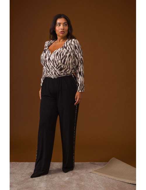 Combinaison en maille unie et imprimée tigre, décolleté croisé, manches longues, pantalon avec poches latérales et passepoil, corps imprimé, pantalon uni. Comprend une ceinture en métal. Collection : Automne-Hiver Modèle : Taille 1.70m et porte la taille 2XL, en noir. Modèle : Taille 1.63m et porte la taille 2XL, en beige.