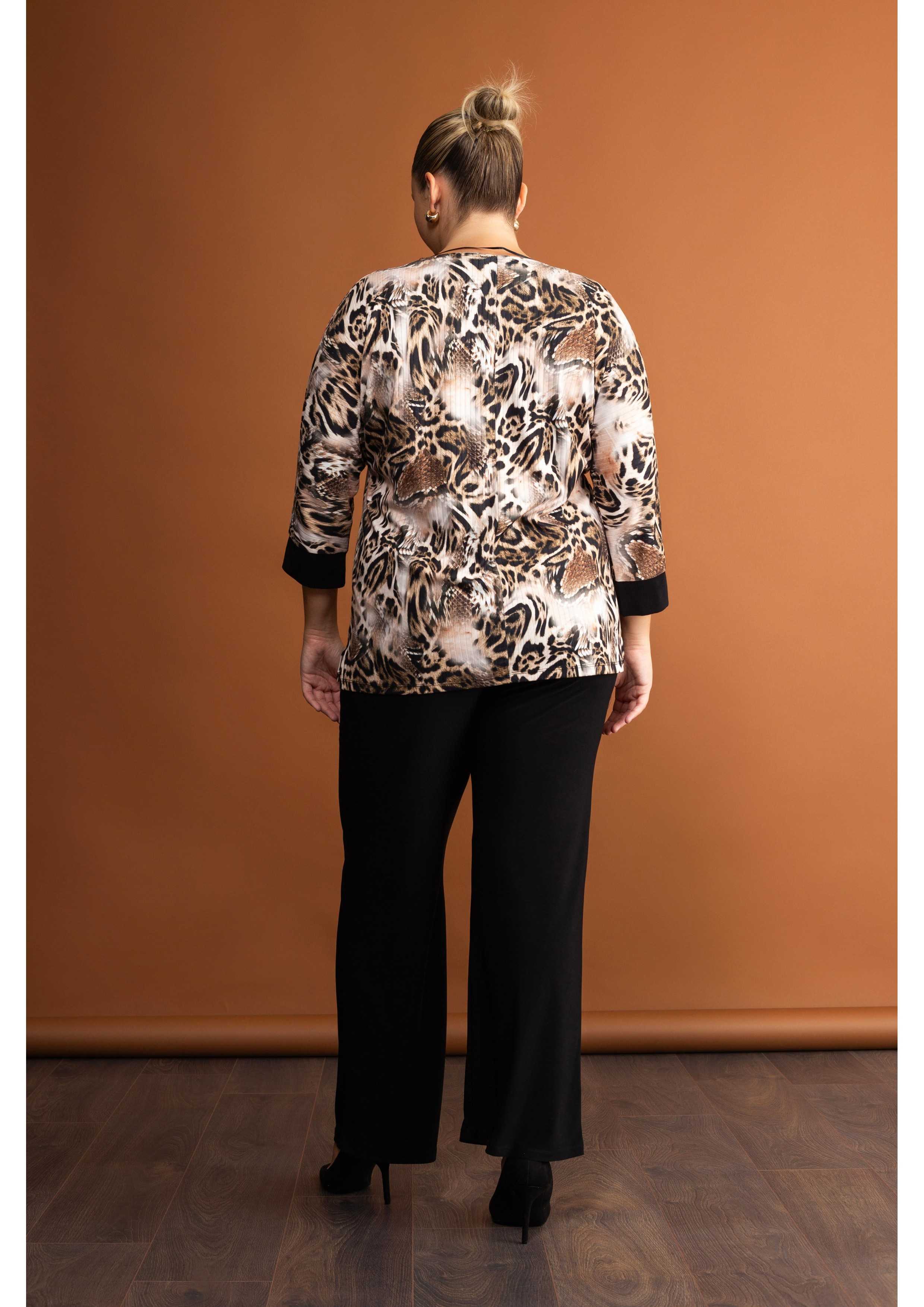 Ensemble en maille imprimée et unie, pull imprimé léopard, pantalon uni avec élastique. Collection : Automne Hiver Modèle : Taille 1.70m et porte la taille 2XL.