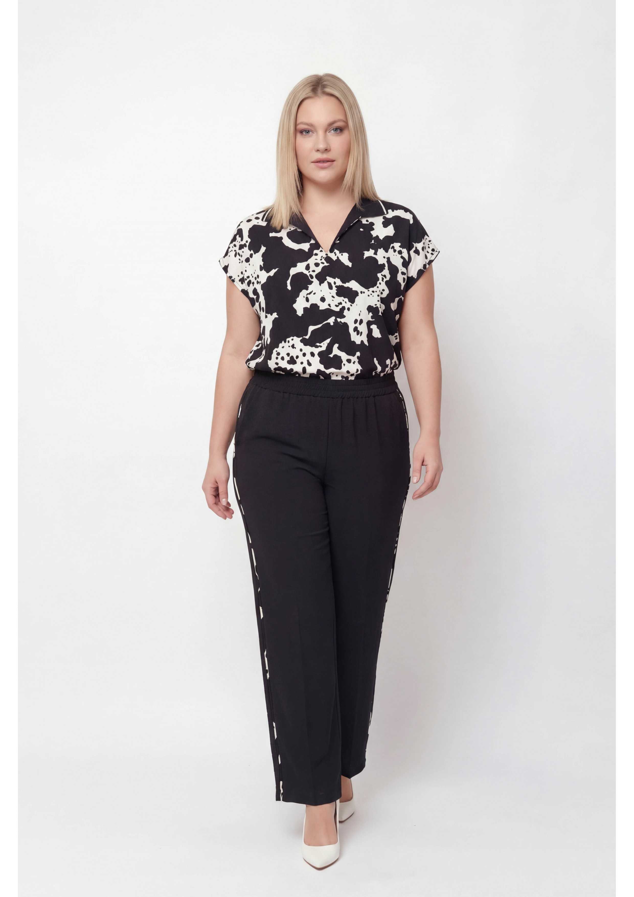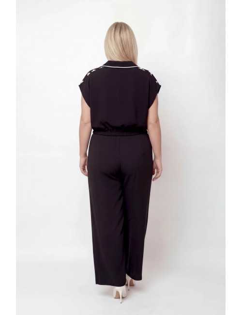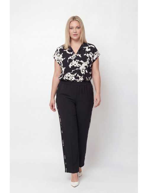 Ensemble en tissu uni et imprimé. Pantalon uni avec bande latérale imprimée, poches et élastique à la taille, tunique sans manches avec devant imprimé type polo, base avec cordon et embouts métalliques. Disponible en Grandes Tailles Produit de conception et fabrication propre. Nous sommes une marque de confection de vêtements avec plus de 50 ans d'expérience