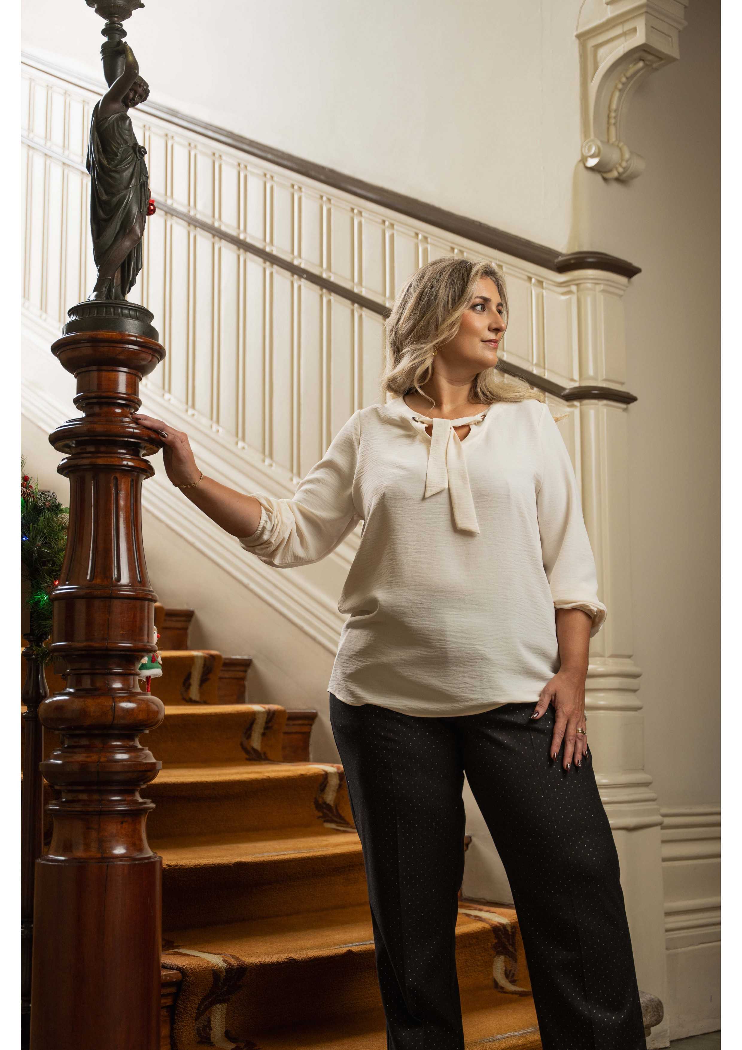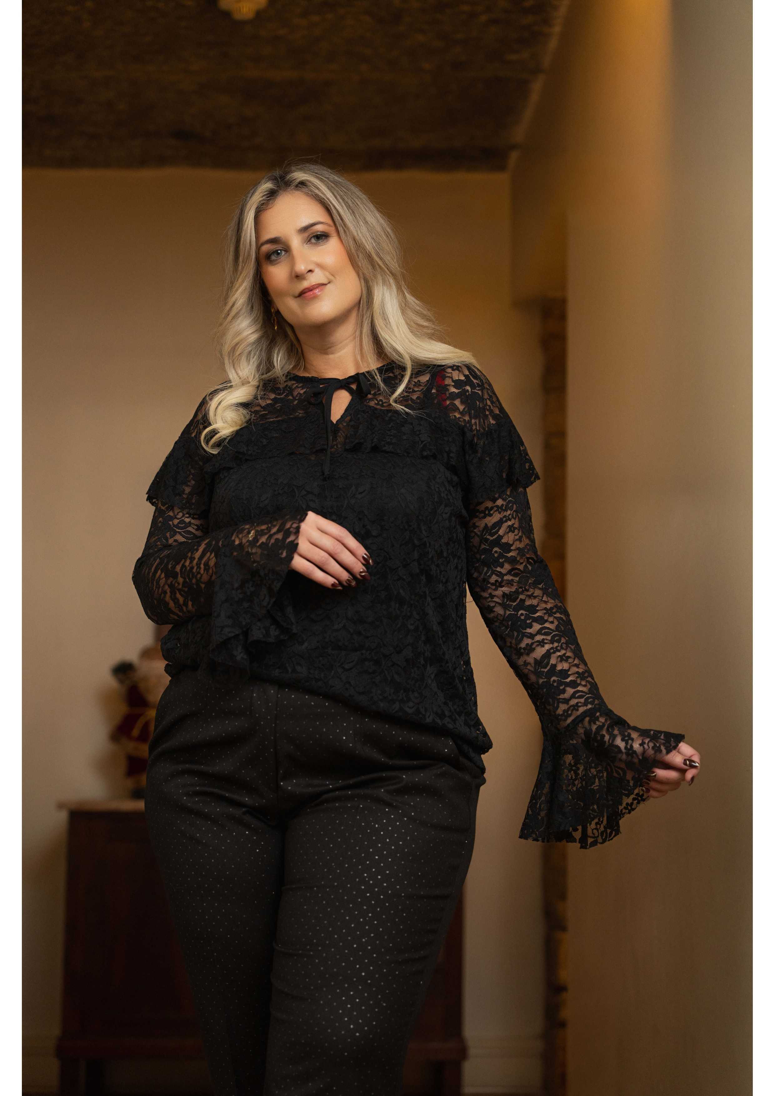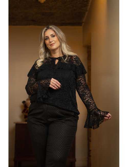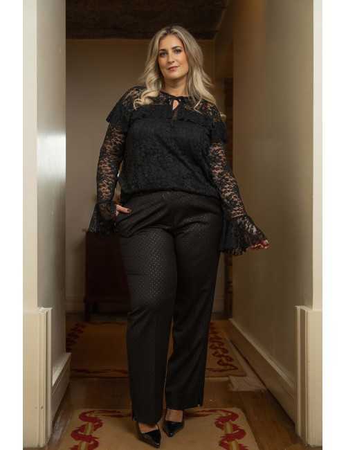 Pantalons en tissu avec imprimé en lurex, se ferme avec un bouton et une fermeture éclair et possède des poches latérales. Collection : Automne Hiver Disponible en Grandes Tailles Produit de design et fabrication propres. Nous sommes une marque de confection de vêtements avec plus de 50 ans d'expérience Modèle : Taille 1,70 m et porte la taille 46. Composition : 66% Polyester 31% Viscose 3% Élasthanne
