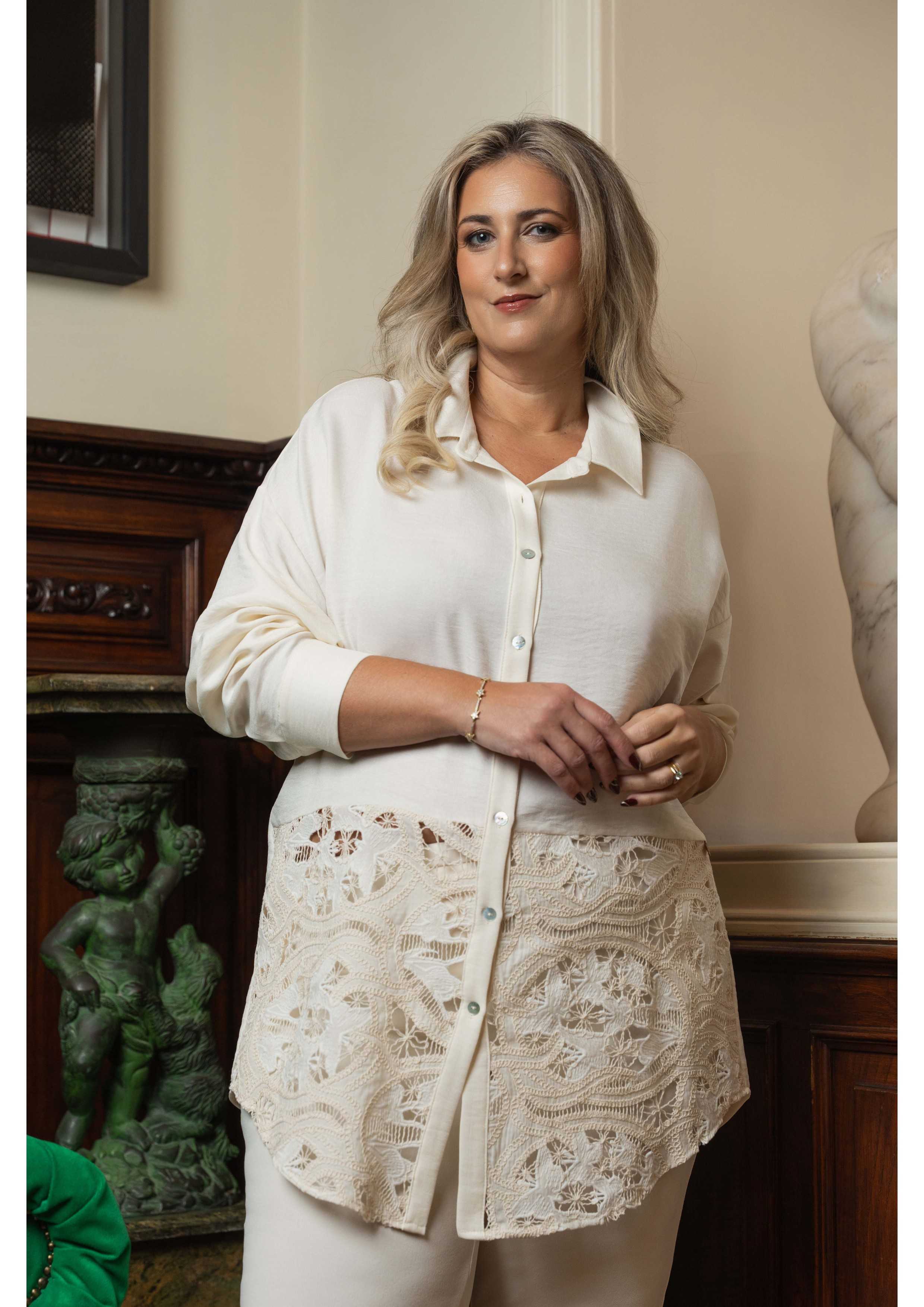 Blouse en tissu uni, empiècement avant inférieur en dentelle travaillée. Manches longues avec poignets et col chemise. Modèle : Taille 1.70m et porte la taille 2XL