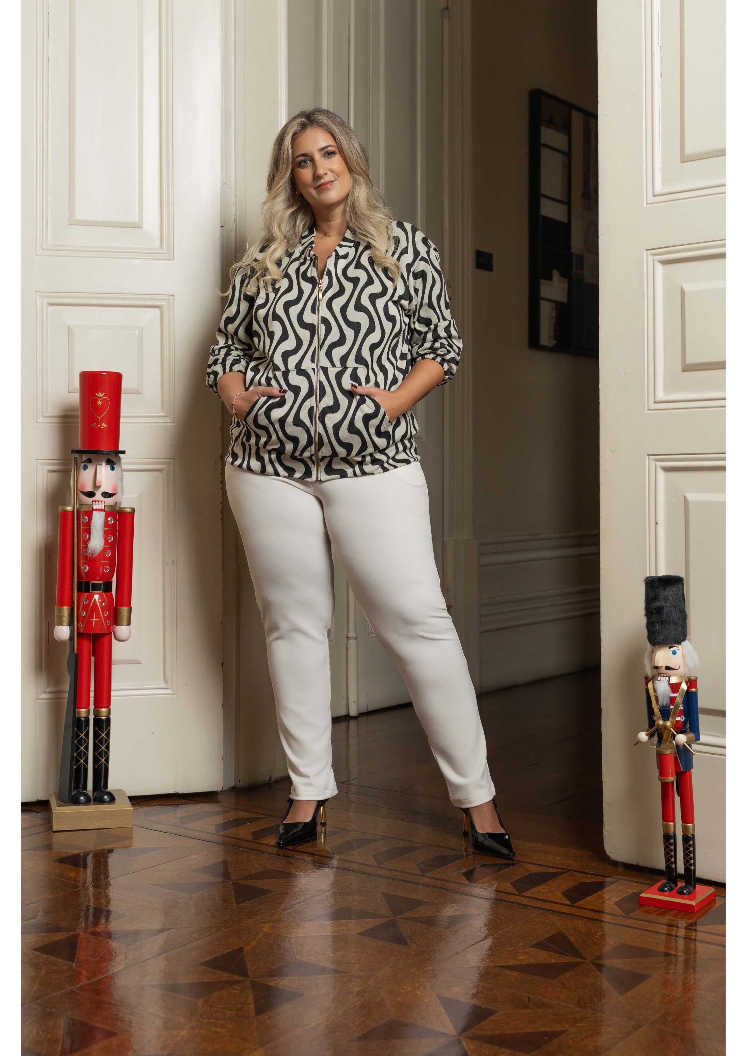 Veste en maille imprimée, modèle type "bomber". Poches kangourou, ceinture large avec élastique, manches longues avec élastique. Fermeture à l'avant.