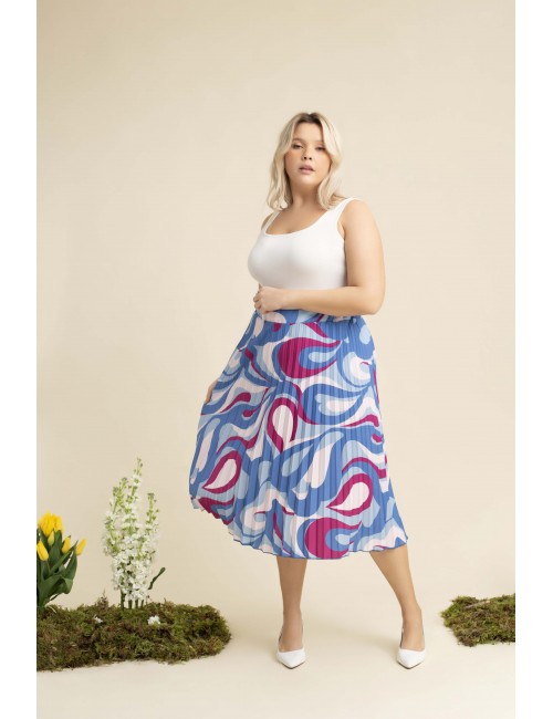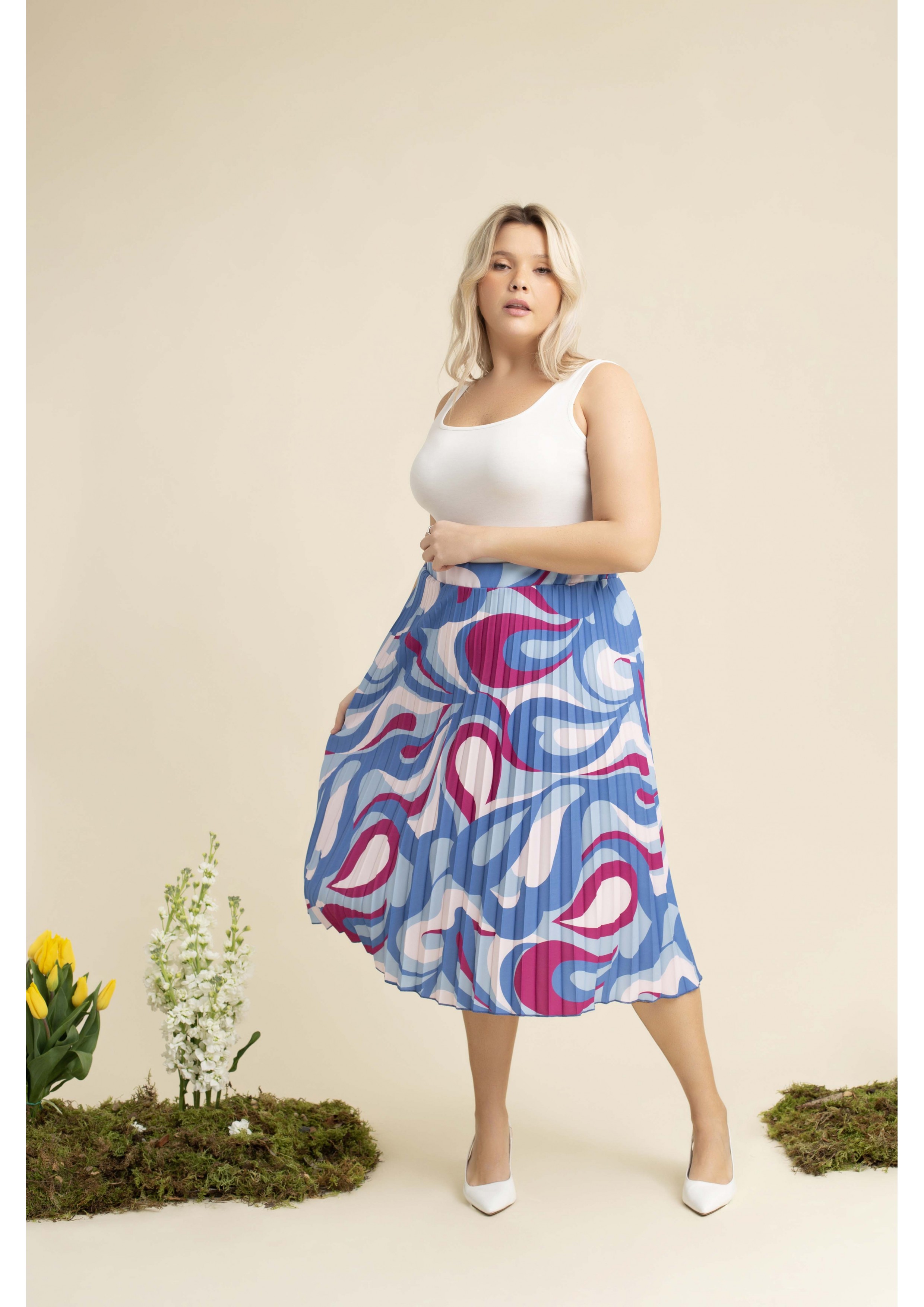 Jupe plissée sous le genou en tissu imprimé, ceinture élastique. Collection : Printemps Été Disponible en Grandes Tailles Produit de création et de fabrication propre. Nous sommes une marque de confection de vêtements avec plus de 50 ans d'expérience. Modèle : Taille 1,70 m et porte la taille 2XL. Composition : 96 % Polyester 4 % Élasthanne