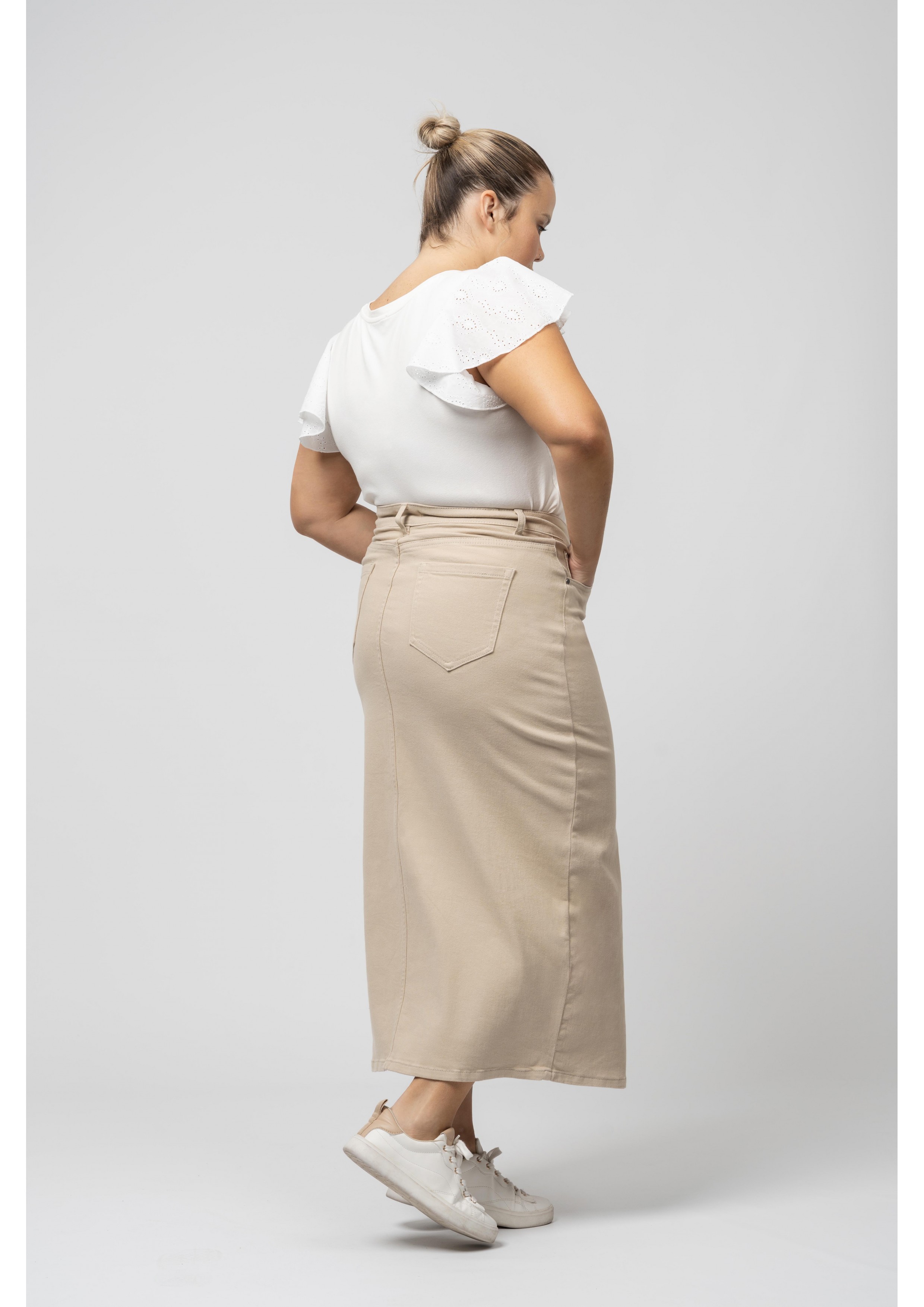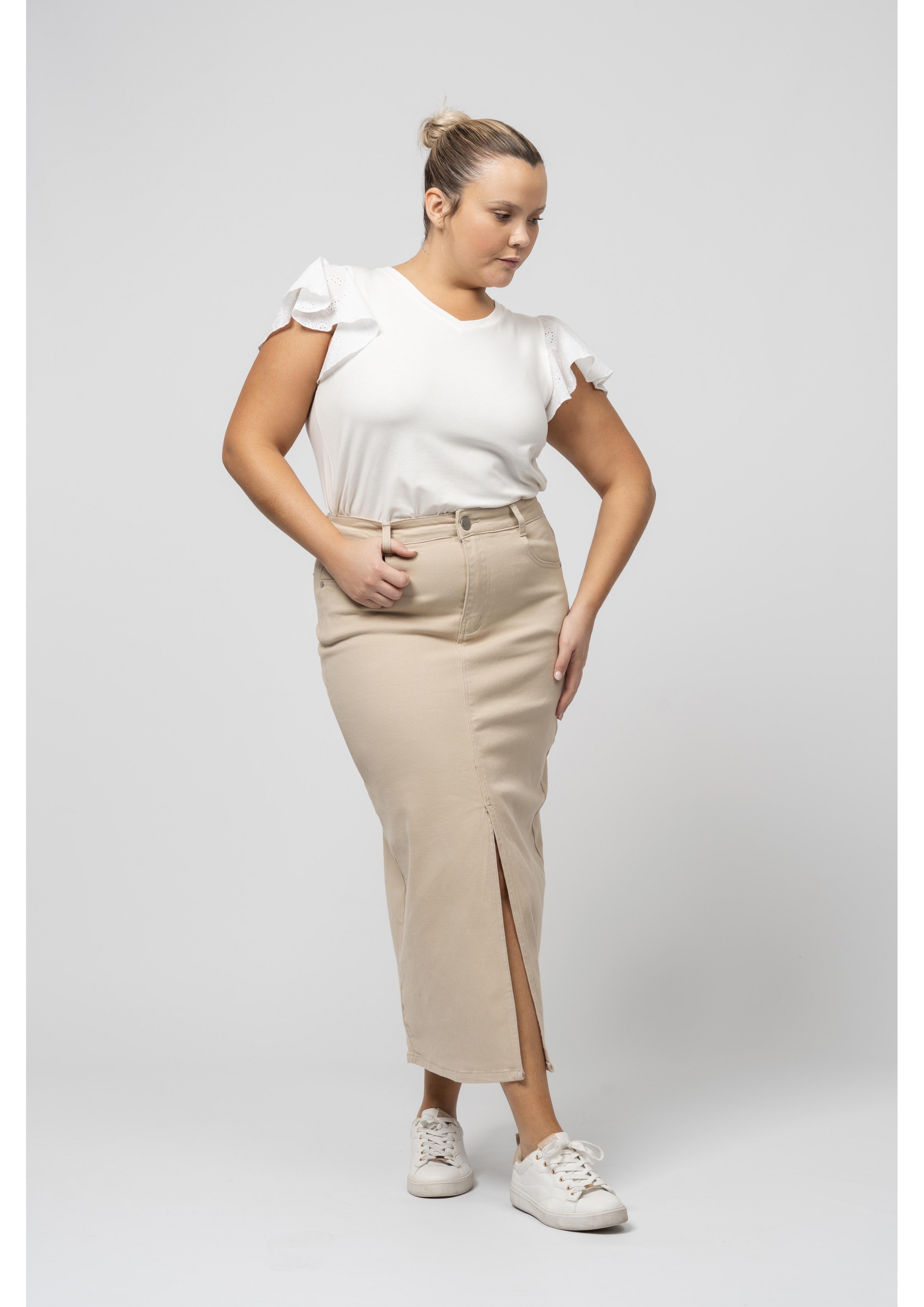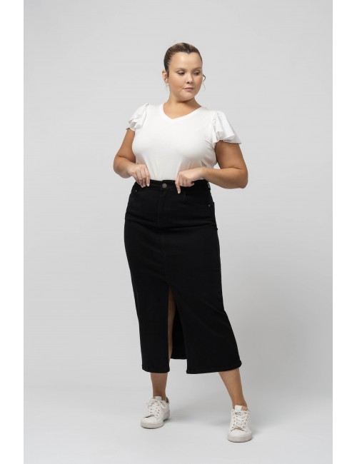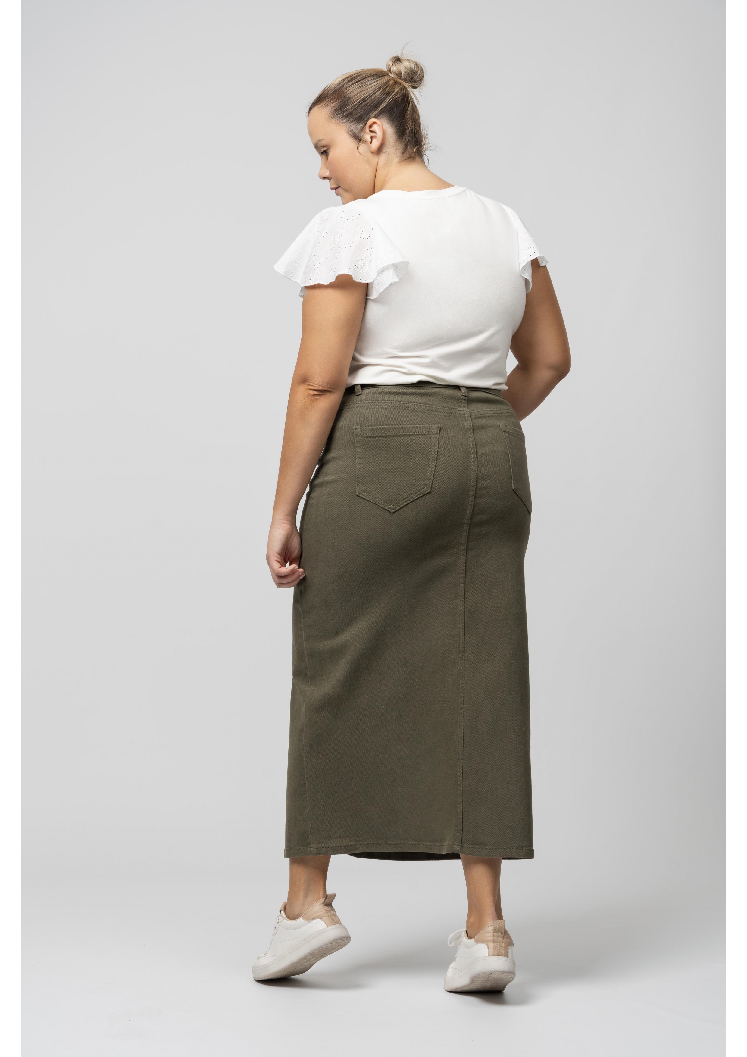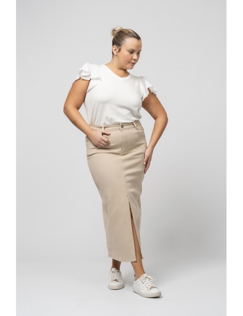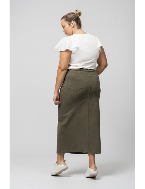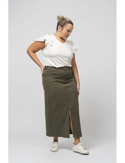 Jupe longue avec fente et poches Collection : Printemps Été Disponible en Grandes Tailles Nous sommes une marque de confection de vêtements avec plus de 50 ans d'expérience Modèle : Hauteur 1,70 m et porte la taille 2XL. Composition : 98% Coton 2% Élasthanne