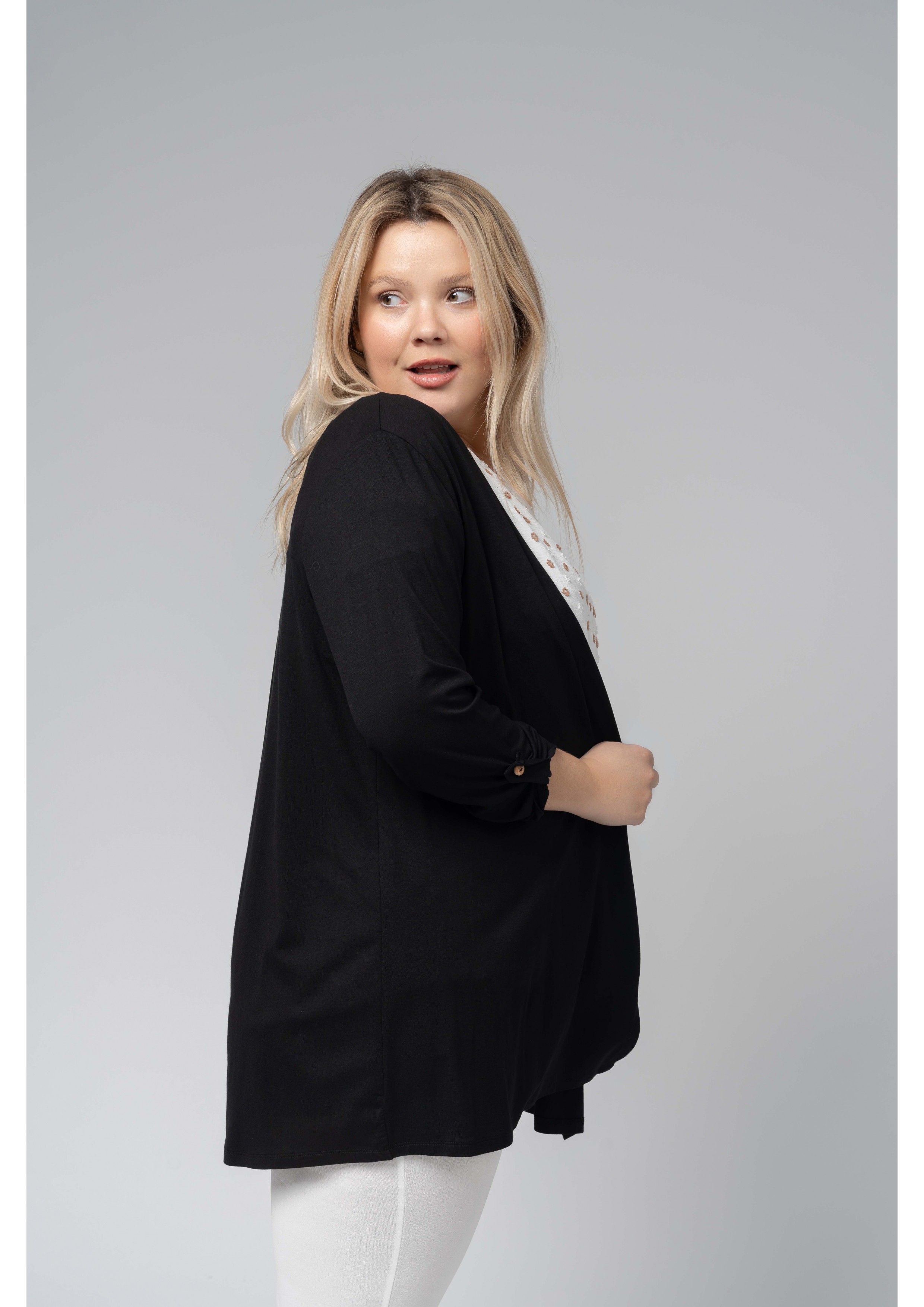 Veste en maille viscose unie avec manches 3/4. Collection : Printemps Été Modèle : Taille 1.70m et porte la taille 2XL. 94% Viscose 6% Élasthanne