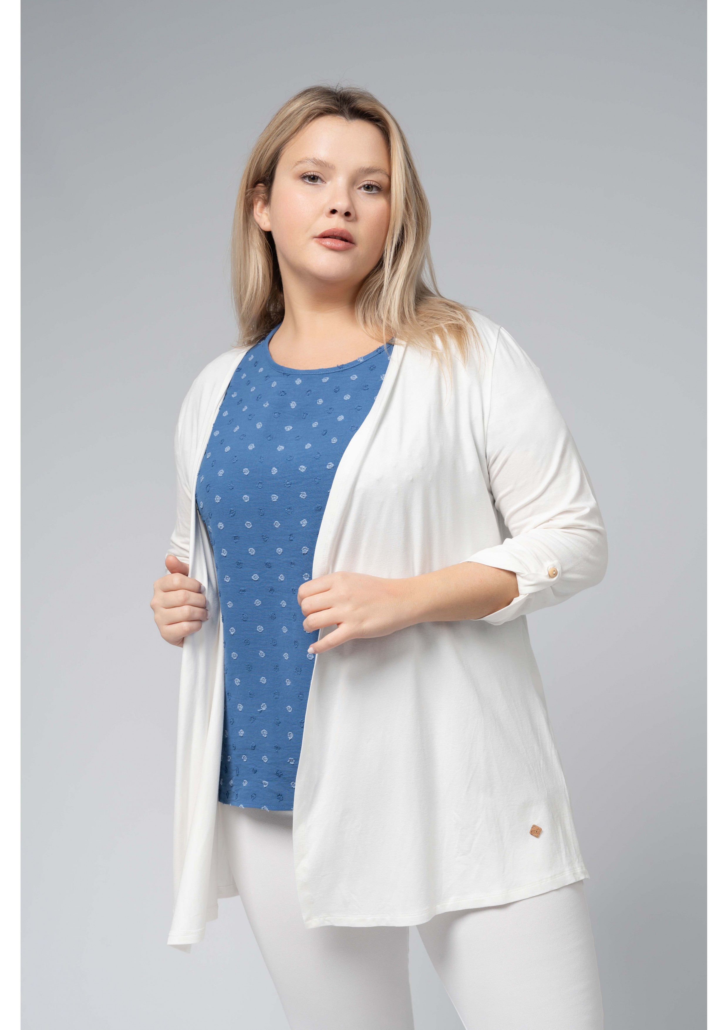 Veste en maille viscose unie avec manches 3/4. Collection : Printemps Été Disponible en Tailles Grandes Produit de conception et fabrication propres. Nous sommes une marque de confection de vêtements avec plus de 50 ans d'expérience Modèle : Taille 1.70m et porte la taille 2XL. Composition : 94% Viscose 6% Élasthanne