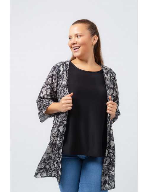 Veste en tissu imprimé, manches 3/4 avec un petit fronce vertical. Modèle ample, tombant et ouvert. Collection : Printemps Été Modèle : Hauteur 1,70 m et porte la taille 2XL.