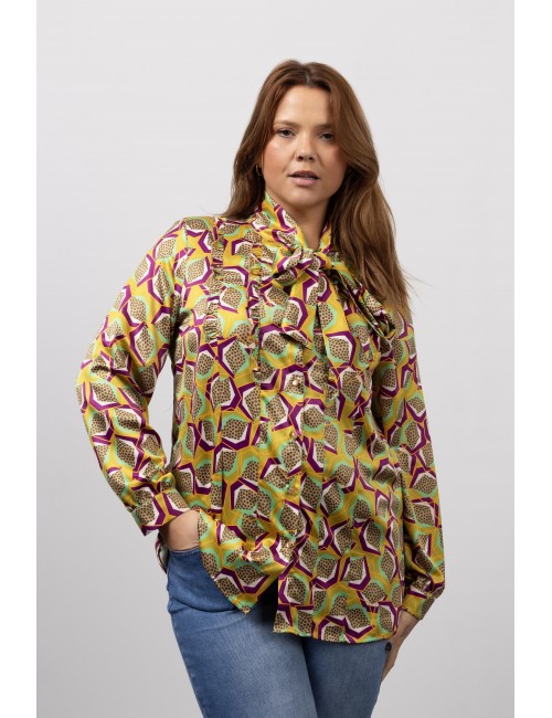 Chemisier à manches longues avec col en cravate, volants à l'avant et bouton au poignet. Collection : Automne Hiver Disponible en Grandes Tailles Produit de conception et de fabrication propre. Nous sommes une marque de confection de vêtements avec plus de 50 ans d'expérience Modèle : Taille 1.70m et porte la taille 2XL. Composition : 96% Polyester 4% Élasthanne