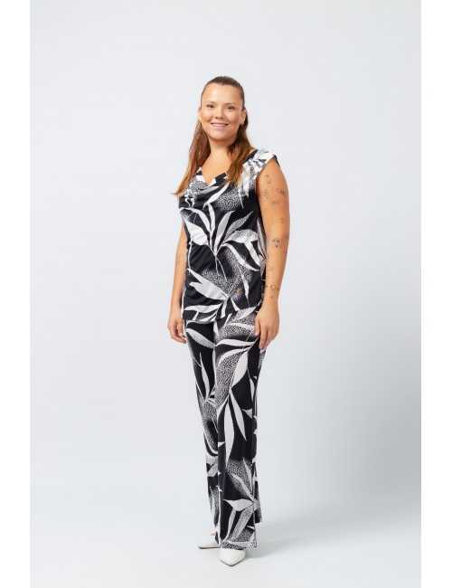 Pantalon en maille imprimée, coupe droite, élastique recouvert à la taille. Collection : Printemps Été Disponible en Grande Taille Produit de conception et fabrication propres. Nous sommes une marque de confection de vêtements avec plus de 50 ans d'expérience Modèle : Hauteur 1.70m et porte la taille XL. Composition : 94% Polyester 6% Élasthanne