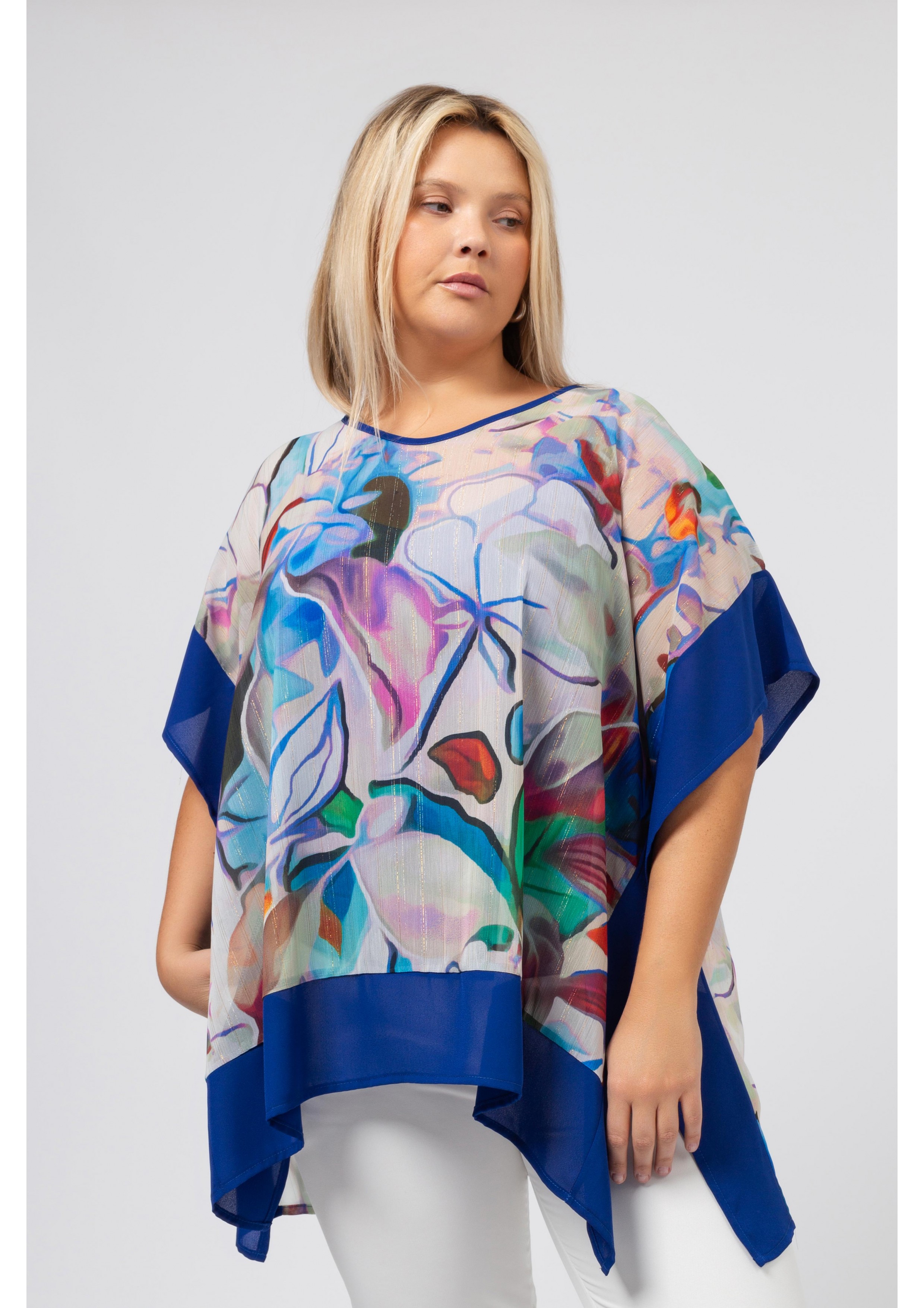 Poncho en tissu imprimé, avec top intérieur, décolleté en V, côtés ouverts. Collection : Printemps Été Modèle : Taille 1,70 m et porte la taille 2XL. Imprimé : 98% Polyester 2% Élasthanne / Uni intérieur : / Doublure :