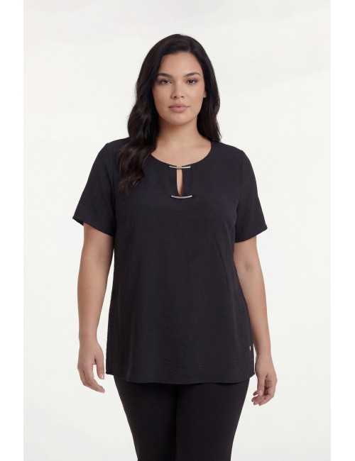 Tunique en tissu uni, col rond avec ouverture avec 2 applications à l'avant, et chapelet au dos avec mâle | Collection : Printemps Été | Modèle : Taille 1,70 m et porte la taille 2XL