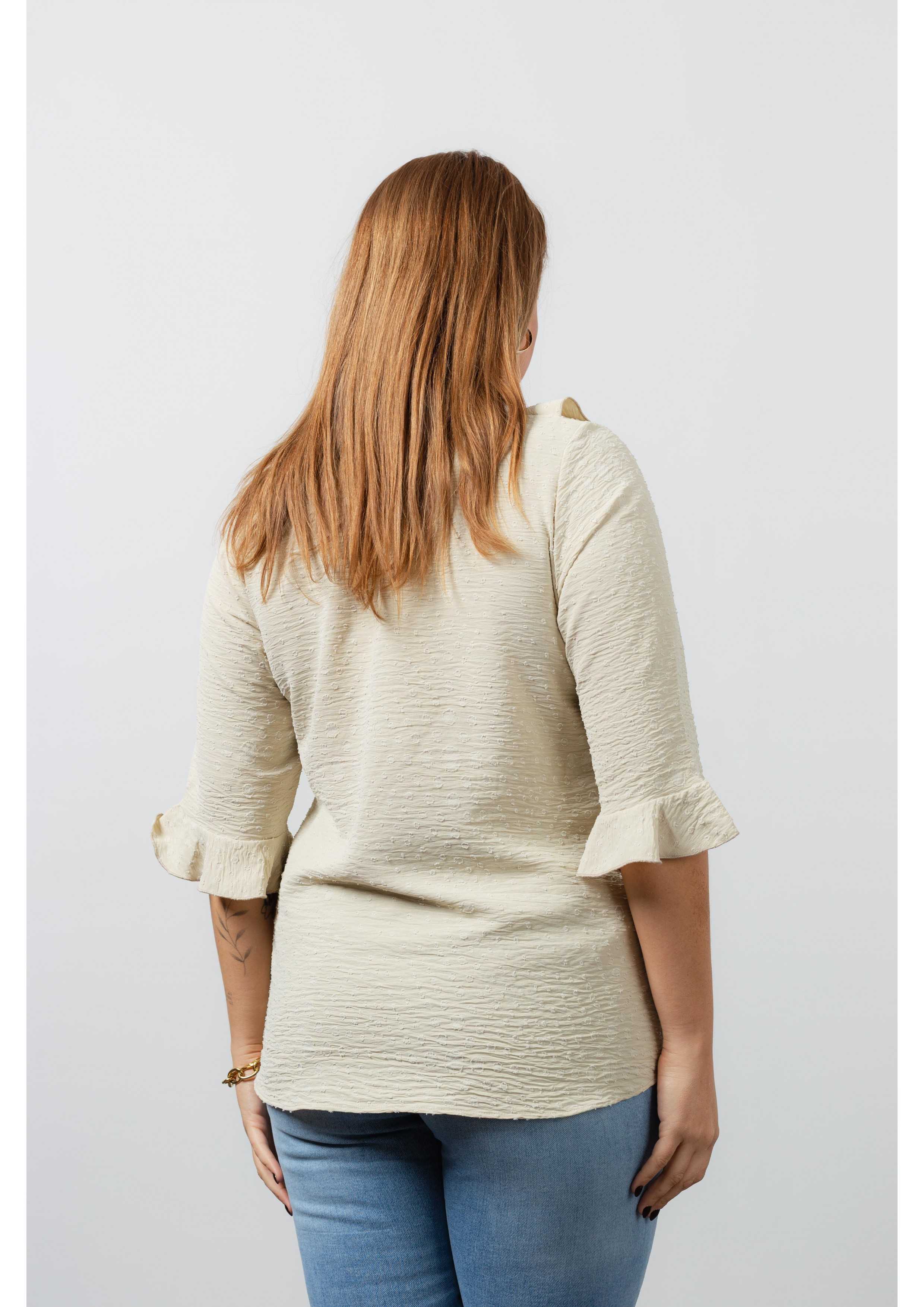 Tunique en tissu uni avec relief, décolleté en V avec volants, manches 3/4 avec volants. Finitions avec roulotté | Collection : Printemps Été | Modèle : Taille 1,70m et porte du 2XL
