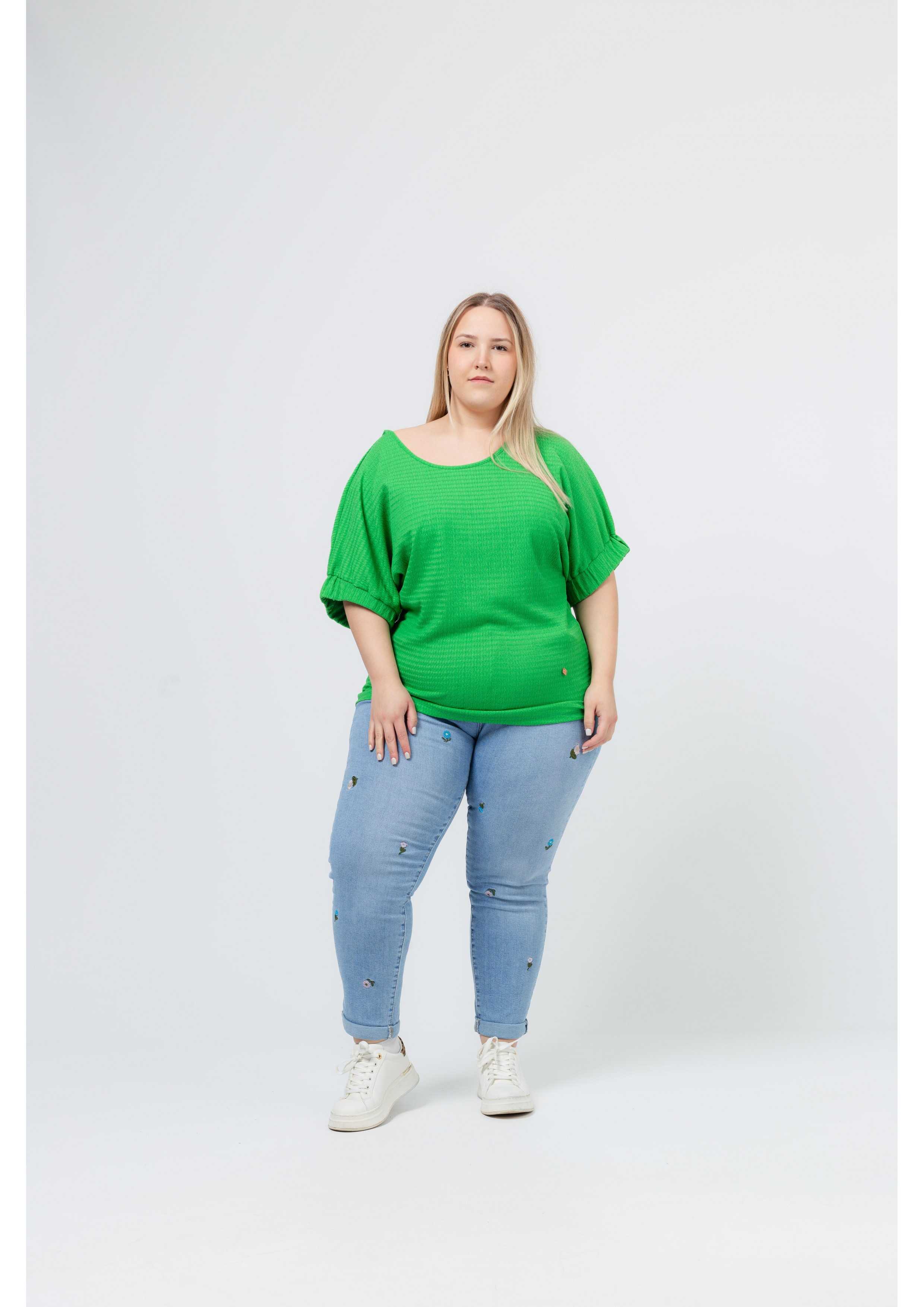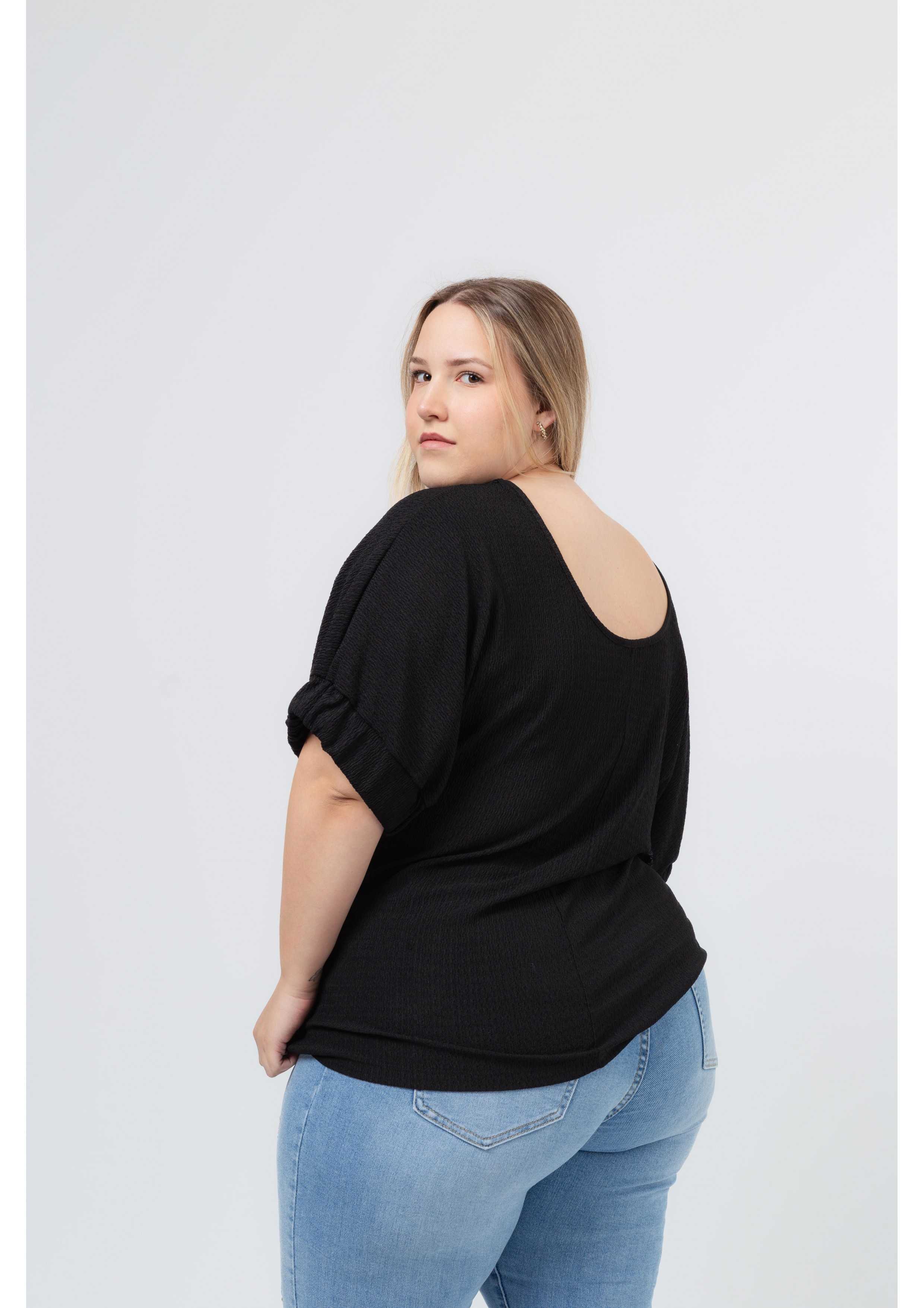 Tunique en maille lisse, avec relief, encolure ronde et fond devant et au dos. Manches chauve-souris avec poignet haut élastique | Collection : Printemps Été | Modèle : Taille 1,70m et porte la taille 2XL