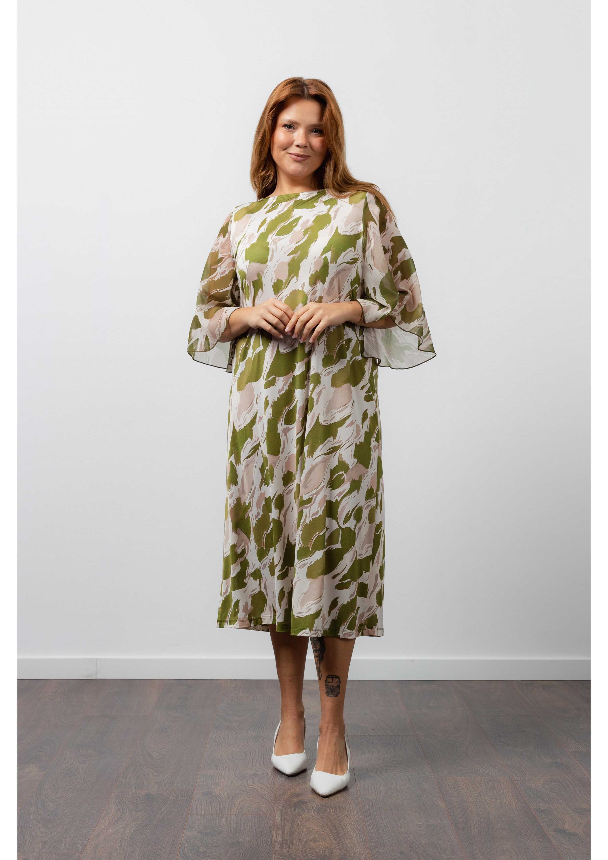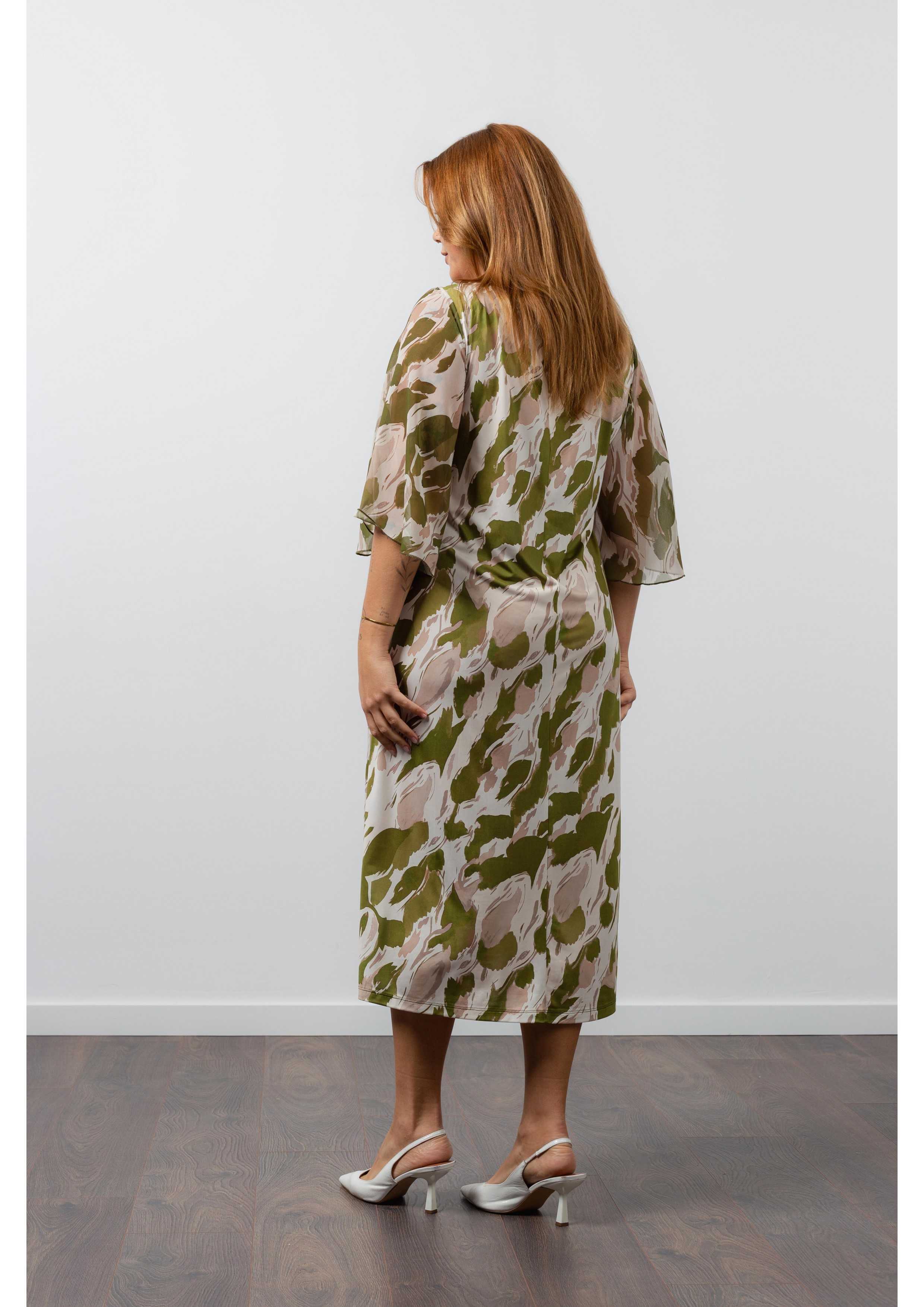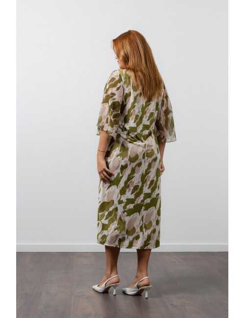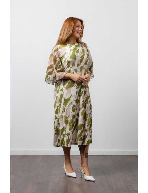 Robe en maille imprimée, coupe droite, col rond. Manches en tissu fin type cloche. Collection : Printemps Été Disponible en Grandes Tailles Produit de conception et fabrication propre. Nous sommes une marque de confection de vêtements avec plus de 50 ans d'expérience Modèle : Taille 1,70m et porte la taille XL. Composition : 95% Polyester 5% Élasthanne | 100% Polyester