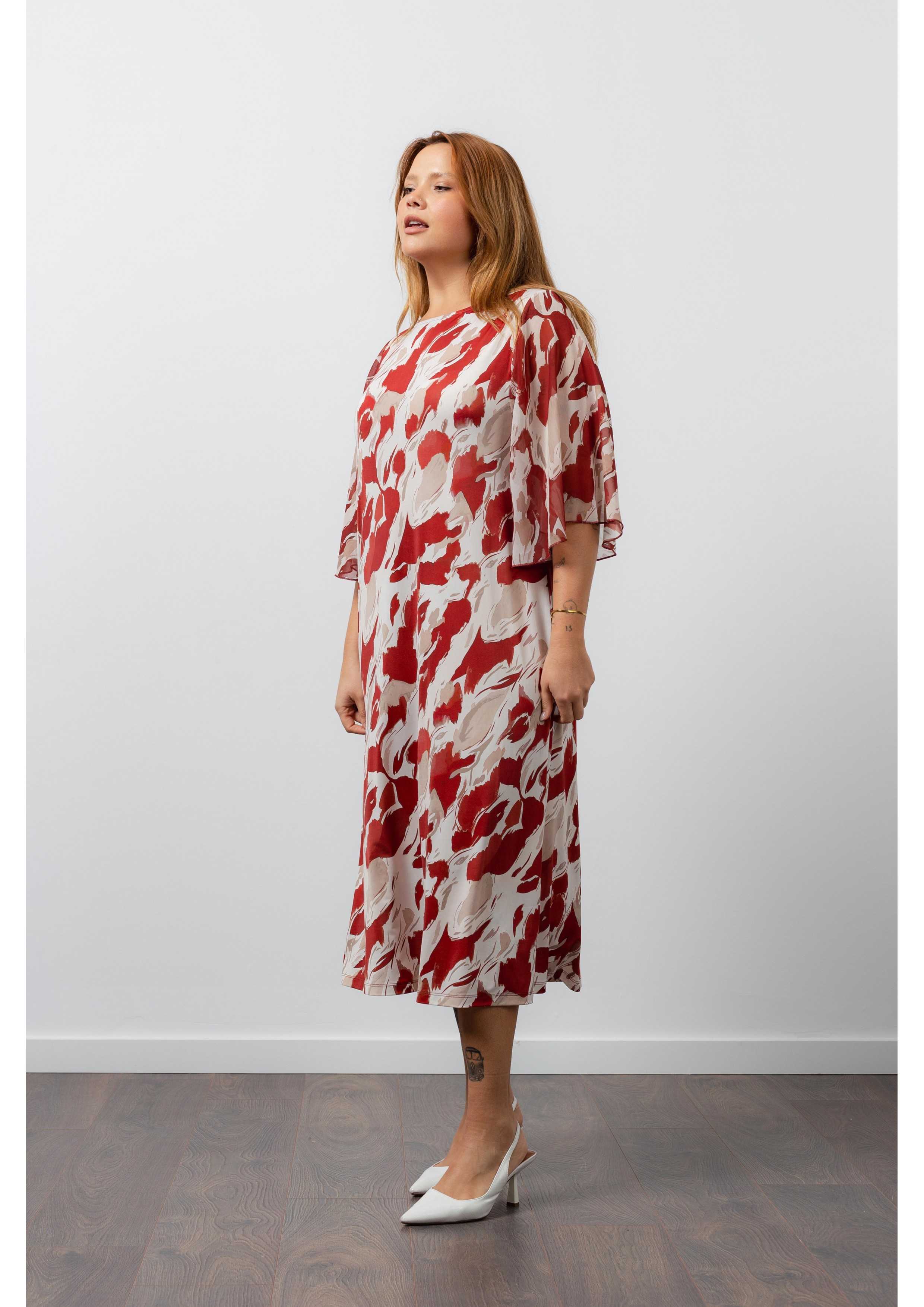 Robe en maille imprimée, coupe droite, col rond. Manches en tissu fin type cloche. Collection : Printemps Été Modèle : Taille 1,70m et porte la taille XL.