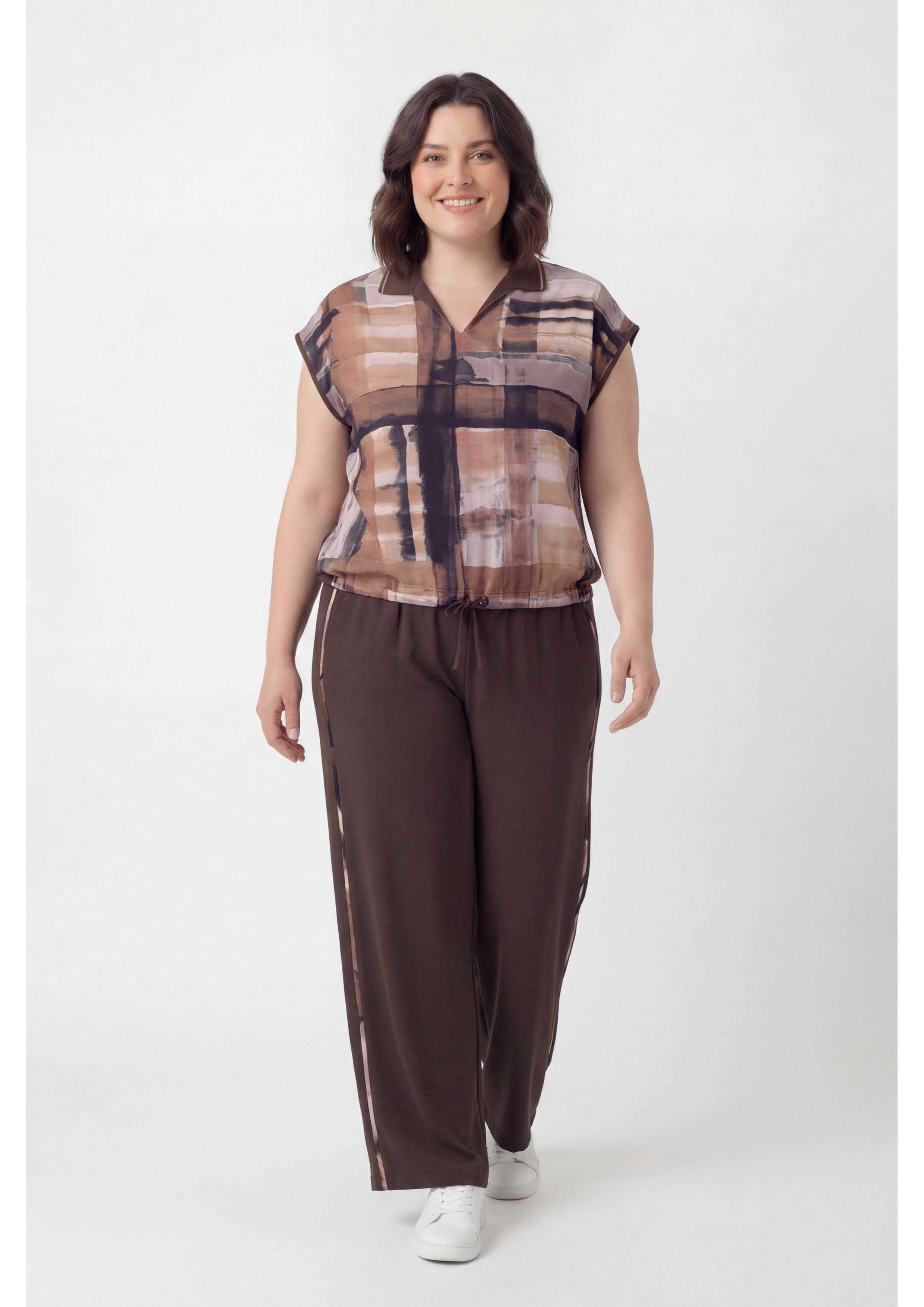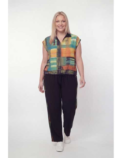 Ensemble en tissu uni et imprimé. Pantalon uni avec bande latérale imprimée, poches et élastique à la taille, tunique sans manches avec devant imprimé type polo, base avec cordon et embouts métalliques. Disponible en Grandes Tailles Produit de conception et fabrication propre. Nous sommes une marque de confection de vêtements avec plus de 50 ans d'expérience