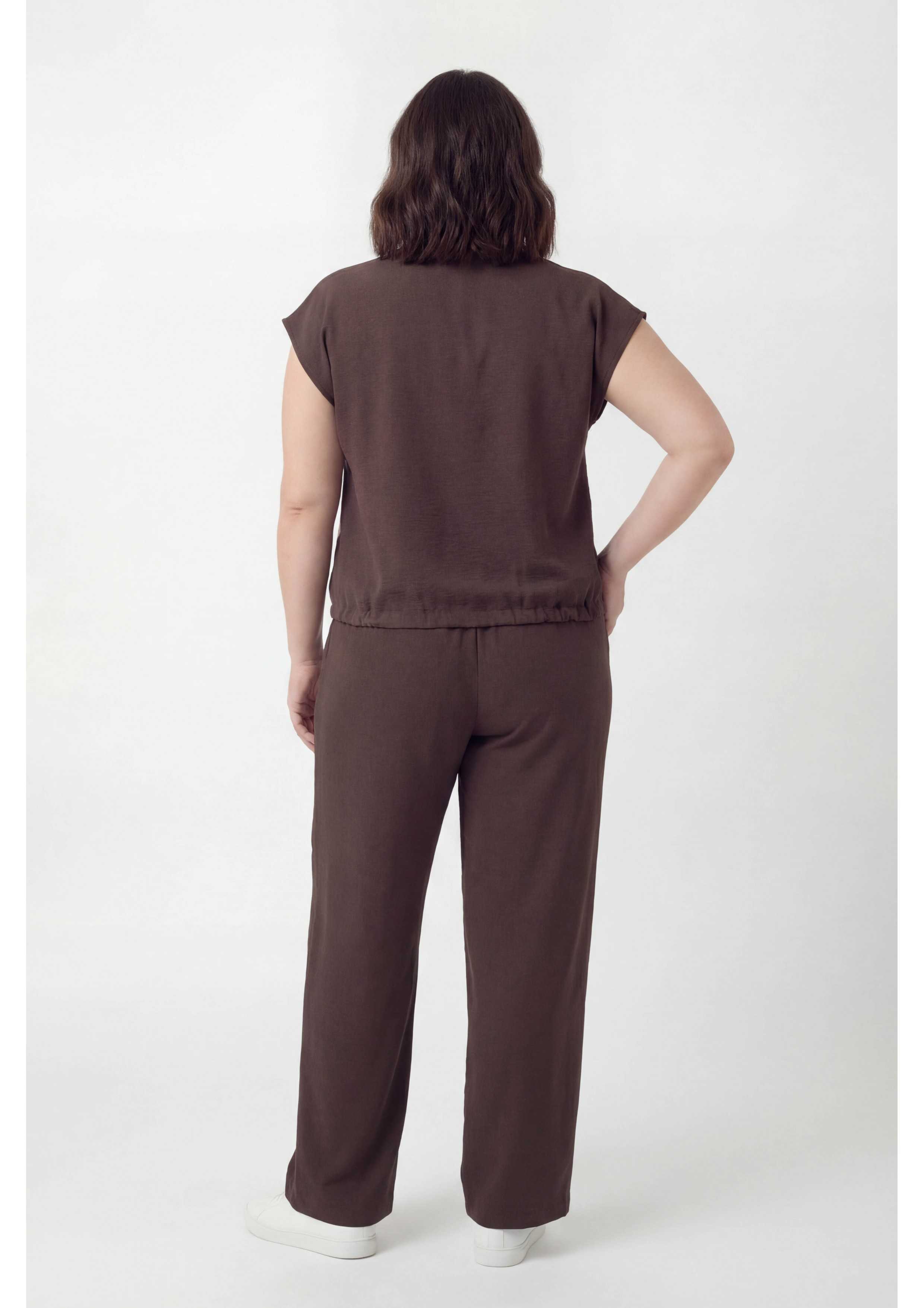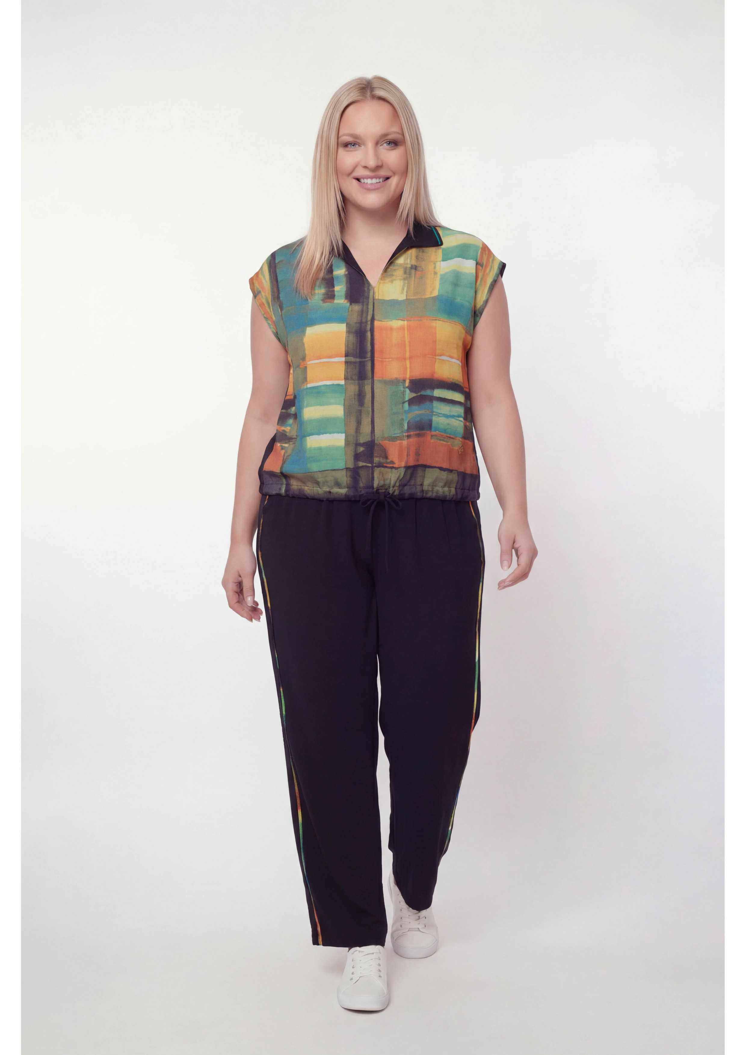 Ensemble en tissu uni et imprimé. Pantalon uni avec bande latérale imprimée, poches et élastique à la taille, tunique sans manches avec devant imprimé type polo, base avec cordon et embouts métalliques.
