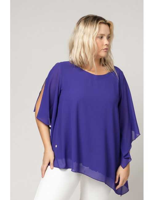 Tunique en tissu uni fluide, manches 3/4 avec fente, légèrement évasée avec pointe latérale | Collection : Printemps Été | Modèle 1 : Taille 1,67 m et porte la taille G en violet | Modèle 2 : Taille 1,70 m et porte la taille 2XL
