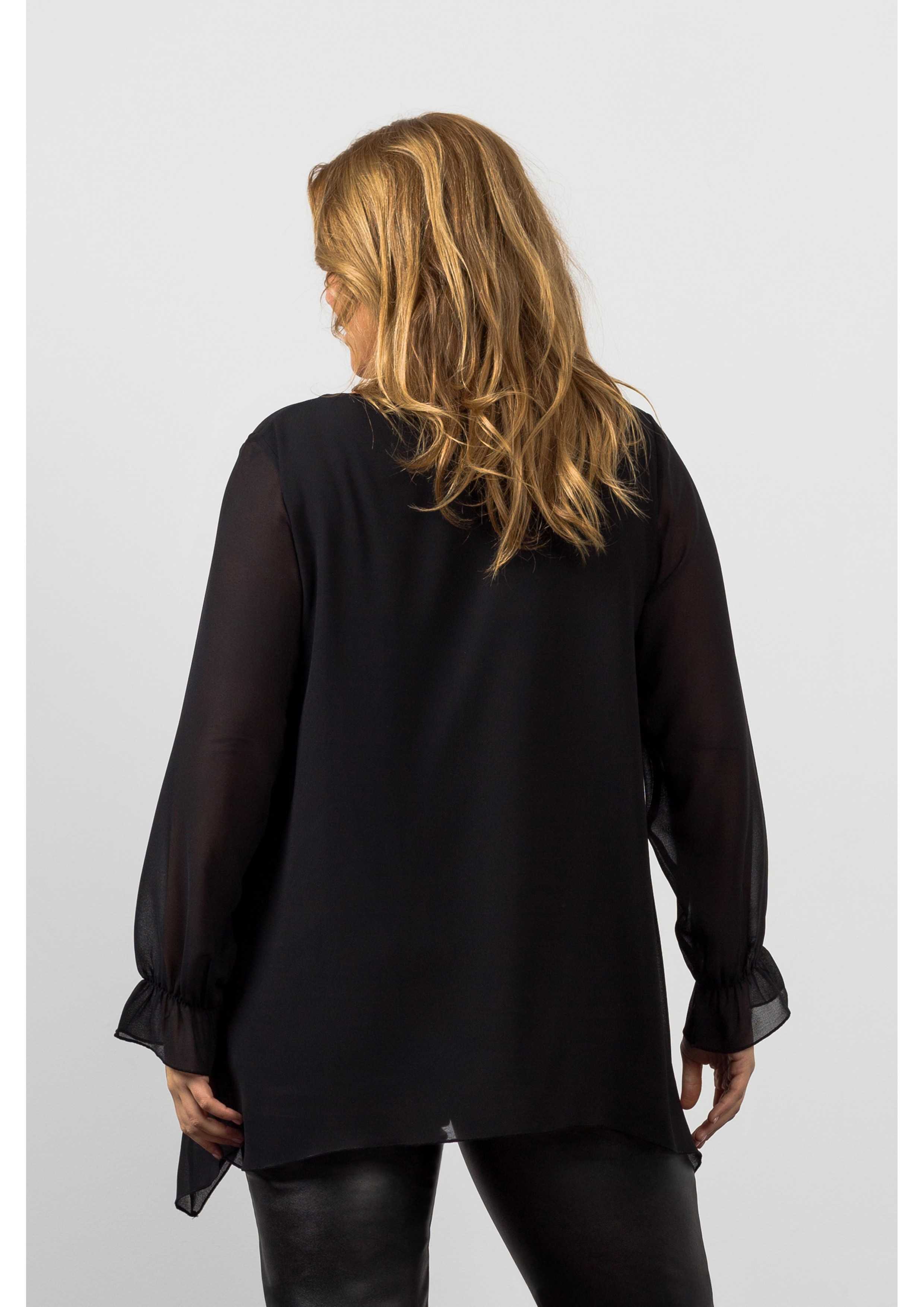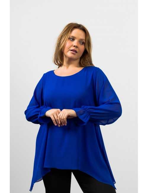 Tunique en tissu uni, fin. Modèle évasé avec des pointes latérales, manches longues avec élastique. Finitions en rouleau | Collection : Printemps Été | Modèle 1 : (Taille 1,67m) et porte la taille 5XL, en rouge | Modèle 2 : (Taille 1,70m) et porte la taille 2XL, en noir et bleu marine