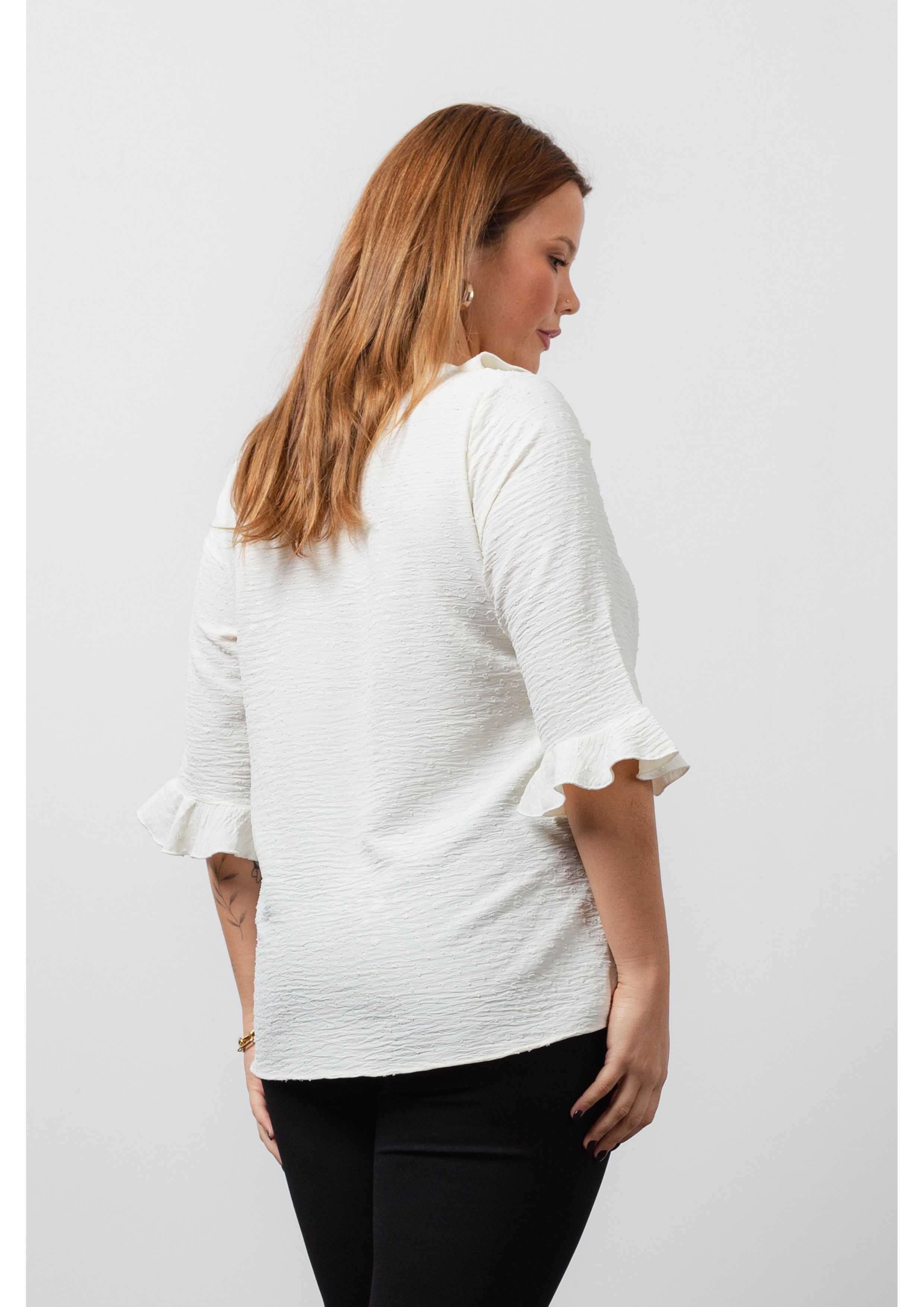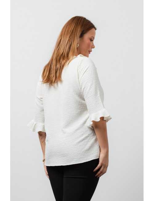 Tunique en tissu uni avec relief, décolleté en V avec volants, manches 3/4 avec volants. Finitions avec roulotté | Collection : Printemps Été | Modèle : Taille 1,70m et porte du 2XL