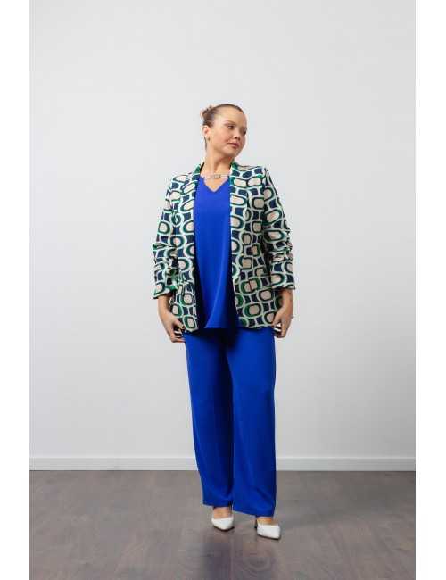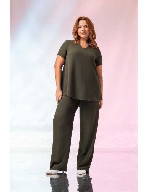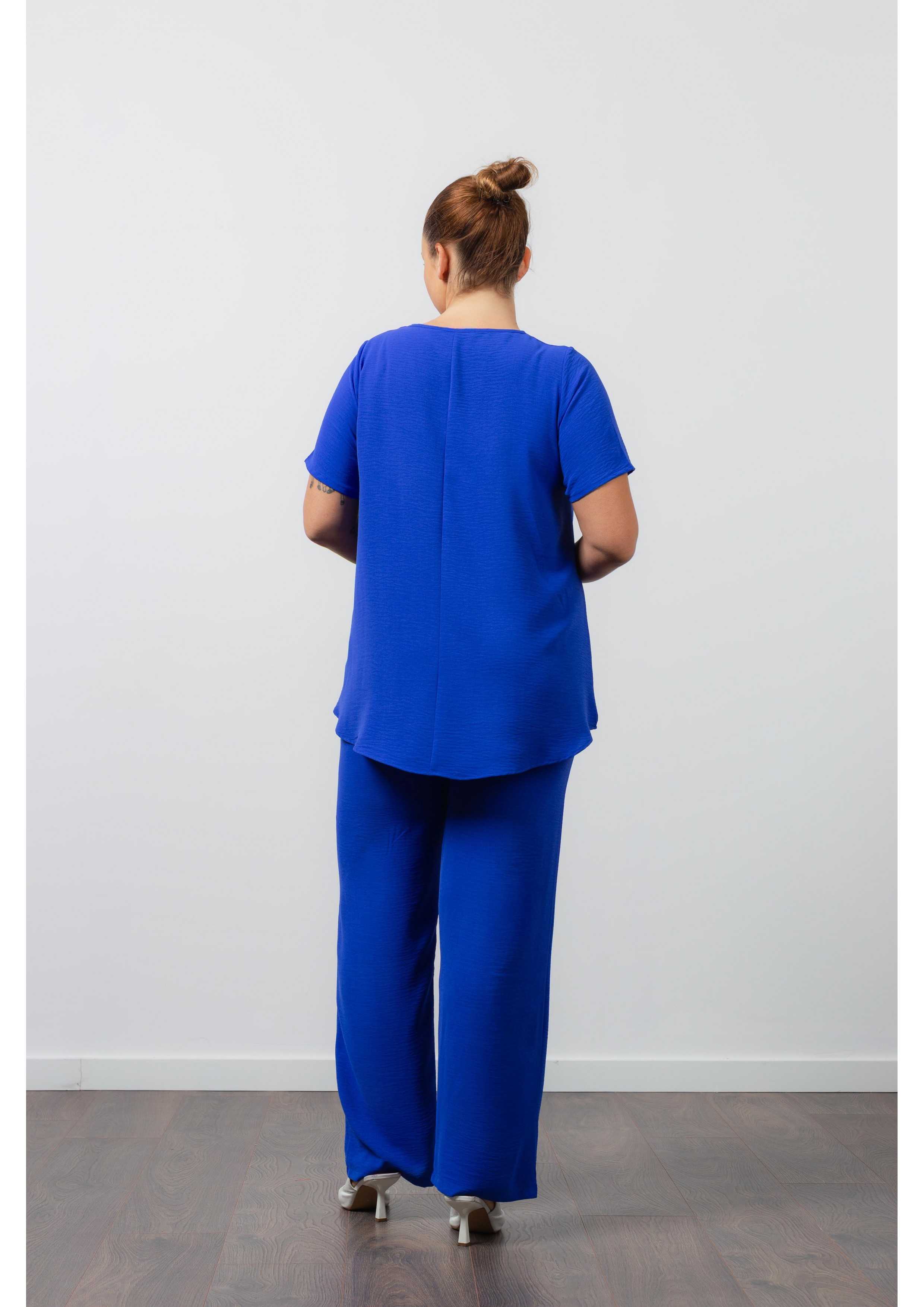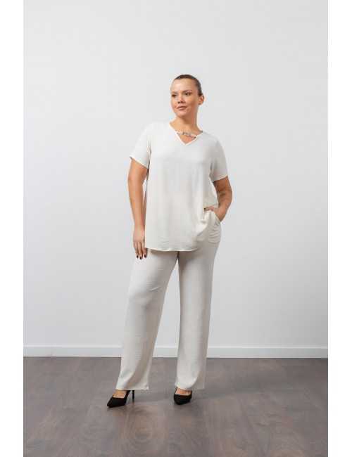 Ensemble en tissu uni, haut à manches courtes évasé décolleté en V avec application d'anneaux. Pantalon avec poches latérales et élastique à la taille | Collection : Printemps Été | Modèle : Hauteur 1,70 m et porte la taille XL