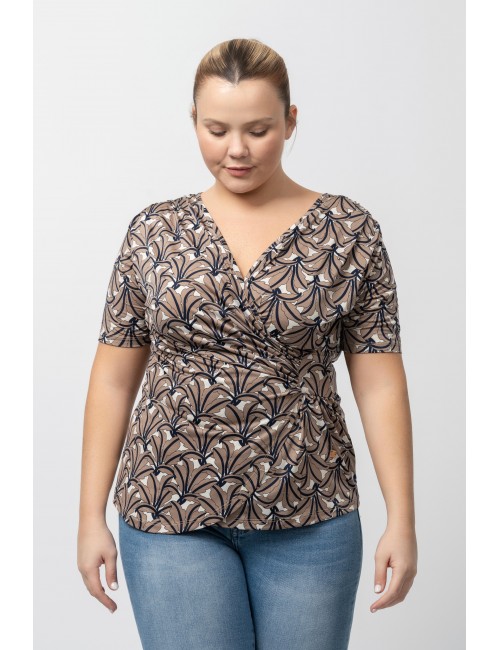 Pull en maille imprimée avec décolleté croisé. Collection : Printemps Été Disponible en Grandes Tailles Produit de conception et fabrication propres. Nous sommes une marque de confection de vêtements avec plus de 50 ans d'expérience Modèle : Taille 1,70 m et porte la taille 2XL. Composition : 94 % Polyester 6 % Élasthanne