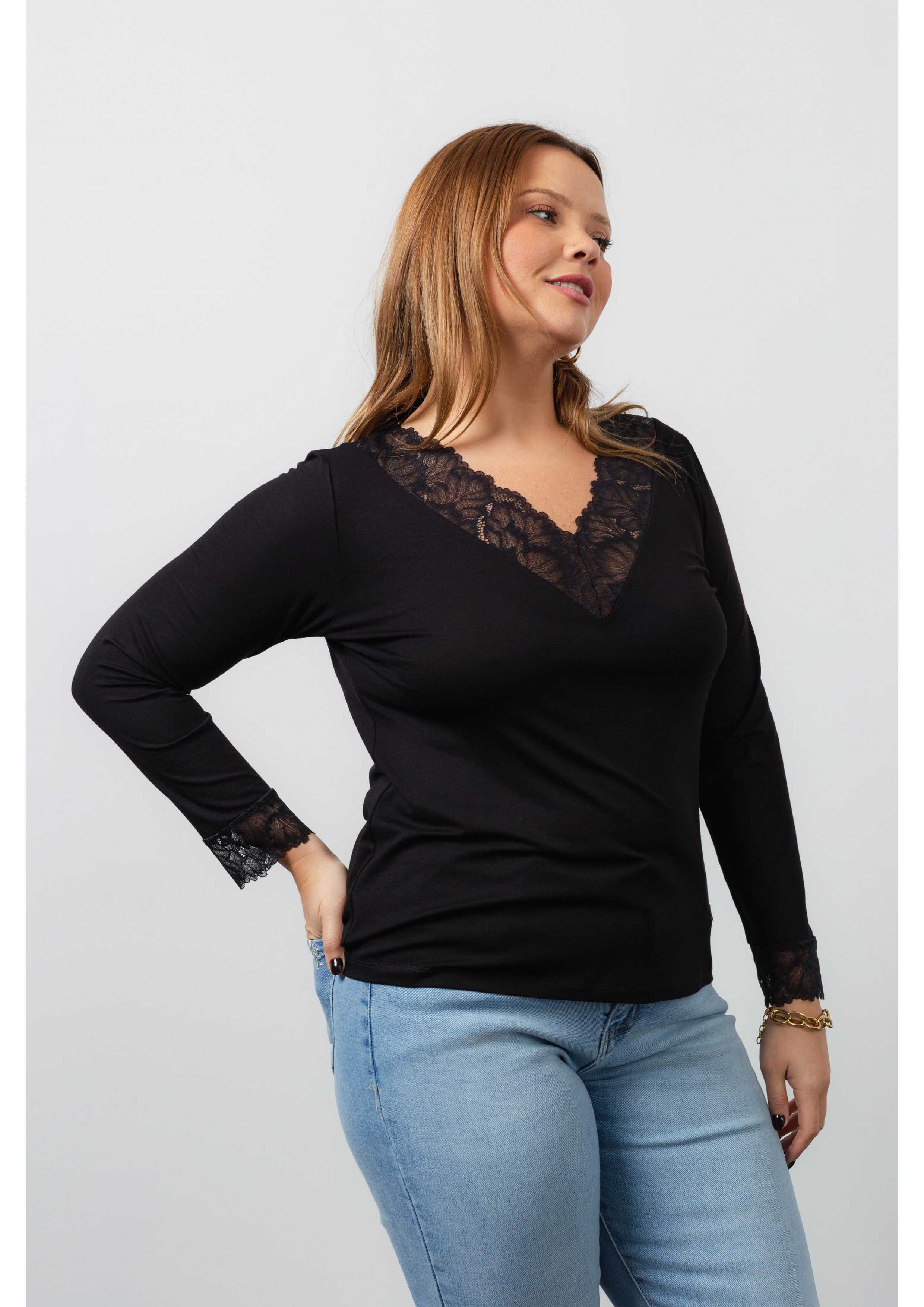 Pull en maille unie, avec de la dentelle au col en V et au bas des manches. Collection : Automne Hiver Disponible en Grandes Tailles Produit de conception et de fabrication propres. Nous sommes une marque de confection de vêtements avec plus de 50 ans d'expérience Modèle : Taille 1,70 m et porte la taille 2XL. Composition : 94 % Viscose 6 % Élasthanne