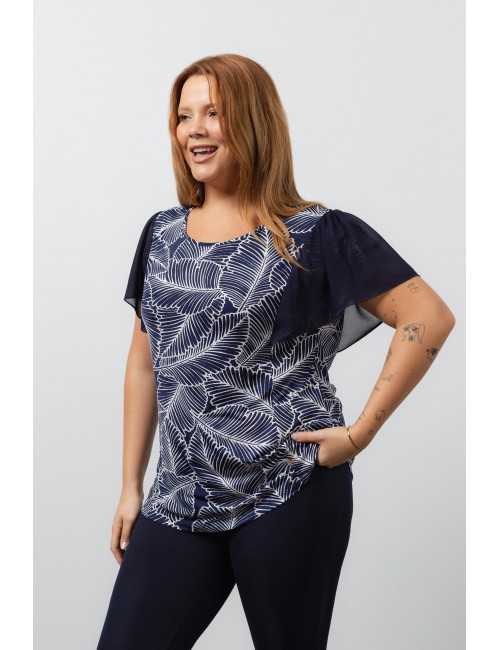 T-shirt en maille imprimée, manches courtes, col rond, avec un volant superposé sur les manches en tissu fin lisse marine avec finition roulottée. Collection : Printemps Été Modèle : Taille 1,70 m et porte la taille XL.
