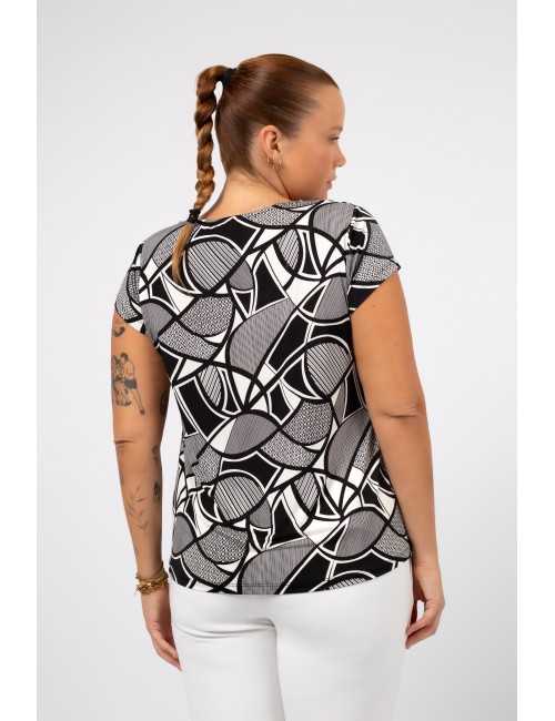 Pull en maille imprimée, manches courtes, col rond. Découpe sur l'épaule avec application métallique. Modèle à coupe droite. Collection : Printemps Été Disponible en Tailles Plus Produit de conception et de fabrication propres. Nous sommes une marque de confection de vêtements avec plus de 50 ans d'expérience Modèle : Taille 1,70 m et porte la taille XL. Composition : 94% Polyester 6% Élasthanne