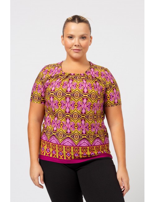 T-shirt en maille imprimée avec un ourlet en bas, manches courtes et décolleté rond avec des plis. Collection : Printemps Été Disponible en Grandes Tailles Produit de conception et de fabrication propre. Nous sommes une marque de confection de vêtements avec plus de 50 ans d'expérience Modèle : Taille 1,70 m et porte la taille 2XL. Composition : 95% Polyester 5% Élasthanne