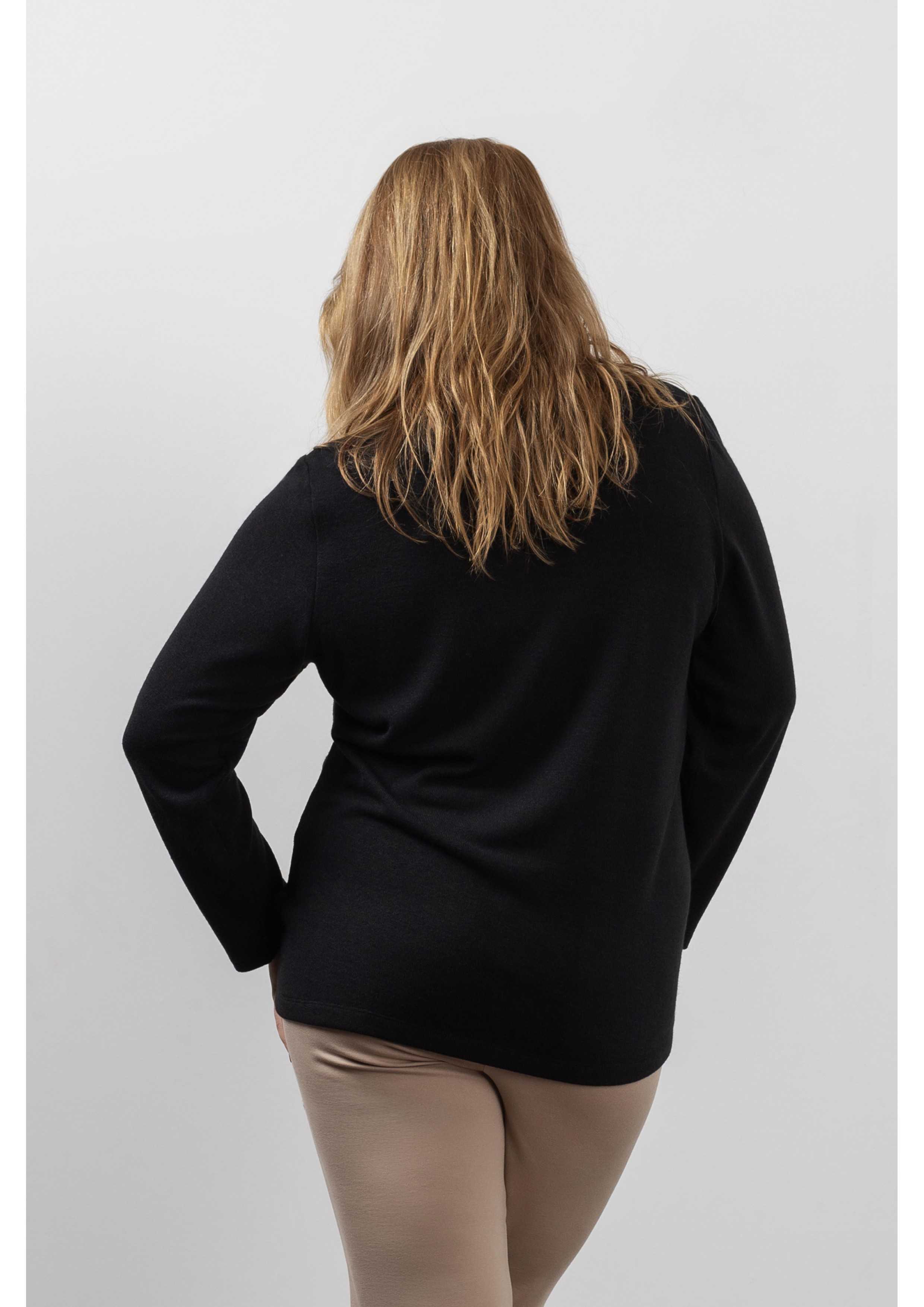 Pull en maille unie noire, manches longues, décolleté rond avec empiècement et 2 boutons façon. Collection : Automne Hiver Modèle : Taille 1.70m et porte la taille 2XL.